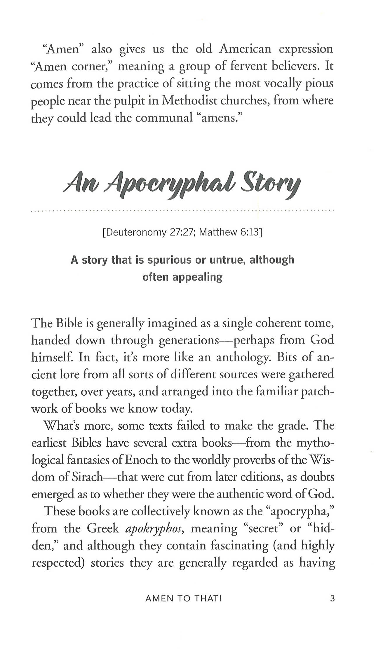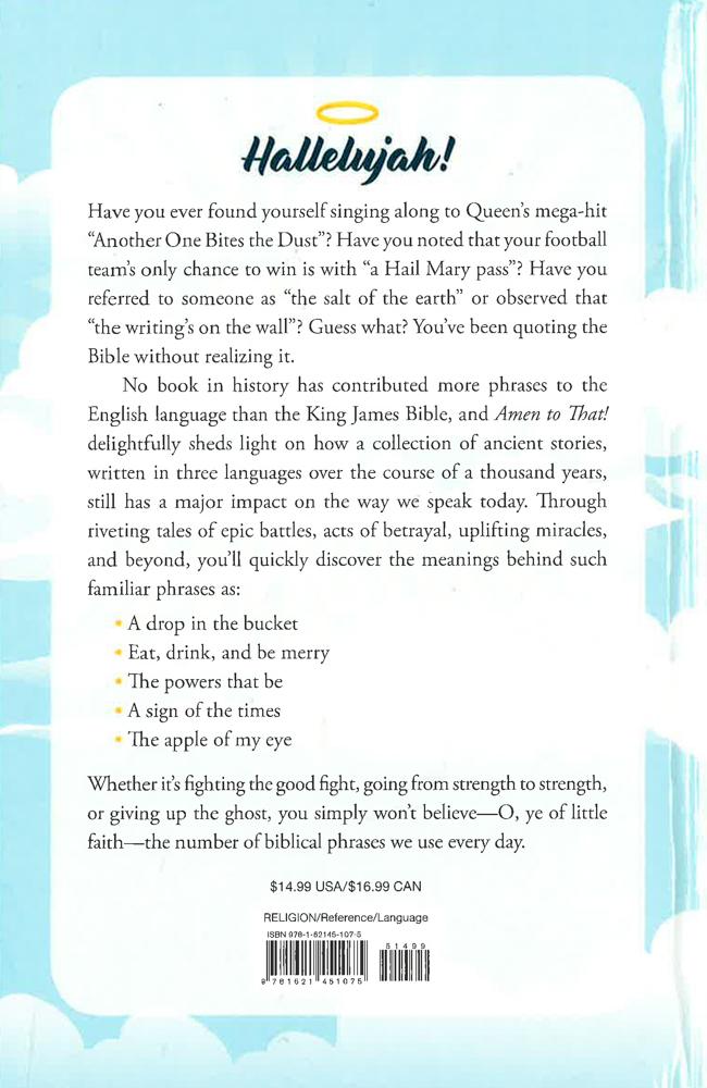 Many of us have never read or studied the Bible, yet people have been quoting from its pages for centuries, not knowing the origin or significance of these timeless expressions. Let there be light! Amen to That will delightfully shed clarity on how a collection of ancient stories, written in three languages over the course of a thousand years, has had such an impact on the way we speak today. Through intriguing stories and riveting tales of epic battles and acts of betrayal to miracles and beyond, you?ll quickly discover the meanings behind such familiar phrases as. *The book may have remainder mark