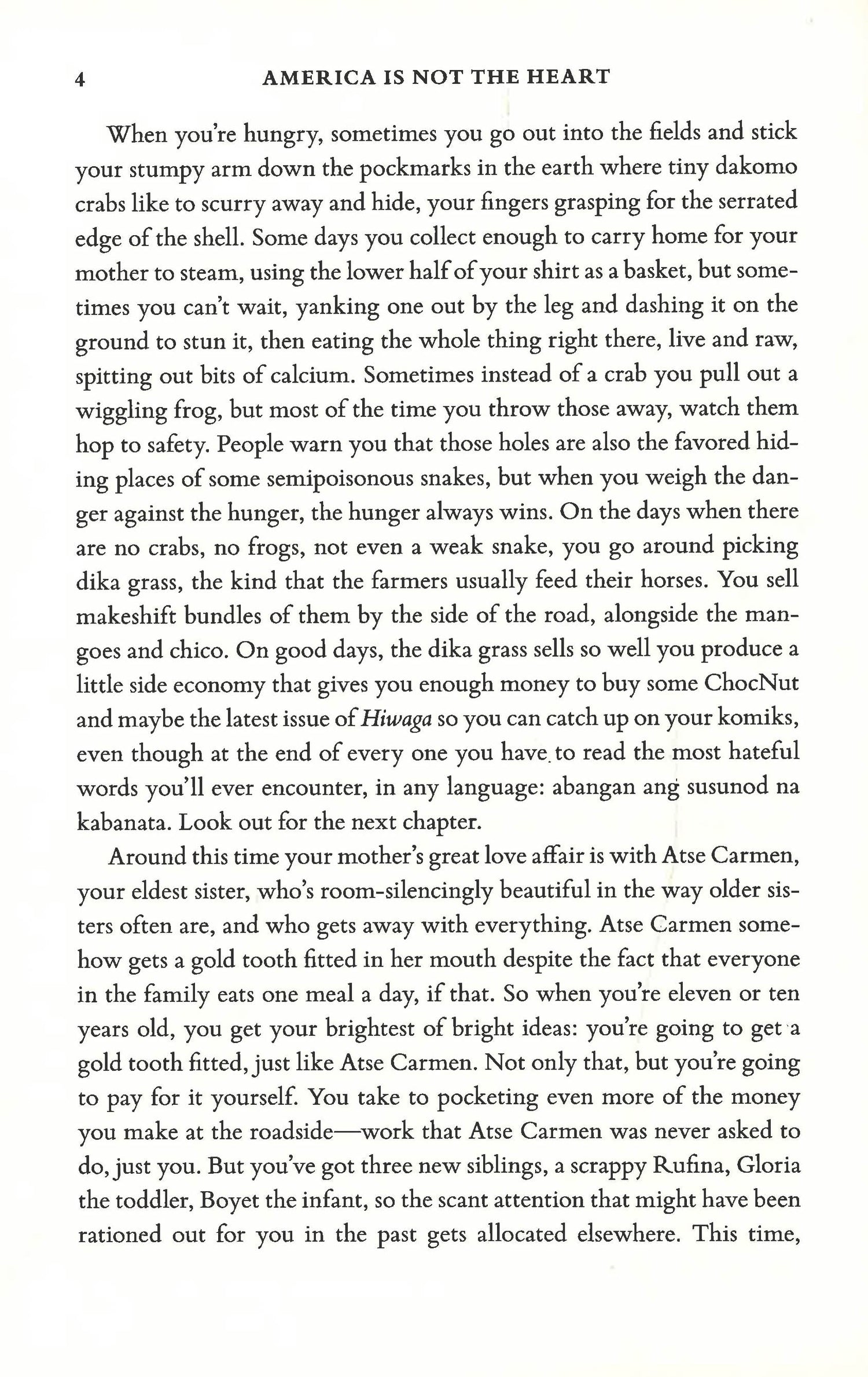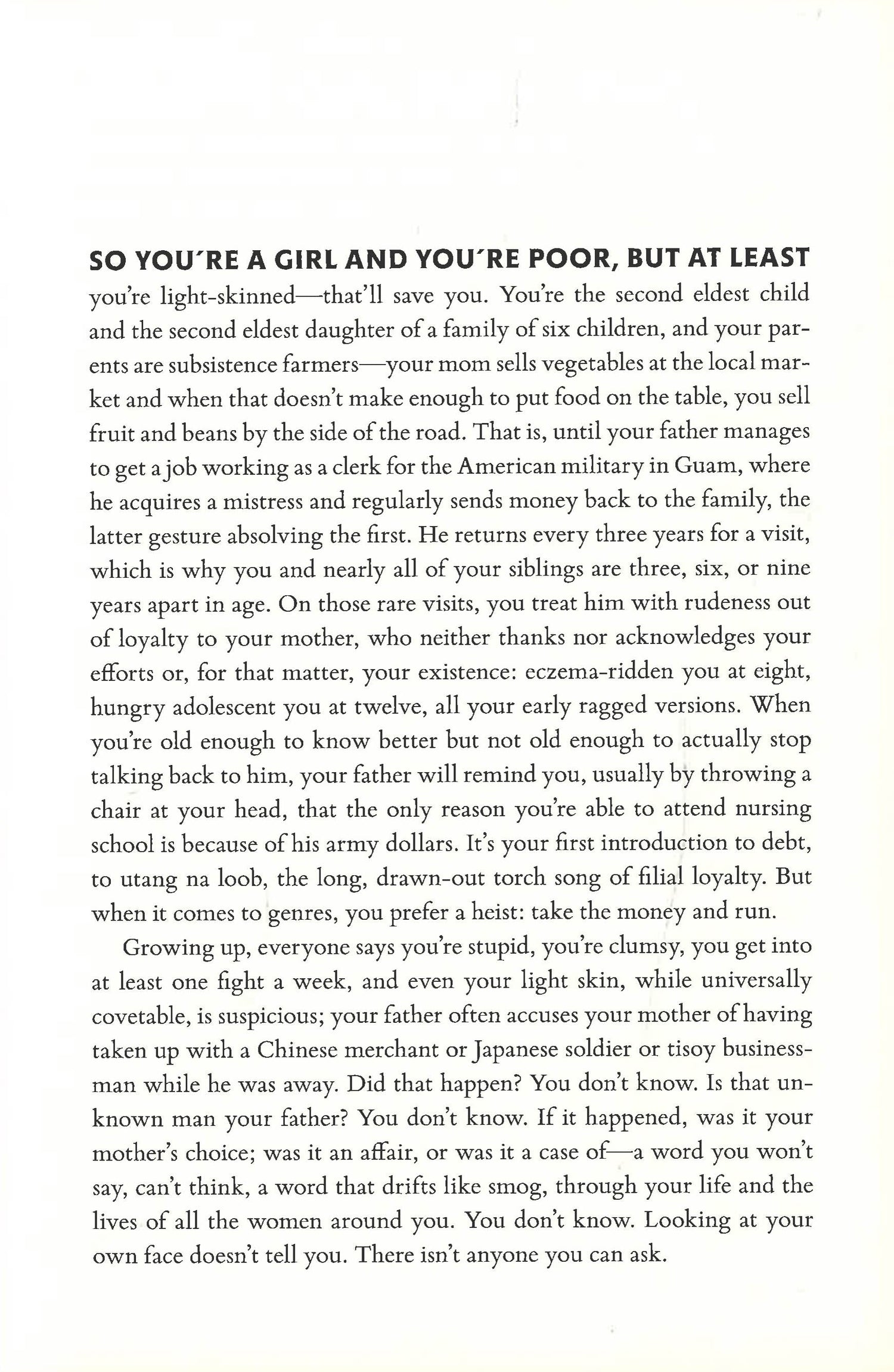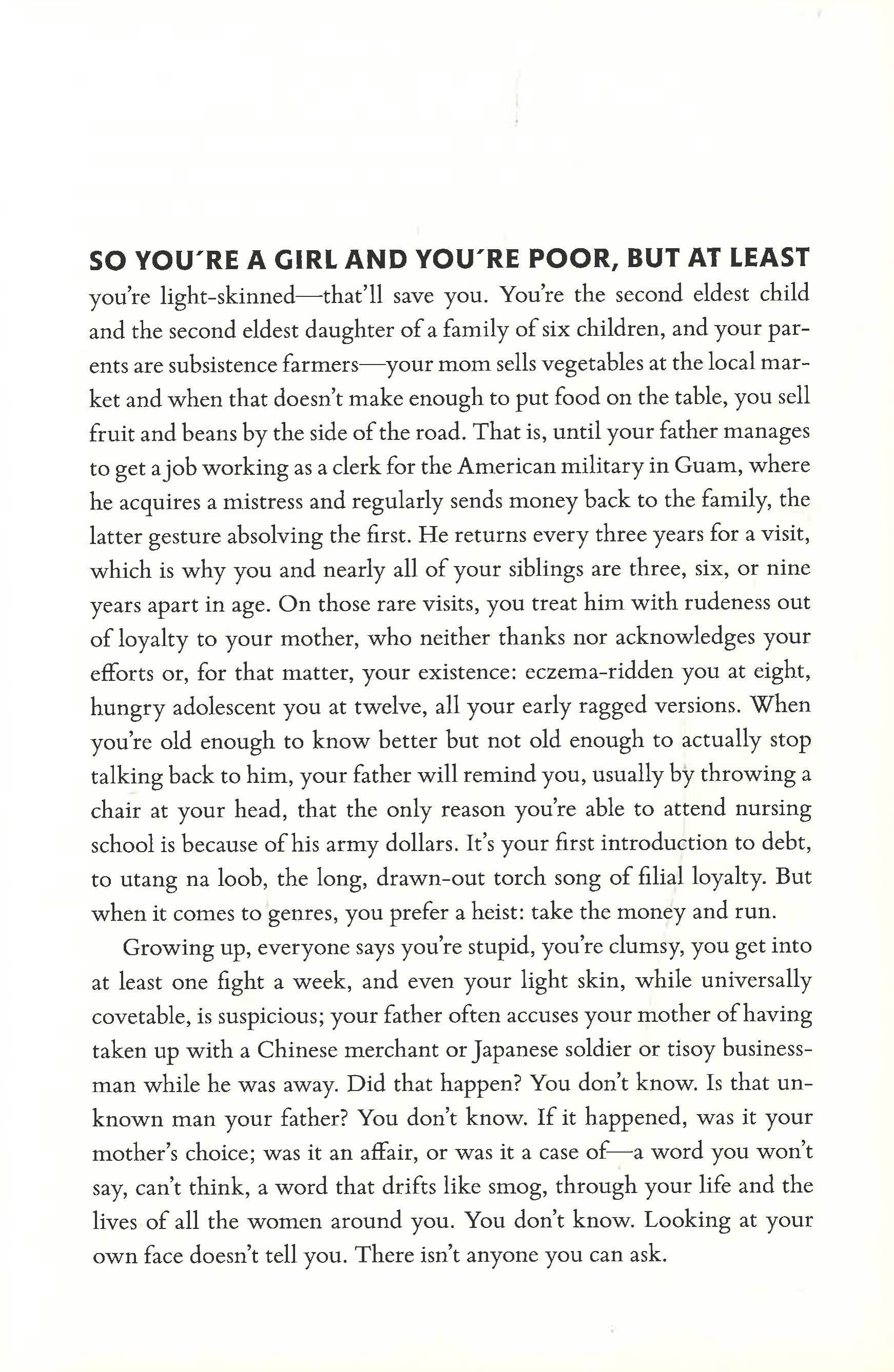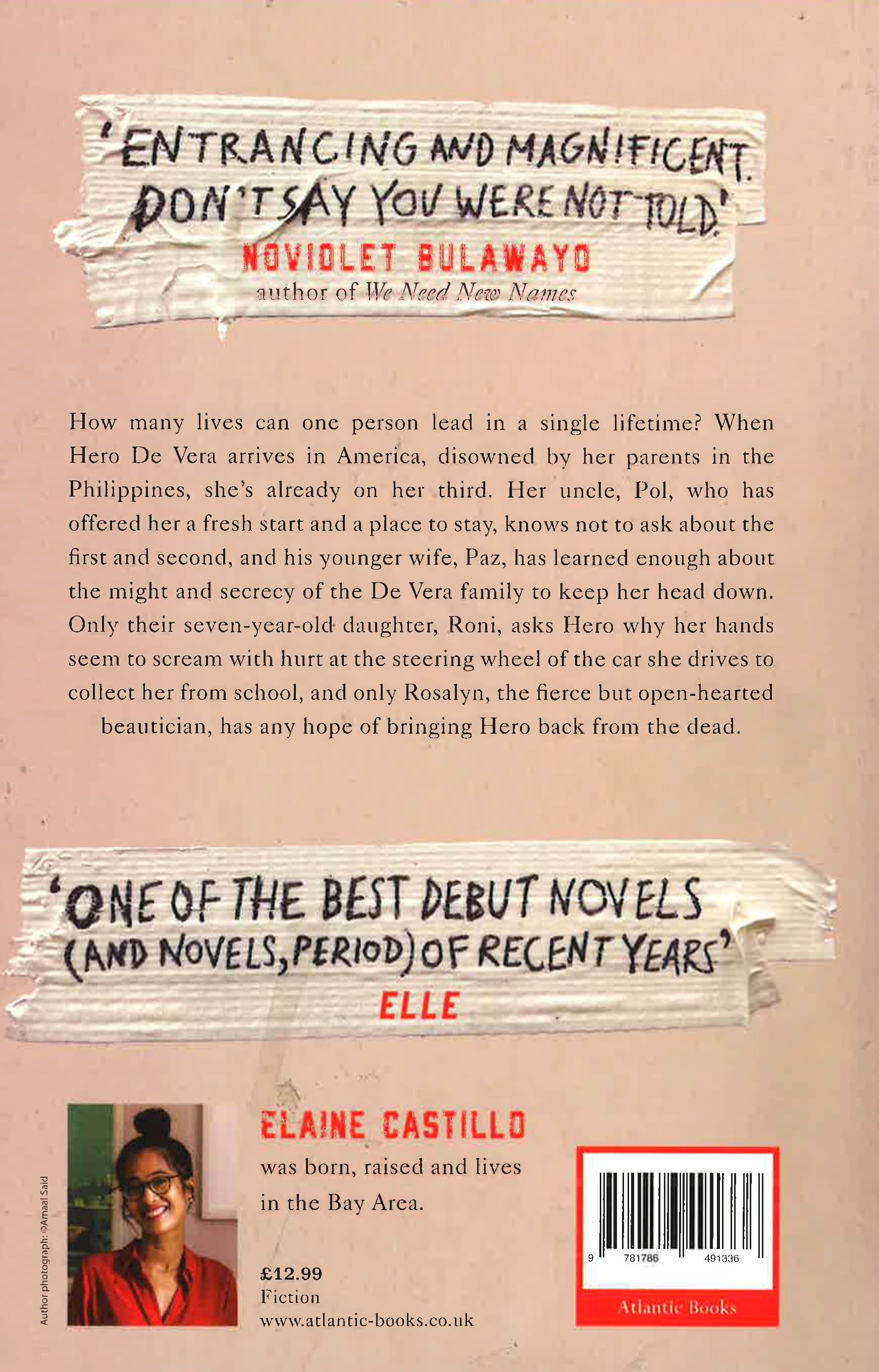 How many lives can one person lead in a single lifetime? When Hero De Vera arrives in America, disowned by her parents in the Philippines, she's already on her third. Her uncle, Pol, who has offered her a fresh start and a place to stay in the Bay Area, knows not to ask about the first and second. And his younger wife, Paz, has learned enough about the might and secrecy of the De Vera family to keep her head down. Only their daughter Roni asks Hero why her hands seem to scream with hurt at the steering wheel of the car she drives to collect her from school, and only Rosalyn, the fierce but open-hearted beautician, has any hope of bringing Hero back from the dead.