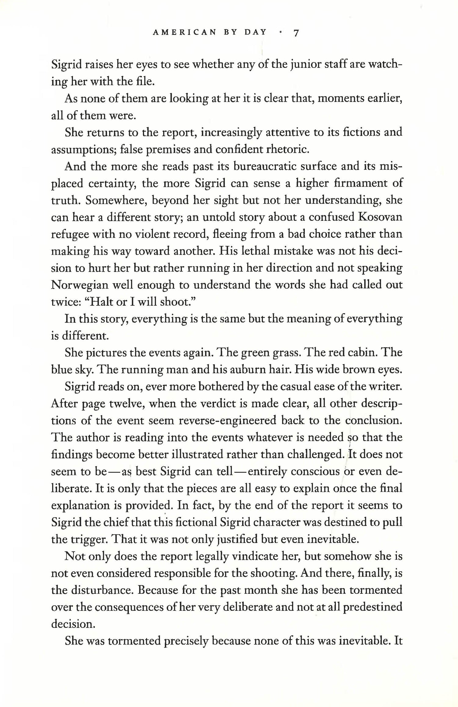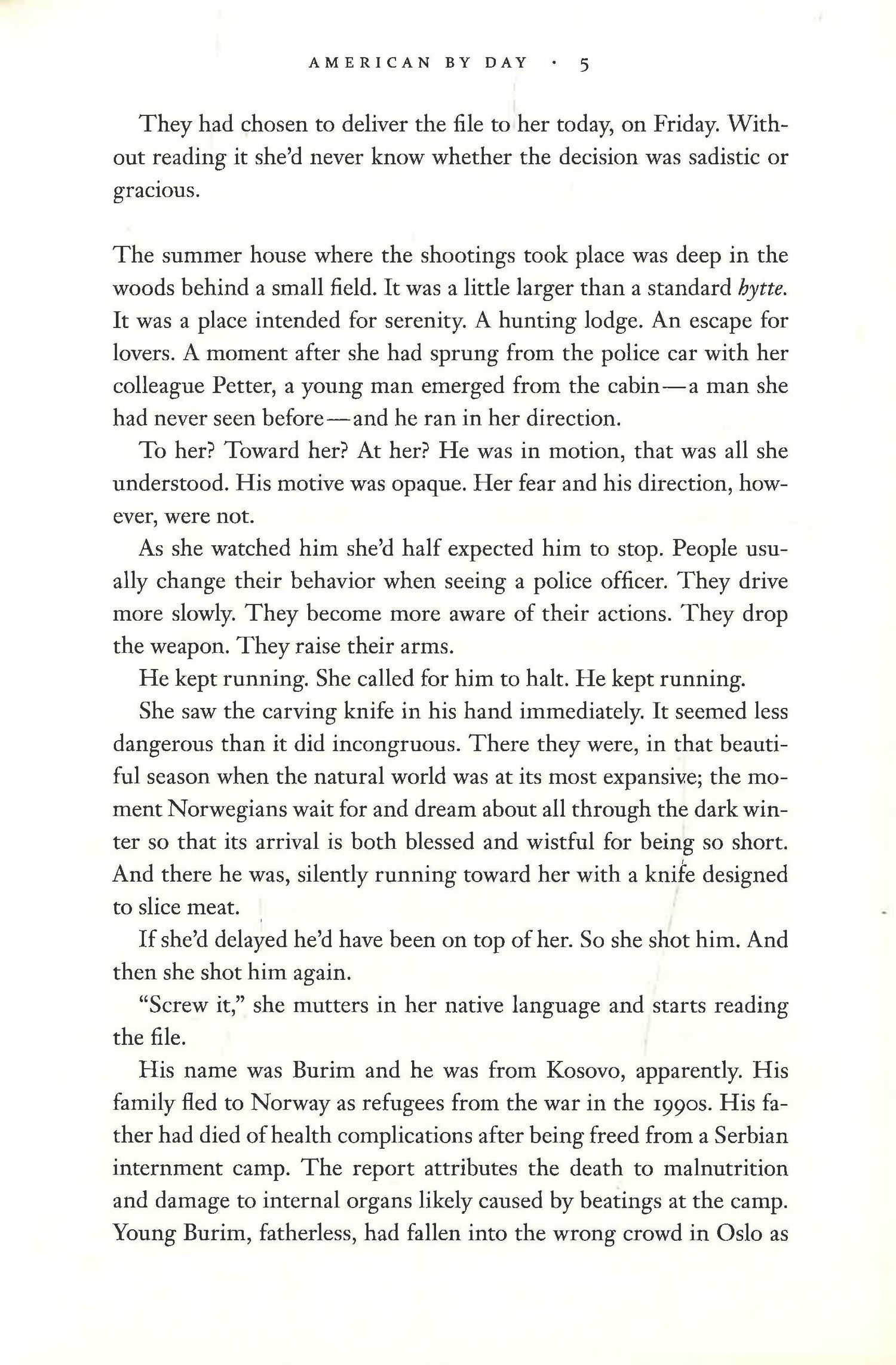 "Ingenious. Humorous. Wonderful."--Lee Child A gripping and timely novel that follows Sigrid--the dry-witted detective from Derek B. Miller's best-selling debut Norwegian by Night--from Oslo to the United States on a quest to find her missing brother SHE KNEW IT WAS A WEIRD PLACE. She'd heard the stories, seen the movies, read the books. But now police Chief Inspector Sigrid Ødegård has to leave her native Norway and actually go there; to that land across the Atlantic where her missing brother is implicated in the mysterious death of a prominent African-American academic. AMERICA. Sigrid is plunged into a United States where race and identity, politics and promise, reverberate in every aspect of daily life. Working with--or, if necessary, against--the police, she must negotiate the local political minefields and navigate the backwoods of the Adirondacks to uncover the truth before events escalate further. Refreshingly funny, slyly perceptive, American by Day secures Derek B. Miller's place as one of our most imaginative and entertaining novelists.