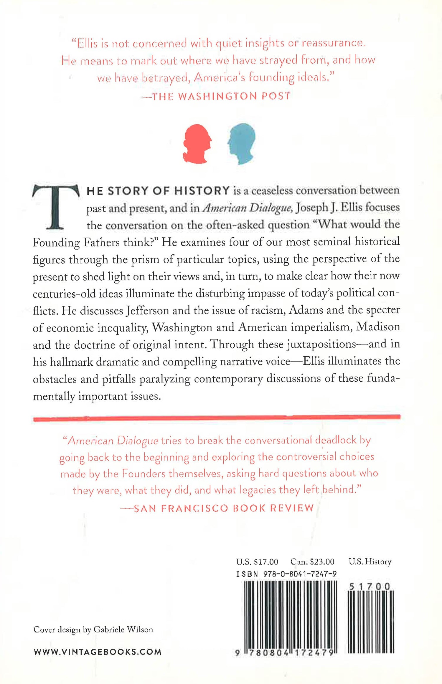 The story of history is a ceaseless conversation between past and present, and in American Dialogue Joseph J. Ellis focuses the conversation on the often-asked question "What would the Founding Fathers think?" He examines four of our most seminal historical figures through the prism of particular topics, using the perspective of the present to shed light on their views and, in turn, to make clear how their now centuries-old ideas illuminate the disturbing impasse of today's political conflicts. He discusses Jefferson and the issue of racism, Adams and the specter of economic inequality, Washington and American imperialism, Madison and the doctrine of original intent. Through these juxtapositions—and in his hallmark dramatic and compelling narrative voice—Ellis illuminates the obstacles and pitfalls paralyzing contemporary discussions of these fundamentally important issues.