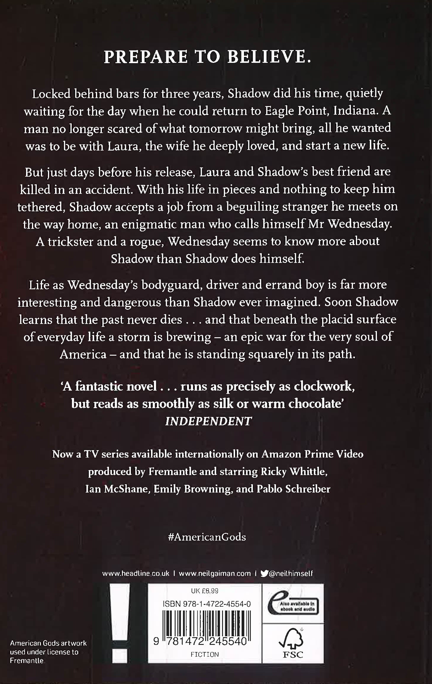 The extraordinary epic novel from storytelling genius and international bestseller Neil Gaiman. Now brought vividly to life for TV in the highly acclaimed, Emmy-nominated Amazon Prime video series starring Ricky Whittle, Ian McShane and Emily Browning. For fans of Good Omens and His Dark Materials.
