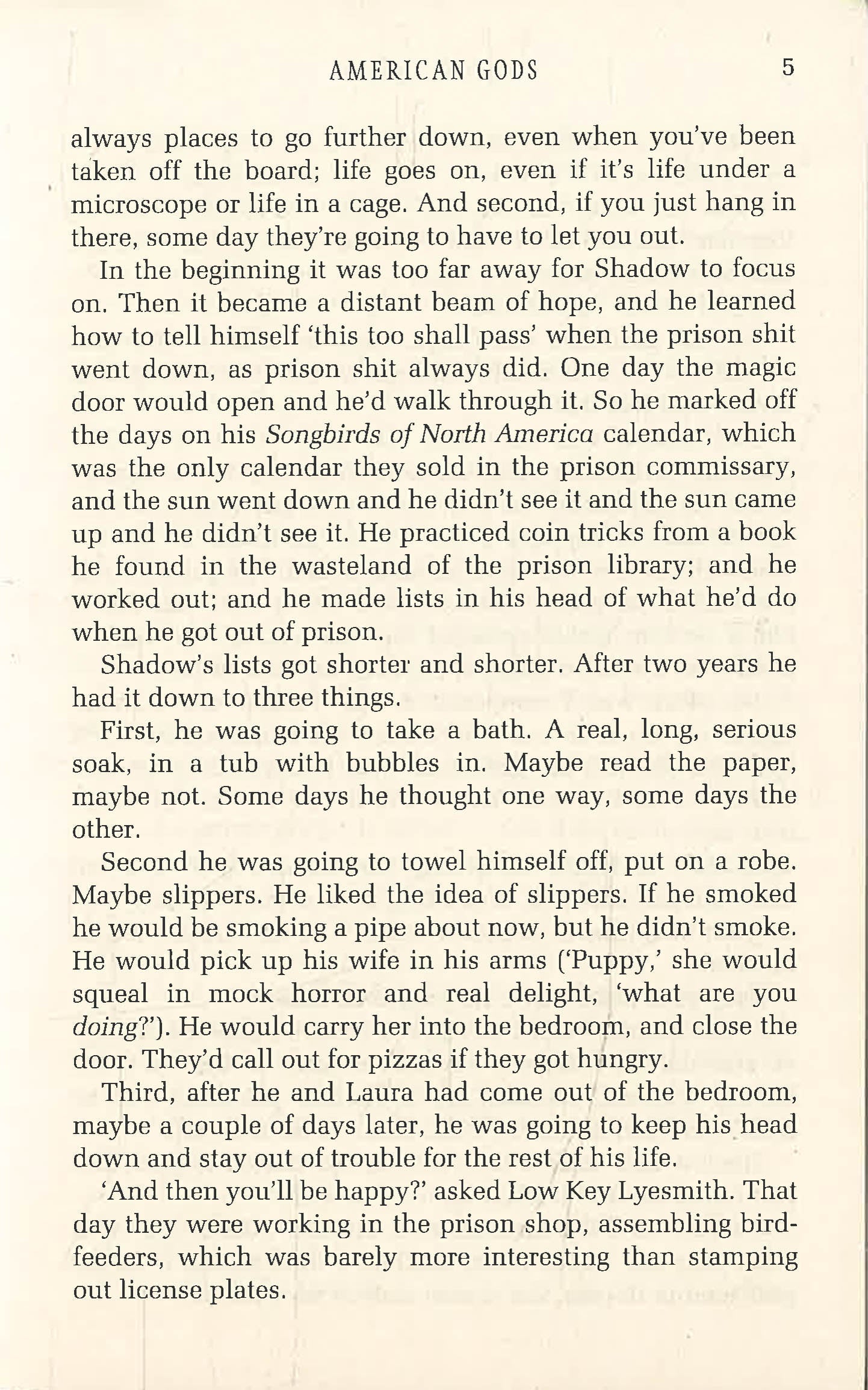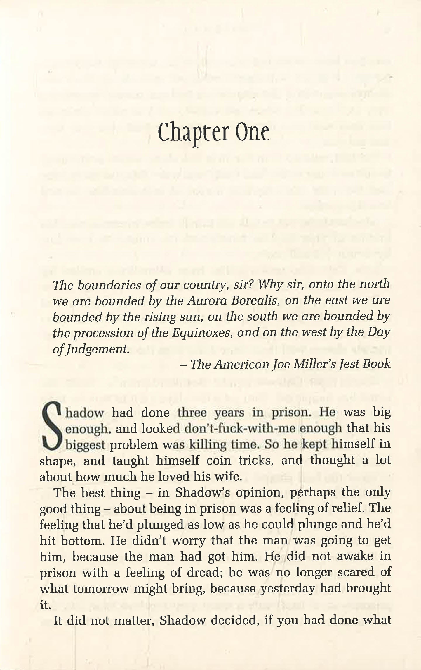Shadow Moon has served his time. But hours before his release from prison, his beloved wife is killed in a freak accident. Dazed, he boards a plane home where he meets the enigmatic Mr Wednesday, who professes both to know Shadow and to be king of America.