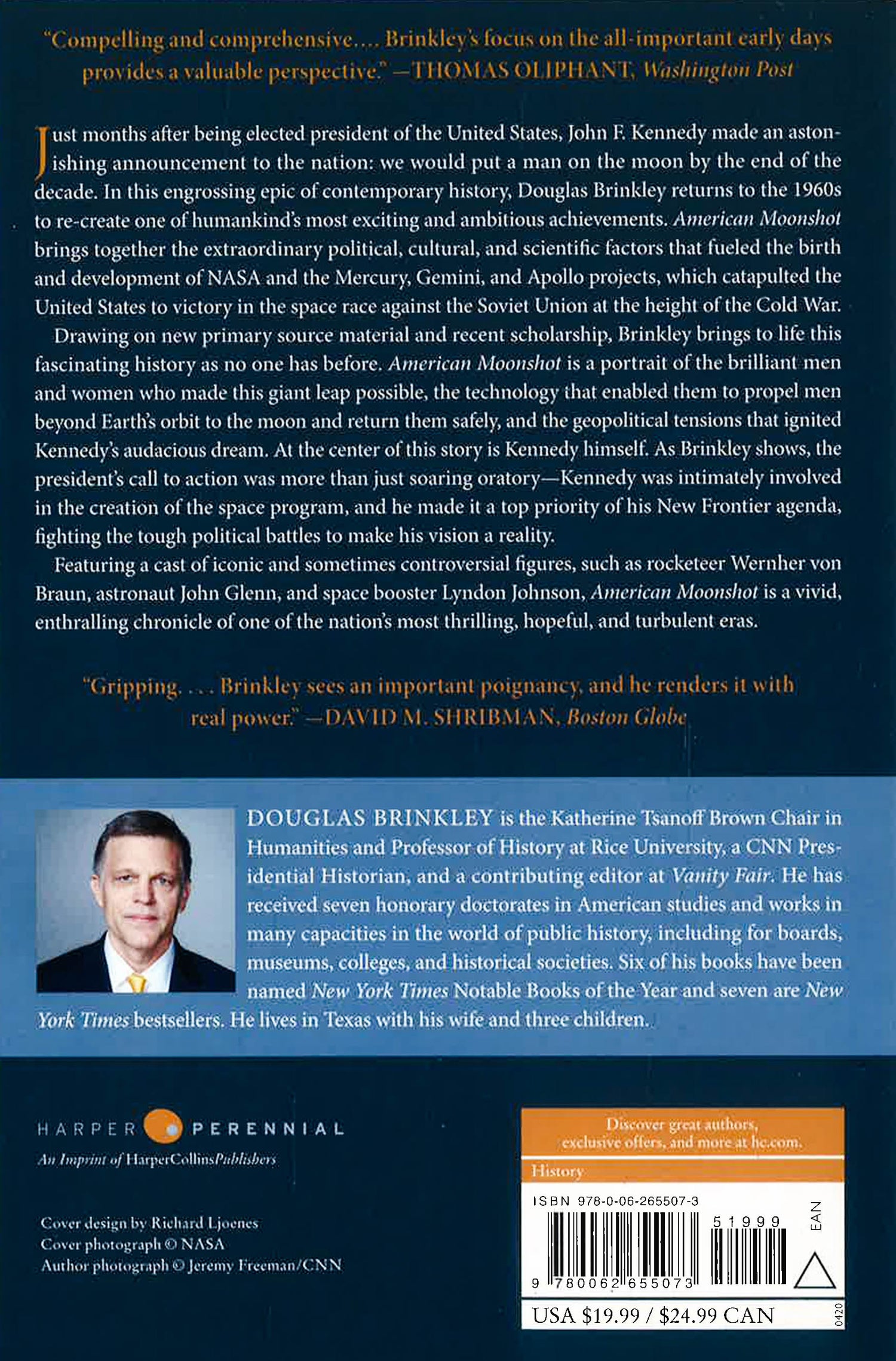 On May 25, 1961, JFK made an astonishing announcement: his goal of putting a man on the moon by the end of the decade. In this engrossing, fast-paced epic, Douglas Brinkley returns to the 1960s to recreate one of the most exciting and ambitious achievements in the history of humankind. American Moonshot brings together the extraordinary political, cultural, and scientific factors that fueled the birth and development of NASA and the Mercury, Gemini and Apollo projects, which shot the United States to victory in the space race against the Soviet Union at the height of the Cold War.