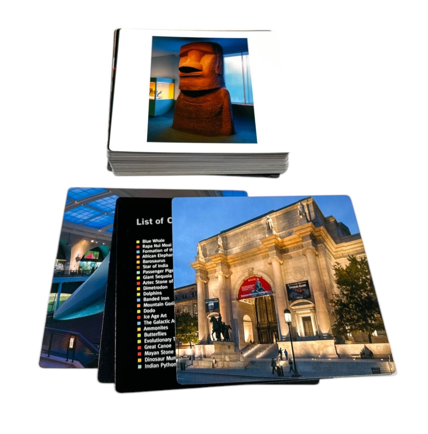 The card deck covers each of the museum's major areas of exhibition, including Birds, Reptiles, and Amphibians; Earth and Planetary Science; Fossils; Human Origins and Culture; Mammals; Biodiversity and the Environmental; and the Hayden Planetarium. Some of the 100 objects include the Cape York Meteorite, discovered in Greenland in 1894; the Haida Canoe, built in 1878 by the Indians of the Pacific Northwest and carved from the trunk of a large cedar tree; the Blue Whale, a fiberglass replica of a 94-foot whale caught in 1925 off South George Island and the Warren Mastodon skeleton, the first complete mastodon skeleton discovered in the United States.