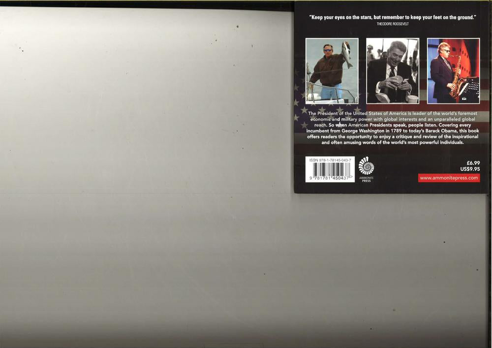 Humorous and inspirational quotes from America's 43 Presidents ""The nine most terrifying words in the English language are, 'I'm from the government and I'm here to help.'" Ronald Reagan" ""Fighting battles is like courting girls: those who make the most pretensions and are boldest usually win." Rutherford B. Hayes" "The pay is good and I can walk to work." John F. Kennedy" The President of the United States of America is the most powerful person in the world, the leader of the world's foremost economic and military power with global interests and an unparalleled global reach. The nation's GDP is close to a quarter of the world's total and its military budget is almost as great as the rest of the world's military expenditure put together. So when U.S. Presidents speak people listen. Since George Washington became the first President of the United States in 1789, 42 men have occupied that powerful position, some more memorably than others. Many have been great orators, whose words have given hope and inspiration to the American people, and even the world, during difficult times; some have had very little of note to say and some have sought to deceive; while others at times have managed to put their feet firmly in their mouths. Illustrated with photographs throughout, this book is a celebration of the political rhetoric, wisdom, humor, and gaffes that have been spoken and written by those 43 Presidents of the United States.