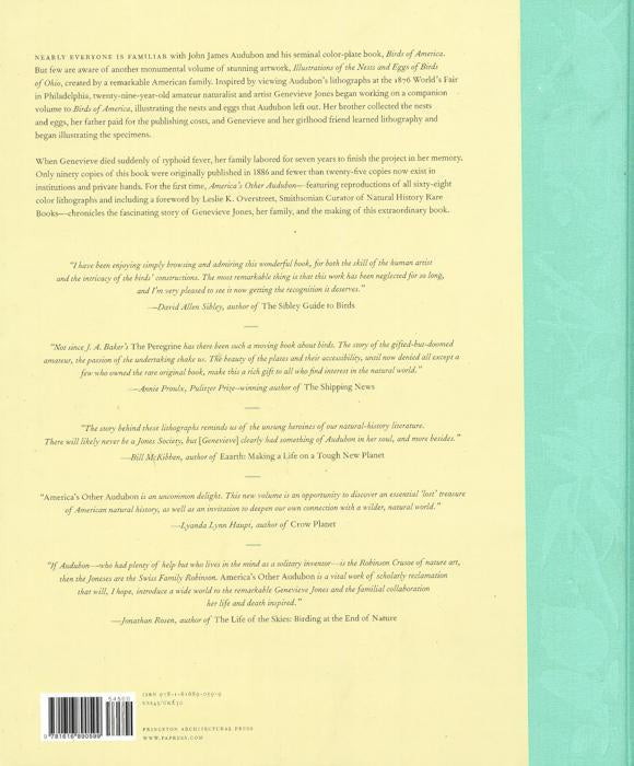 Americas Other Audubon chronicles the story of Genevieve Jones, her family, and the making of an extraordinary nineteenth century book, Illustrations of the Nests and Eggs of Birds of Ohio. At the age of twenty-nine, Genevieve Jones, an amateur naturalist/artist and daughter of a country doctor, visited the 1876 Centennial World's Fair in Philadelphia, where she saw Audubon's paintings in Birds of America on display. His artwork inspired her to undertake the production of a book illustrating the bird's nests and eggs that Audubon neglected to include in his work. Her parents were reluctant to support the undertaking of such an ambitious and expensive project until Genevieve became despondent over a broken engagement. Concerned over her fragile mental state, they encouraged her to begin the book as a distraction. Her brother collected the nests and eggs, her father paid for the publishing costs, and Genevieve and her girlhood friend learned lithography and began illustrating the specimens. The book was sold by subscription in twenty-three parts. Then, suddenly, Genevieve died of typhoid fever after personally completing only five of the illustrations. Her family took up the completion of the work in her memory. Only 90 copies of the book were produced and fewer than 20 have been located today in libraries or in private collections.