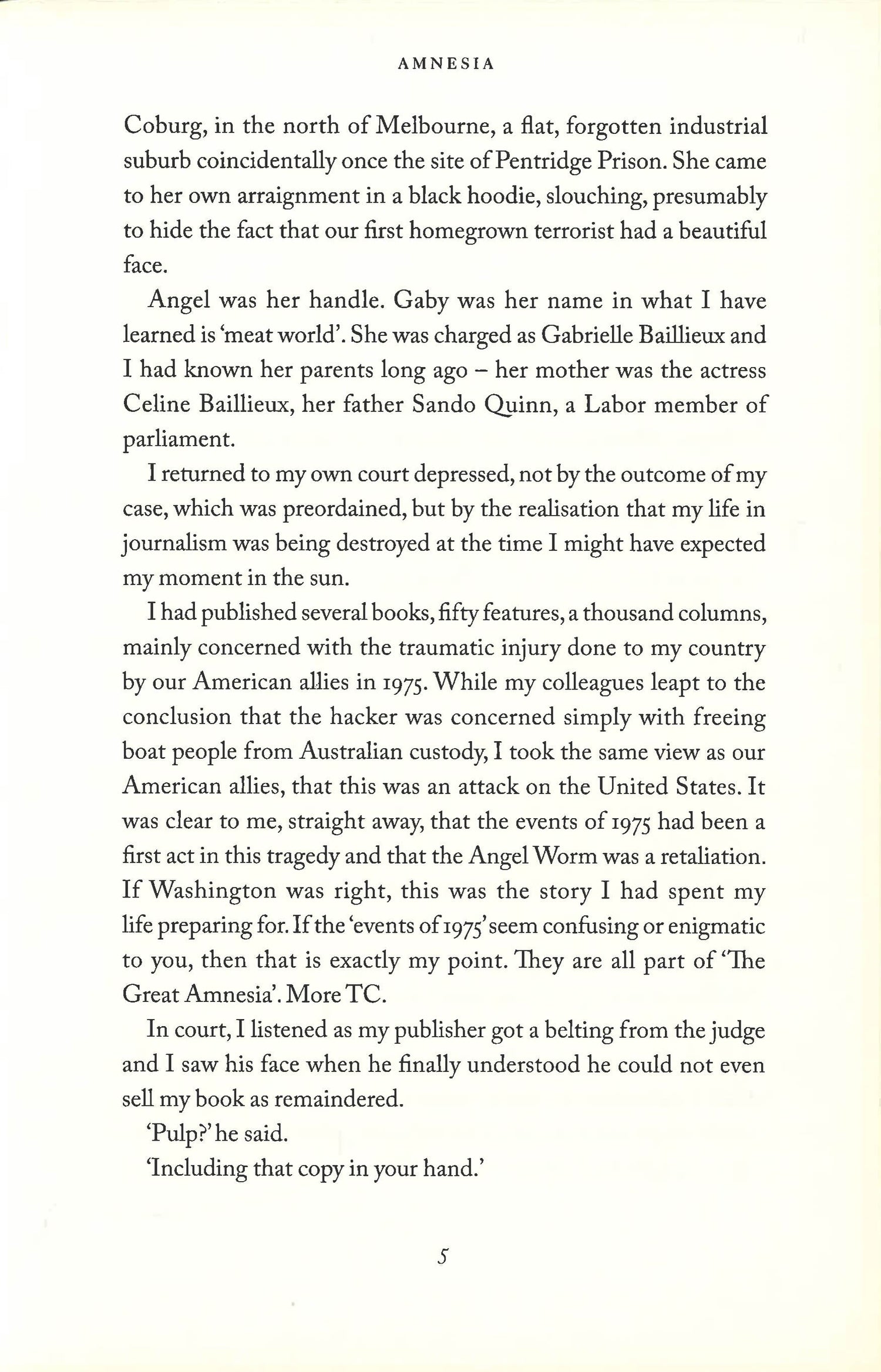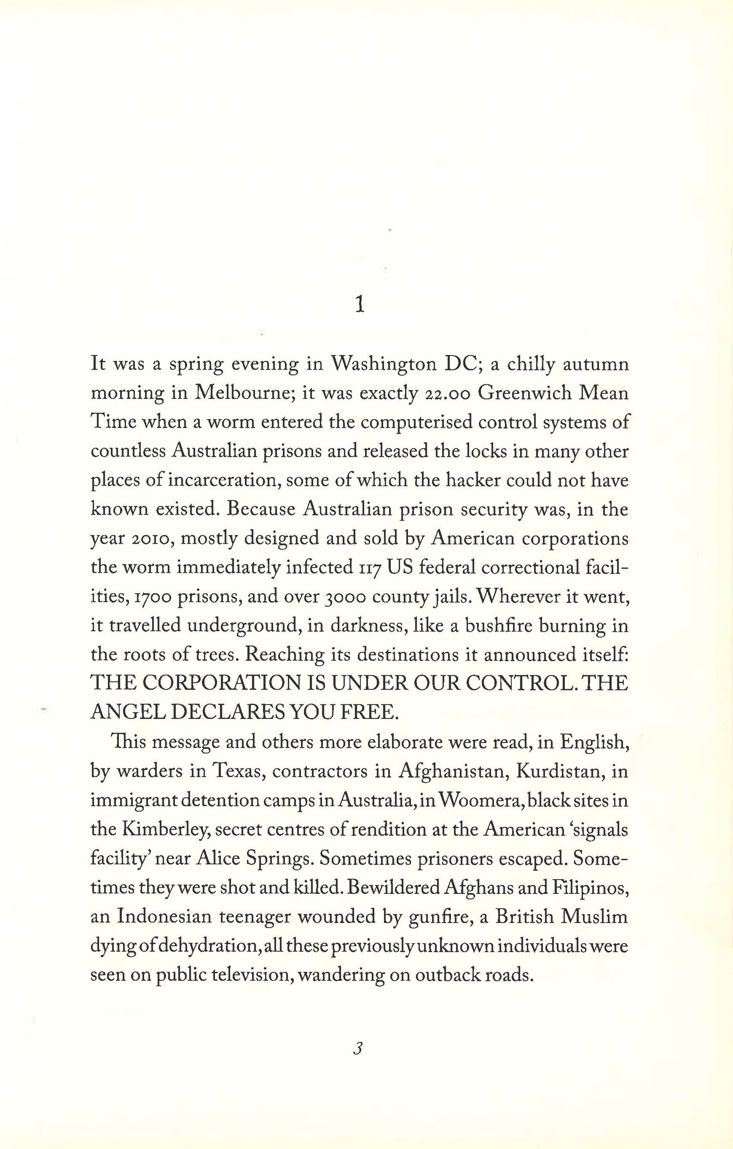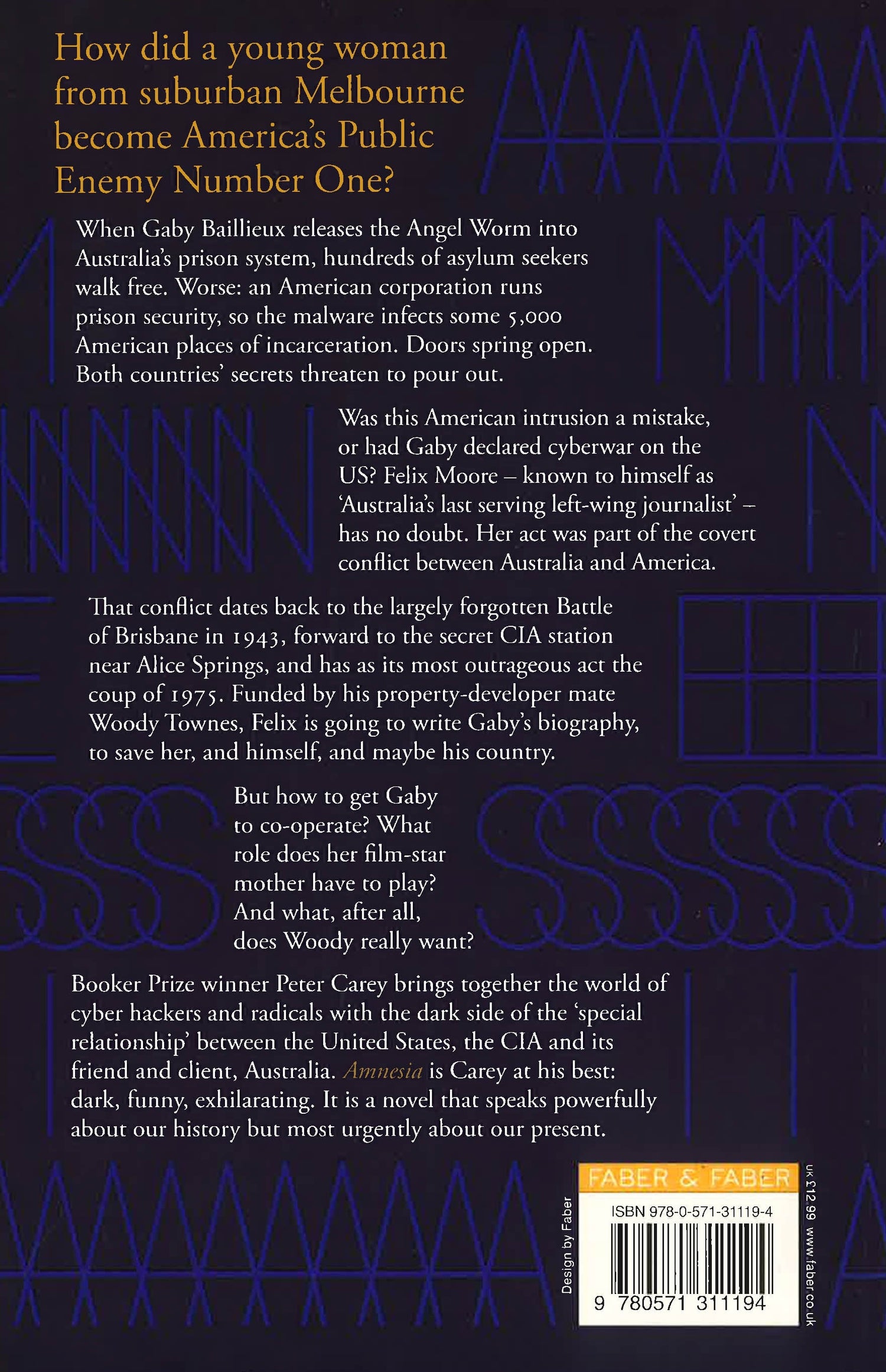 When Gaby Bailleux released the Angel Worm into Australia's prison system, allowing hundreds of asylum seekers to walk free, she also let the cat out of the bag. The Americans ran the prisons, like so many parts of her country, and so the doors of some 5000 American places of incarceration also opened. Both countries' secrets threatened to pour out. Was this a mistake, or had Gaby declared cyberwar on the US? Felix Moore - known to himself as 'Australia's last serving left wing journalist' - has no doubt. Her act was part of the covert conflict between Australia and America. That conflict dates back to the largely forgotten Battle of Brisbane in 1943, stretches forward to America's security interests in Pine Gap and commercial interests everywhere, and has as its most outrageous act the coup of 1975. Funded by his property-developer mate Woody Townes, Felix is going to write Gaby's biography, to save her, and himself, and maybe his country. But how to get Gaby to co-operate? What role does her film-star mother have to play? And what, after all, does Woody really want?