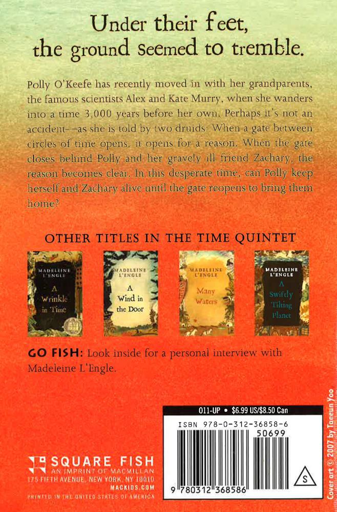 An Acceptable Time, the final book in Madeleine L'Engle's Time Quintet, the series that began with the Newbery Award winner A Wrinkle in Time. While spending time with her grandparents, Alex and Kate Murry, Polly O'Keefe wanders into a time 3,000 years before her own. "A rich and heady brew . . . fine fantasy, firmly rooted in reality.'' --Publisher's Weekly Under their feet, the ground seemed to tremble. A flash of lightning, quivering ground, and, instead of her grandparents' farm, Polly sees mist and jagged mountains -- and coming toward her, a group of young men carrying spears. Why has a time gate opened and dropped Polly into a world that existed 3,000 years ago? Will she be able to get back to the present before the time gate closes -- and leaves her to face a group of people who believe in human sacrifice? Praise for An Acceptable Time "When Polly O'Keefe visits her grandparents in Connecticut, she finds herself caught up in the lives of three mysterious strangers [who lived] 3,000 years ago [and] travels back in time to play a crucial role in an ancient confrontation. . . L'Engle has again achieved the award-winning style of A Wrinkle in Time. . . Highly recommended." --VOYA "A rich and heady brew . . . fine fantasy, firmly rooted in reality.'' --Publisher's Weekly Books by Madeleine L'Engle A Wrinkle in Time Quintet A Wrinkle in Time A Wind in the Door A Swiftly Tilting Planet Many Waters An Acceptable Time A Wrinkle in Time: The GraphicNovel by Madeleine L'Engle; adapted & illustrated by HopeLarson: A graphic novel adaptation of Madeleine L'Engle's ground-breakingscience fiction and fantasy classic. Intergalactic P.S. 3 by Madeleine L'Engle; illustrated by Hope Larson: Astandalone story set in the world of A Wrinkle in Time! The Austin Family Chronicles Meet the Austins (Volume 1) The Moon by Night (Volume 2) The Young Unicorns (Volume 3) A Ring of Endless Light (Volume 4) A Newbery Honor book! Troubling a Star (Volume 5) The Polly O'Keefe books The Arm of the Starfish Dragons in the Waters A House Like a Lotus And Both Were Young Camilla The Joys of Love
