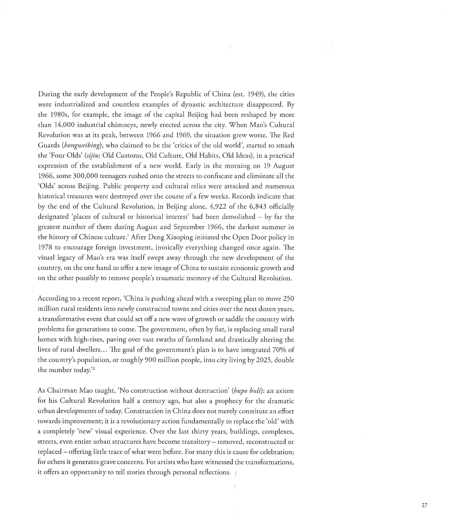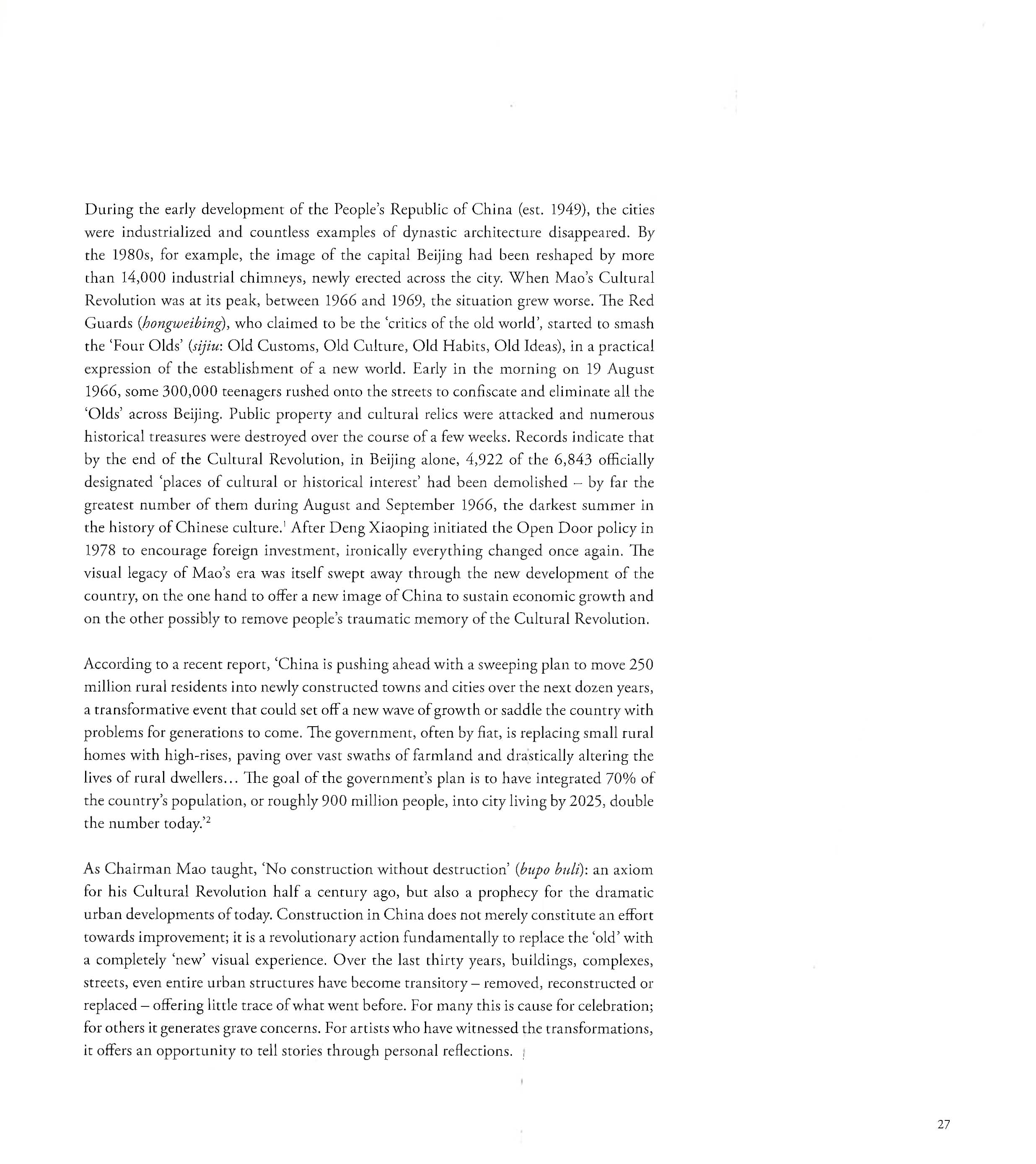 The rapid urban development of China is a topic that has grabbed the attention of the world. This groundbreaking book shows how some thirty contemporary Chinese art photographers have used it as a springboard for their practice. A short preface by Jiang Jiehong is followed by an introduction from expert on China, Stephan Feuchtwang. Four chapters follow, each featuring incisive explanatory text by Jiang Jiehong. The photographers showcase their responses to urbanization using a wide variety of approaches, whether Miao Xiaochun's photograph of a vast glass building rising like a UFO behind a traditional old neighbourhood, Wang Jinsong's collages of the Chinese character scrawled on buildings to mark them out as condemned, Zhang Peili's records of pastiche Western architecture, Xu Zhengqin's street hoardings showing dream residential and commercial developments, or Wang Chuan's poetic images of abandoned, half-finished modern buildings. This is a brave and beautiful compendium of reflections on urban transformation that will be a must-have for photography aficionados and anyone with an interest in China or contemporary culture.