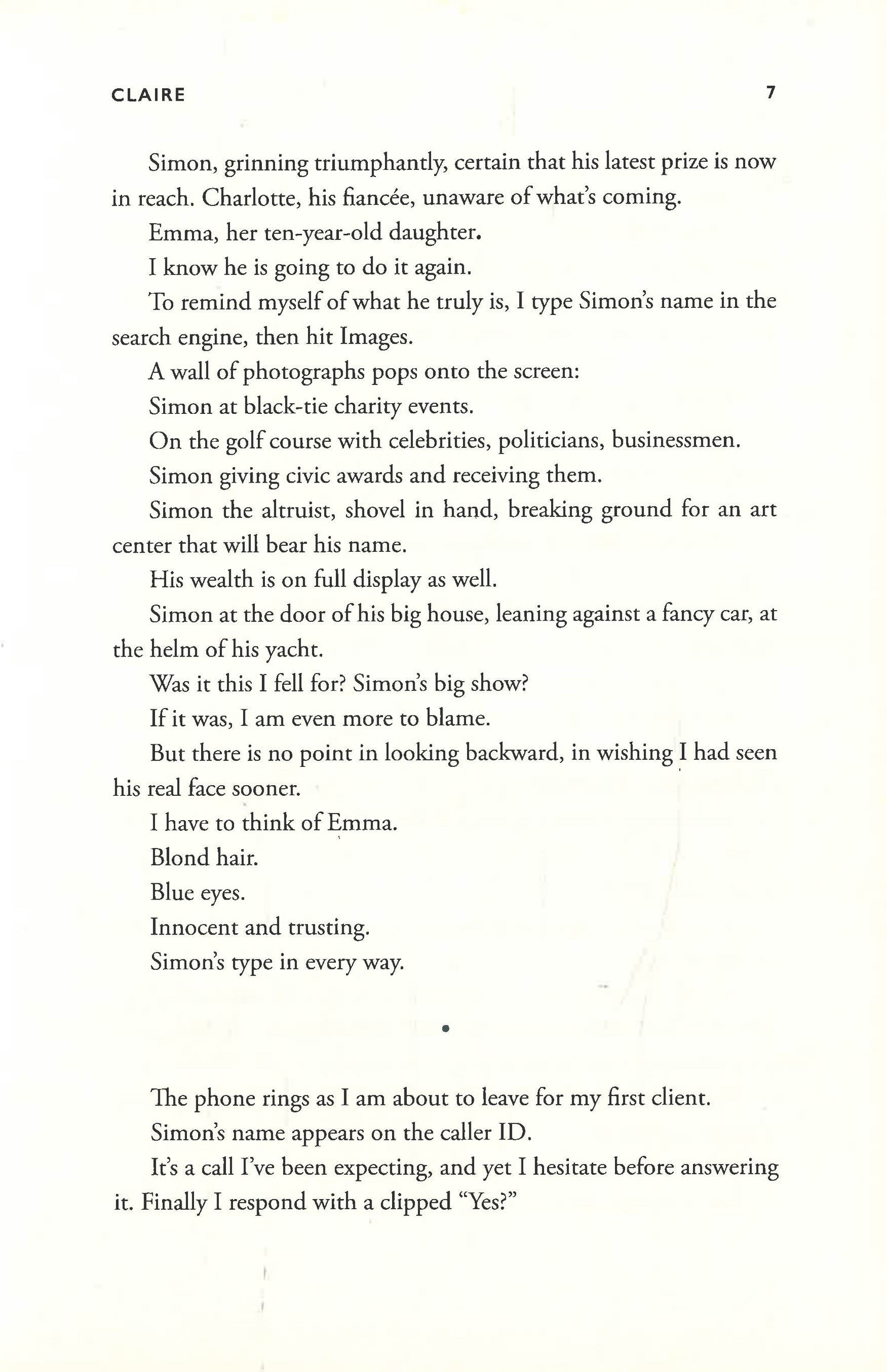 Sloane must navigate the wreckage of Claire and Simon's marriage to discover the truth. Two people with conflicting stories and a whole lot of reasons to want to hurt each other. Is she crazy or is he manipulative? And can Sloane stay clear-headed enough to figure it out?