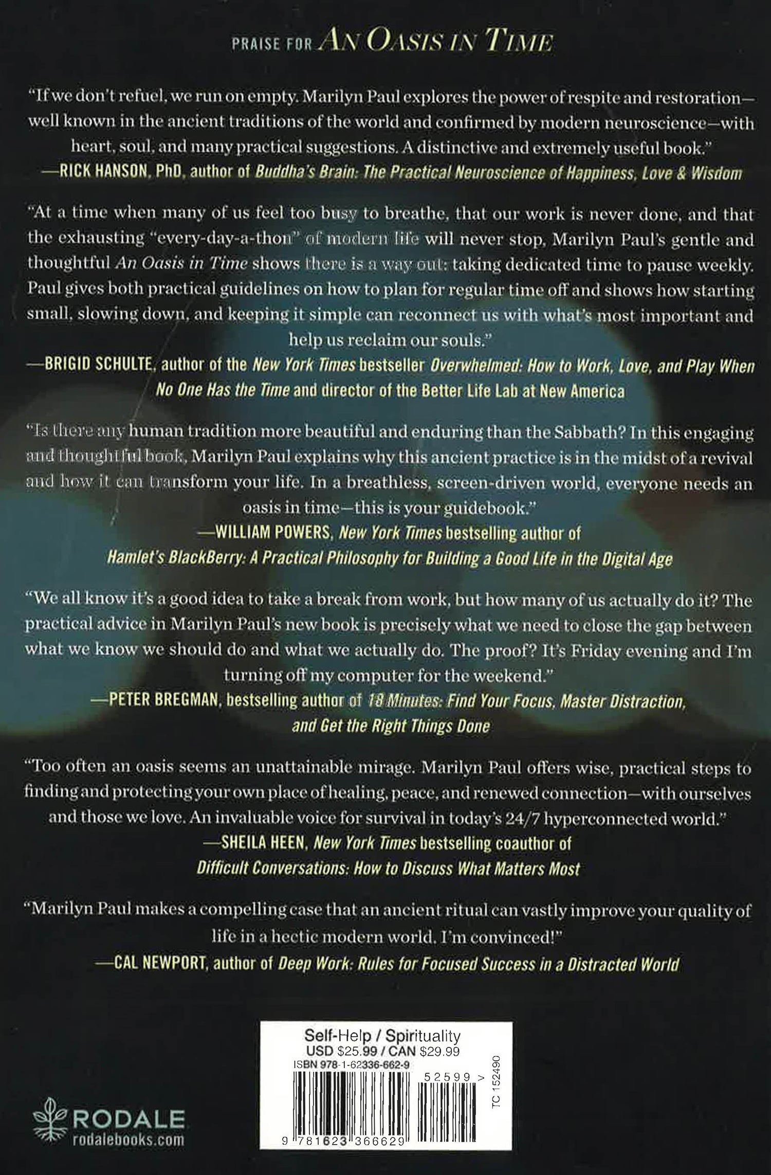 There is a surprising way out of the frenzy, that always-being-behind feeling, and the endless to-do list. Now more than ever, people are seeking a reprieve from the constant pressure to achieve, produce, and consume. While many turn to sporadic bouts of mindfulness and meditation, organizational change specialist Marilyn Paul offers a complementary solution that is as radical as it is ancient. In her new book An Oasis in Time, Paul focuses on the profound benefits of taking a modern-day Sabbath each week for deep rest and nourishing renewal. The energy, perspective, creativity, sense of well-being, and yes, increased productivity that ensue are lifesaving. Drawing on Sabbath tradition, contemporary research, and interviews with scores of busy people, Paul shows that it is possible to introduce these practices regardless of your religious beliefs. Starting with just an hour or two, you can carve out the time from your packed schedule, design your weekly oasis experience, and most importantly, change your mind-set so you can enjoy the pleasure of regularly slowing down and savoring life every week. From surrounding yourself with nature to practicing rituals for beginning and ending oasis time to implementing strategies for connecting with friends and family, self, and source, you will discover practical ways to step off the treadmill and into timeless refreshment on your way to a calmer, richer, more fulfilling life.