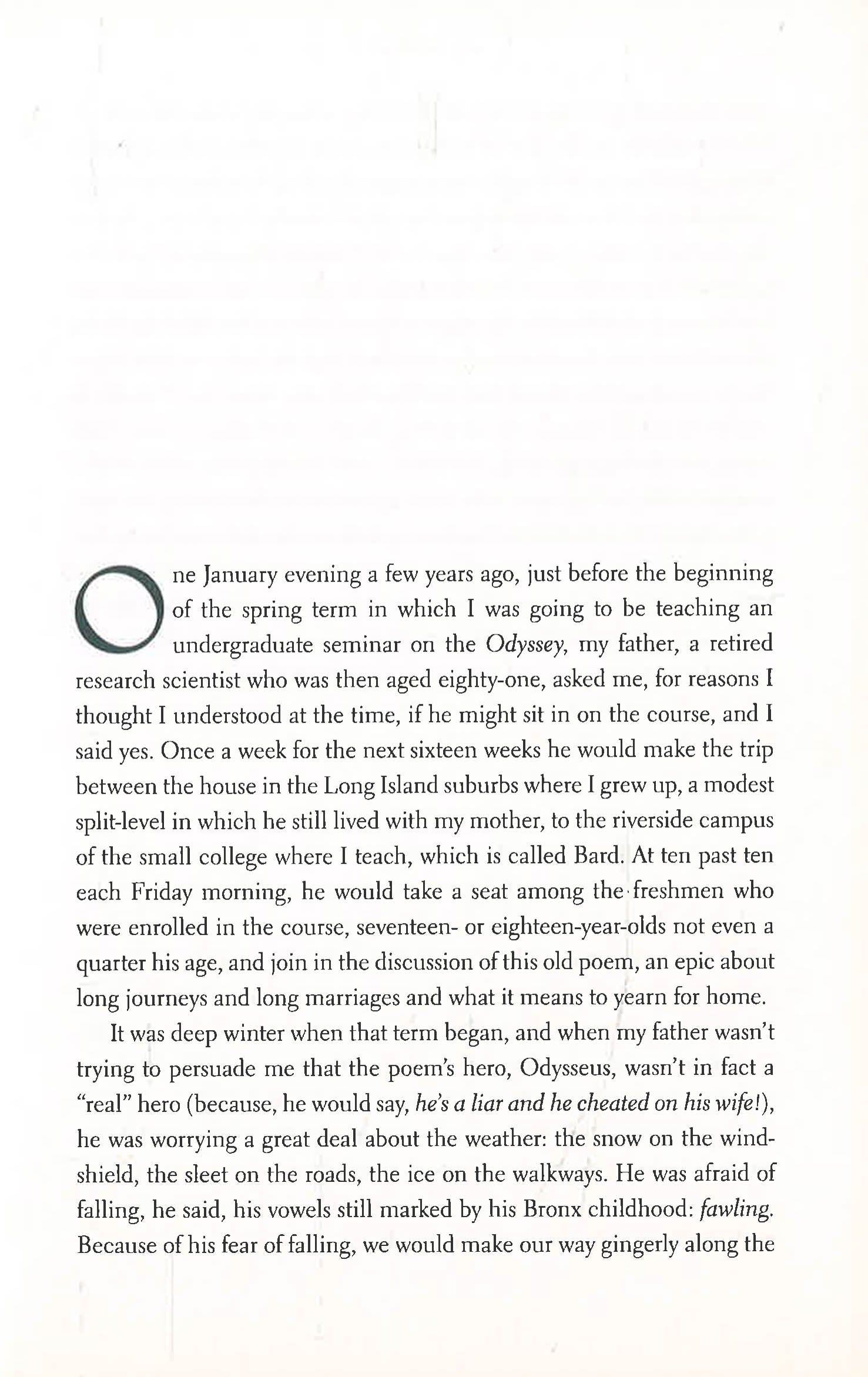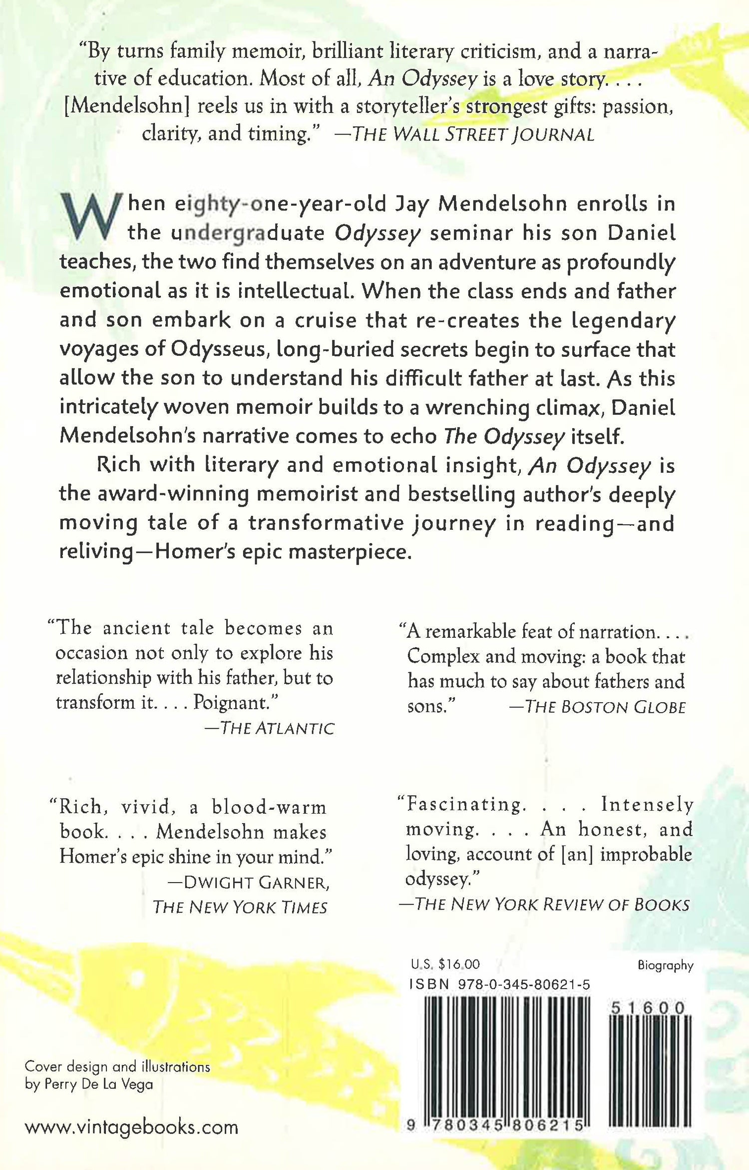 When eighty-one-year-old Jay Mendelsohn decides to enroll in the undergraduate Odyssey seminar his son teaches at Bard College, the two find themselves on an adventure as profoundly emotional as it is intellectual. For Jay, a retired research scientist who sees the world through a mathematician's unforgiving eyes, this return to the classroom is his "one last chance" to learn the great literature he'd neglected in his youth--and, even more, a final opportunity to more fully understand his son, a writer and classicist. But through the sometimes uncomfortable months that the two men explore Homer's great work together--first in the classroom, where Jay persistently challenges his son's interpretations, and then during a surprise-filled Mediterranean journey retracing Odysseus's famous voyages--it becomes clear that Daniel has much to learn, too: Jay's responses to both the text and the travels gradually uncover long-buried secrets that allow the son to understand his difficult father at last. As this intricately woven memoir builds to its wrenching climax, Mendelsohn's narrative comes to echo the Odyssey itself, with its timeless themes of deception and recognition, marriage and children, the pleasures of travel and the meaning of home. Rich with literary and emotional insight, An Odyssey is a renowned author-scholar's most triumphant entwining yet of personal narrative and literary exploration.