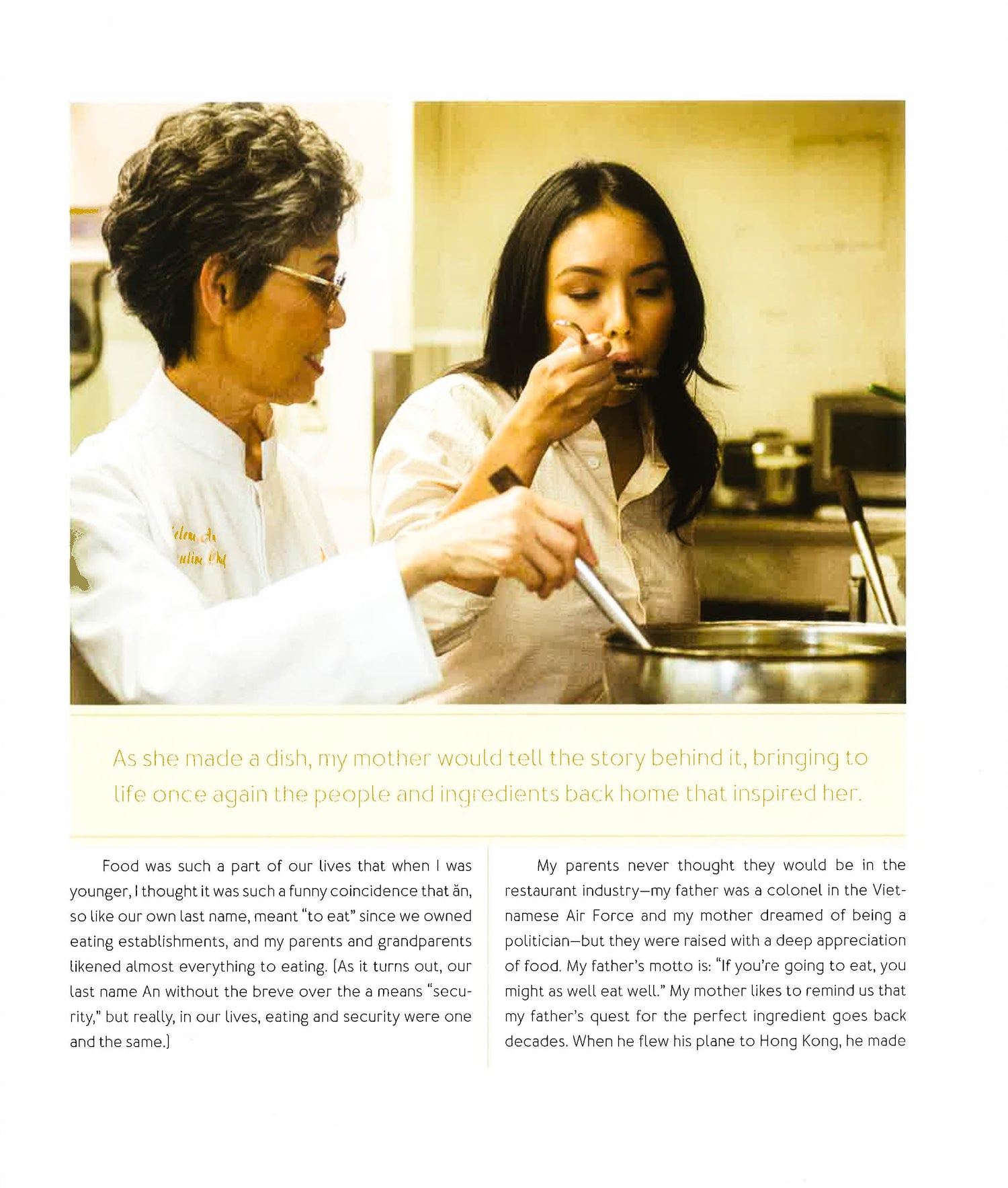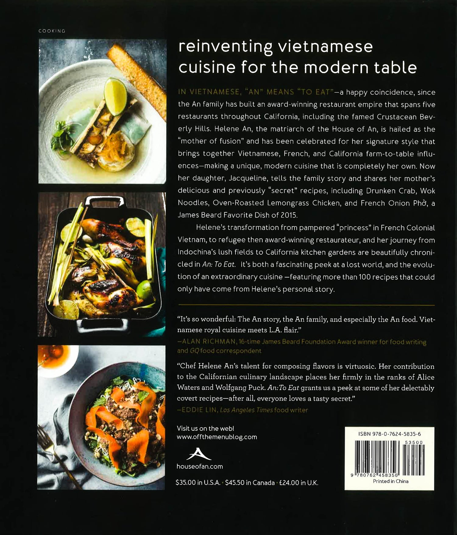 In Vietnamese, AN" means TO EAT," a happy coincidence, since the An family has built an award-winning restaurant empire, including the renowned celebrity favourite Crustacean Beverly Hills,that has been toasted by leading food press, including Bon Appetit, Gourmet, InStyle and the Food Network. Helene An, executive chef and matriarch of the House of An, is hailed as the mother of fusion" and was inducted into the Smithsonian Institute for her signature style that brings together Vietnamese, French, and California- fresh influences. Now her daughter Jacqueline tells the family story and shares her mother's delicious and previously secret" recipes, including Mama's" Beef Pho, Drunken Crab, and Oven-Roasted Lemongrass Chicken. Helene's transformation from pampered princess" in French Colonial Vietnam, to refugee then restaurateur, and her journey from Indochina's lush fields to family kitchen gardens in California are beautifully chronicled throughout the book. The result is a fascinating peek at a lost world, and the evolution of an extraordinary cuisine. The 100 recipes in An: To Eat feature clean flavors, simple techniques, and unique twists that could only have come from Helene's personal story.