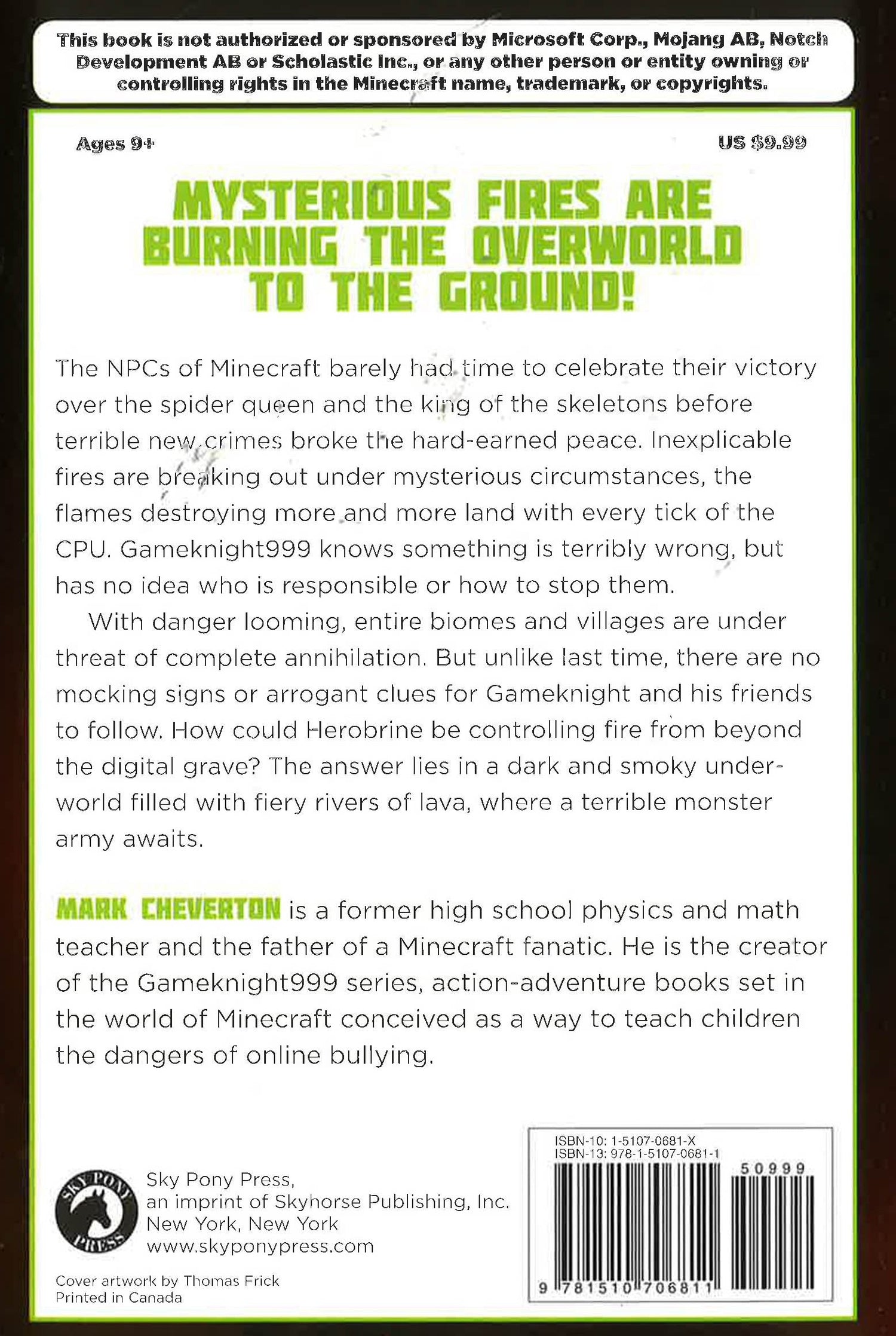 The NPCs of Minecraft barely had time to celebrate their victory over the spider queen and the king of the skeletons before terrible new crimes broke the hard-earned peace. Inexplicable fires are breaking out under mysterious circumstances, the flames destroying more and more land with every tick of the CPU. Gameknight999 knows something is terribly wrong, but has no idea who is responsible or how to stop them.With danger looming, entire biomes and villages are under threat of complete annihilation. But unlike last time, there are no mocking signs or arrogant clues for Gameknight and his friends to follow. How could Herobrine be controlling fire from beyond the digital grave? The answer lies in a dark and smoky underworld filled with fiery rivers of lava, where a terrible monster army awaits.
