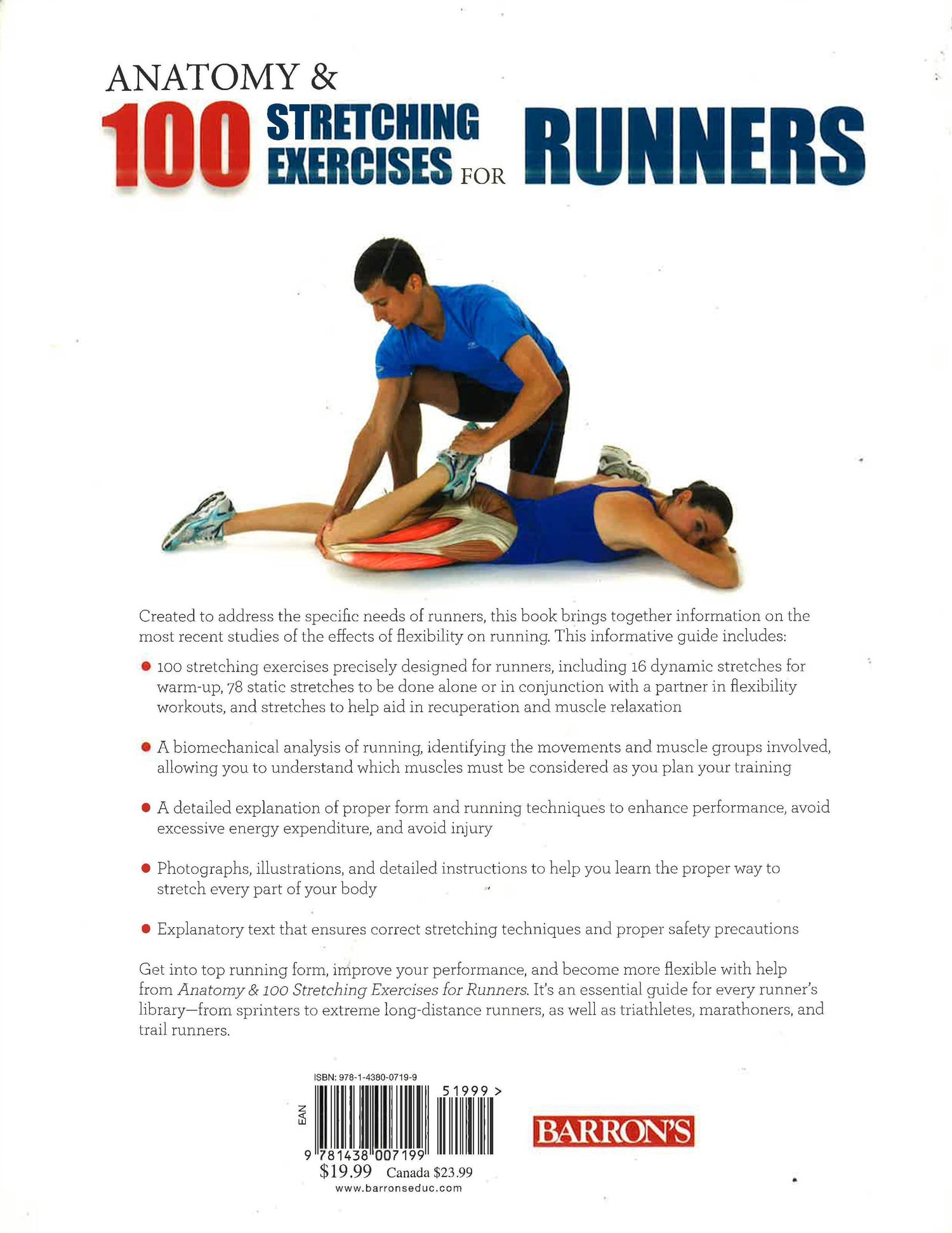 Barron's Anatomy and 100 Stretching Exercises for Runners includes stretching exercises to help runners improve their range of motion, decrease discomfort, and prevent sporting or other injuries. Each exercise is clearly illustrated and includes precise, easy-to-follow instructions. You'll get: