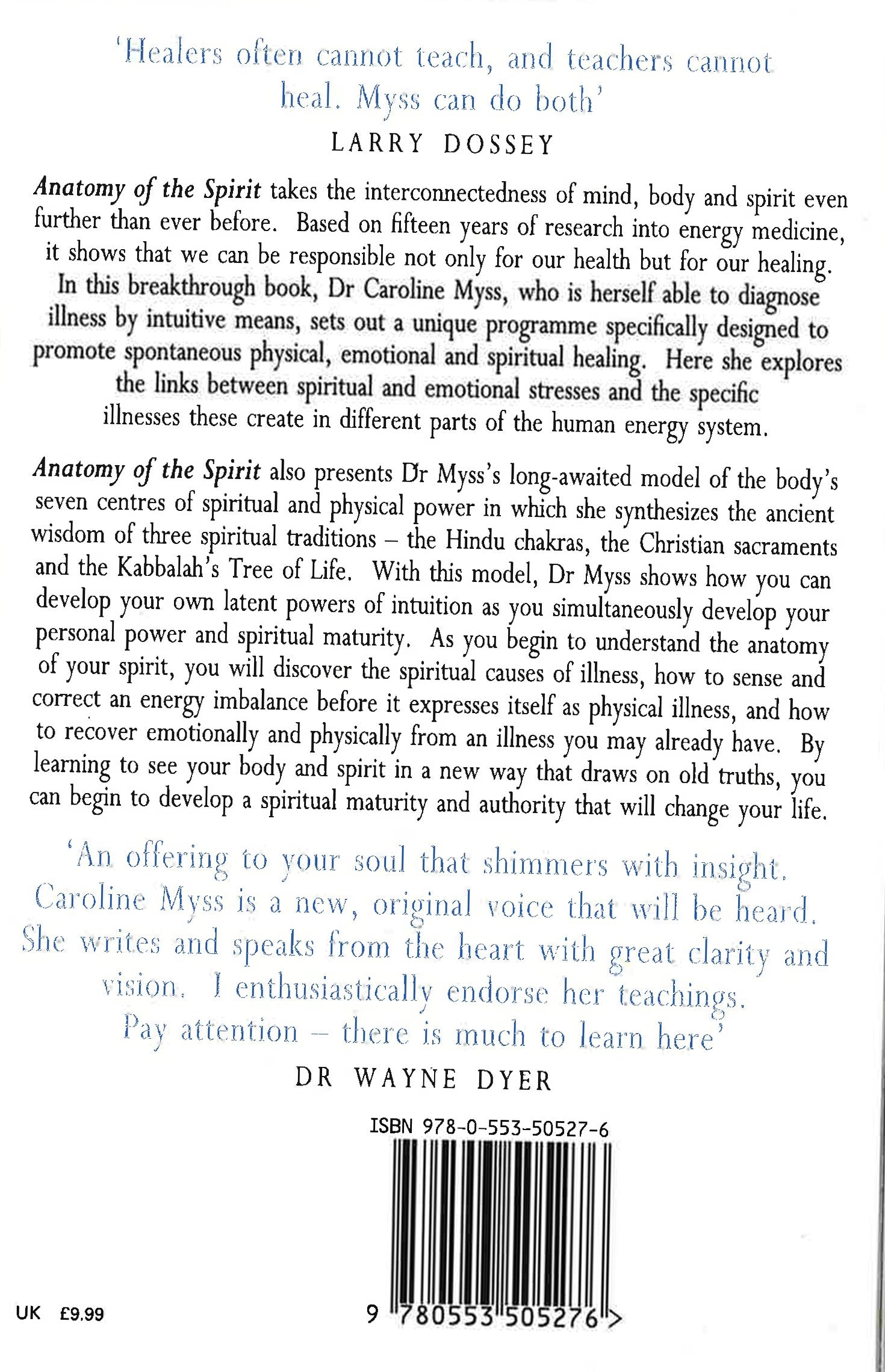 Anatomy of the Spirit" is the first book to unify Eastern and Western spiritual healing into a programme for physical healing and personal power. In this breakthrough view of mind, body and spirit, Caroline Myss demonstrates that the seven stages through which everyone must pass in the search for consciousness and spiritual maturity are the same in all traditions and are also the same seven stages for healing. During her many years of research into the power centres of the body, Myss has uncovered strong evidence that each illness we develop corresponds to a very specific pattern of emotional and psychological stress and that certain beliefs and attitudes influence corresponding areas of the human body. For example, fears regarding financial stress affect the health of the lower back; emotional barriers to experiencing love undermine the health of the heart. A strong need to control others or your environment influences the health of the sexual area of your body. Caroline also discusses in depth why people do not heal and the reasons why we often find ourselves in difficult circumstances that never seem to change.