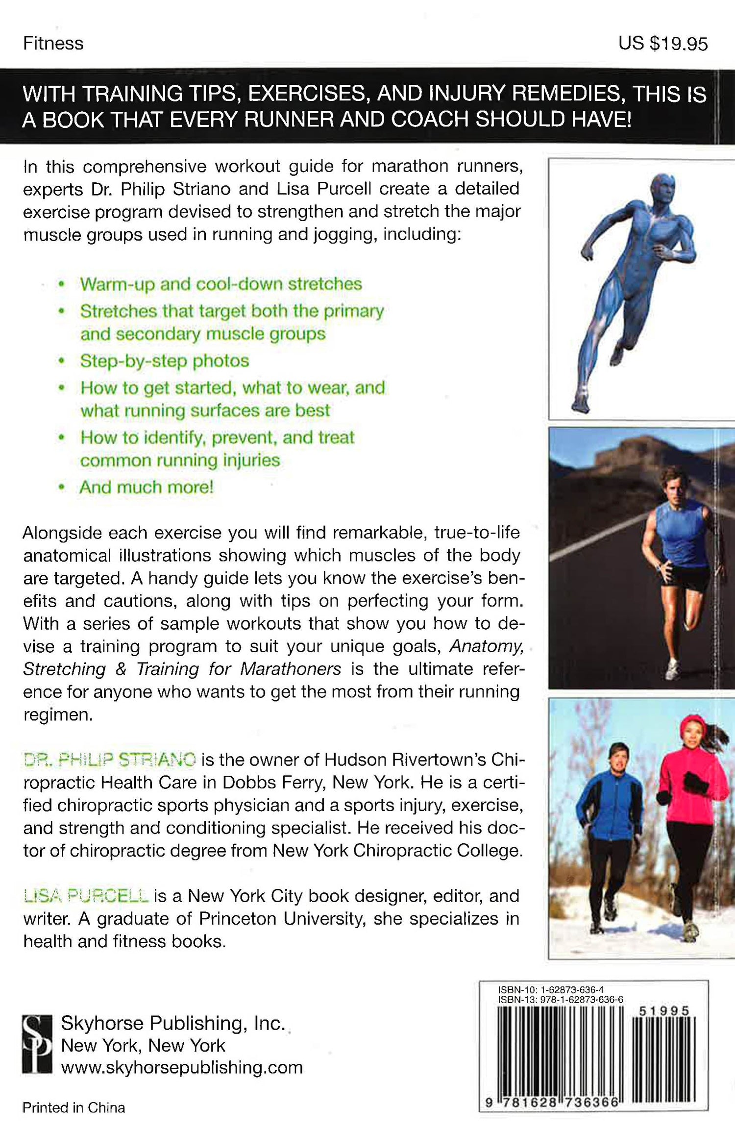 With training tips, exercises, and injury remedies, this is a book that every runner and coach should have! Running has become more and more popular in recent years, with thousands of people entering marathons, buying new running shoes with the latest technology, and going for a daily jog. But the joy and thrill of running are often marred by injuries that can bother you for a few weeks or for many years. That's why every runner needs to have Anatomy, Stretching & Training for Marathoners. In this comprehensive workout guide for marathon runners, Striano and Purcell create a detailed exercise program devised to strengthen and stretch the major muscle groups used in running and jogging, including: * Warm-up and cool-down stretches * Stretches that target both the primary and secondary muscle groups * Step-by-step photos * How to get started, what to wear, and what running surfaces are best * How to identify, prevent, and treat common running injuries * And much more! Alongside each exercise you will find remarkable, true-to-life anatomical illustrations showing which muscles of the body are targeted. A handy guide lets you know the exercise's benefits and cautions, along with tips on perfecting your form. Find out how to get started; what to wear and what running surfaces are best; and how to identify, prevent, and treat common running injuries. With a series of sample workouts that show you how to devise a training program to suit your unique goals, Anatomy, Stretching & Training for Marathoners is the ultimate reference for anyone who wants to get the most from their running regimen.