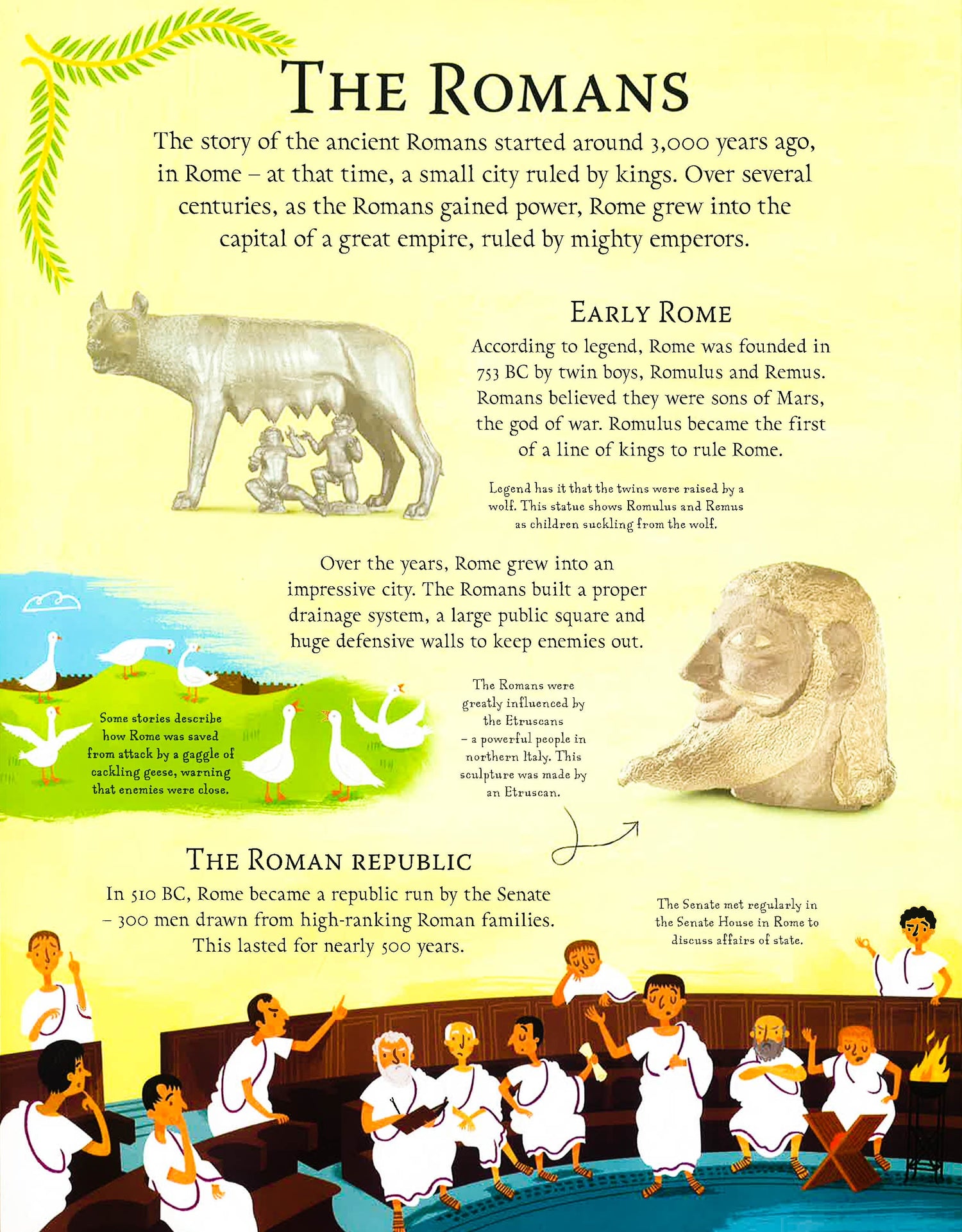 A colourful information book, packed with over 120 stickers illustrating life in Ancient Roman times. Brightly illustrated pages describe how the Romans entertained themselves, the fashion trends they followed, why the Roman Empire fell apart and more. Children can match the stickers of fearsome weapons, magnificent buildings and ancient artefacts to the corresponding images on each page. A fascinating history book combined with a fun activity.