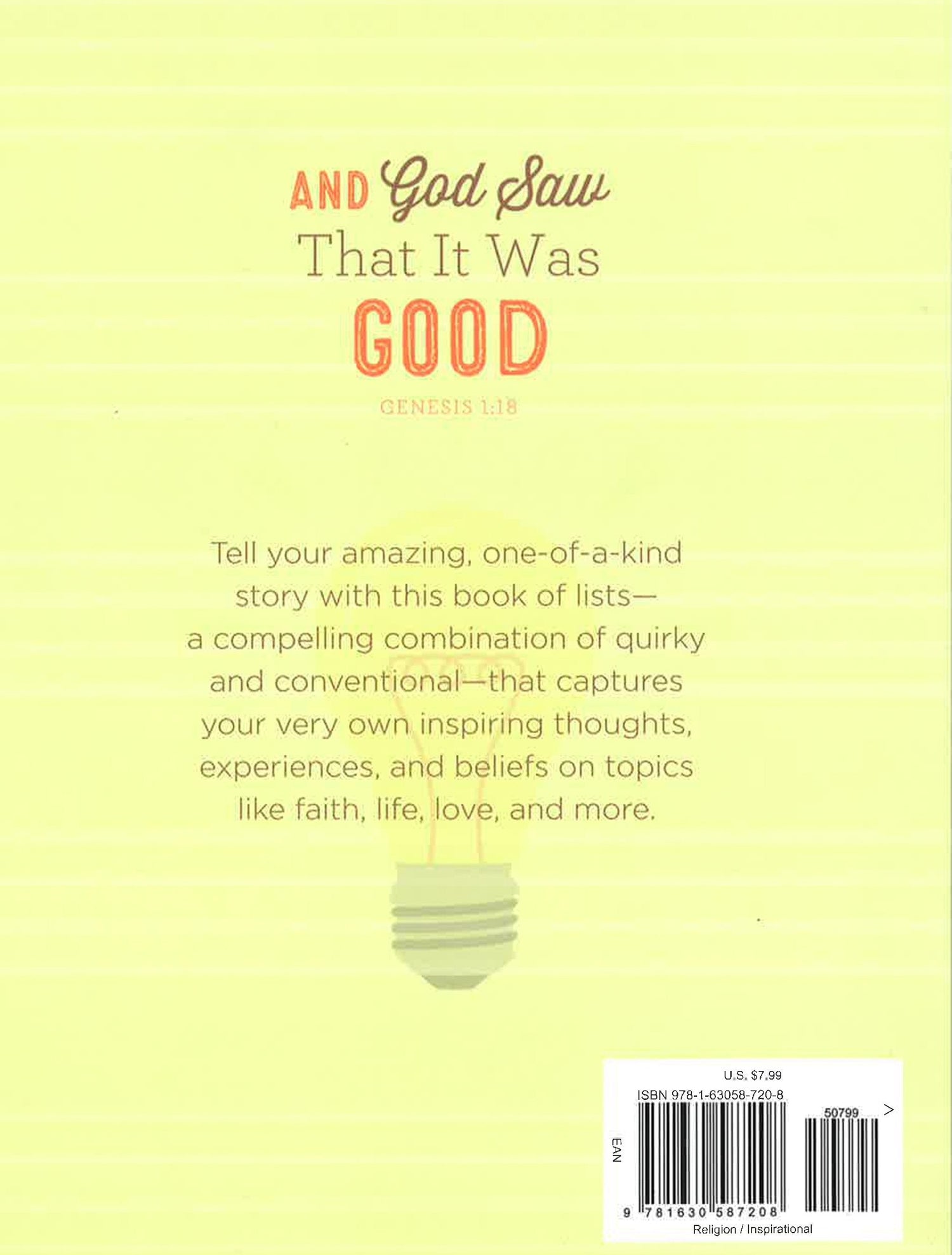This keepsake journal--a compelling combination of quirky and conventional--captures inspiring life lists. Every page features a unique topic about creation, faith, loving others, and more. . .and prompts you to record a list that reflects your personal experiences and beliefs. Once every list is complete, the And God Saw that It Was Good journal will tell your story in an extraordinary way, making this notebook not only a fantastic tool for reflection, but also for sharing a fun and meaningful message with others.