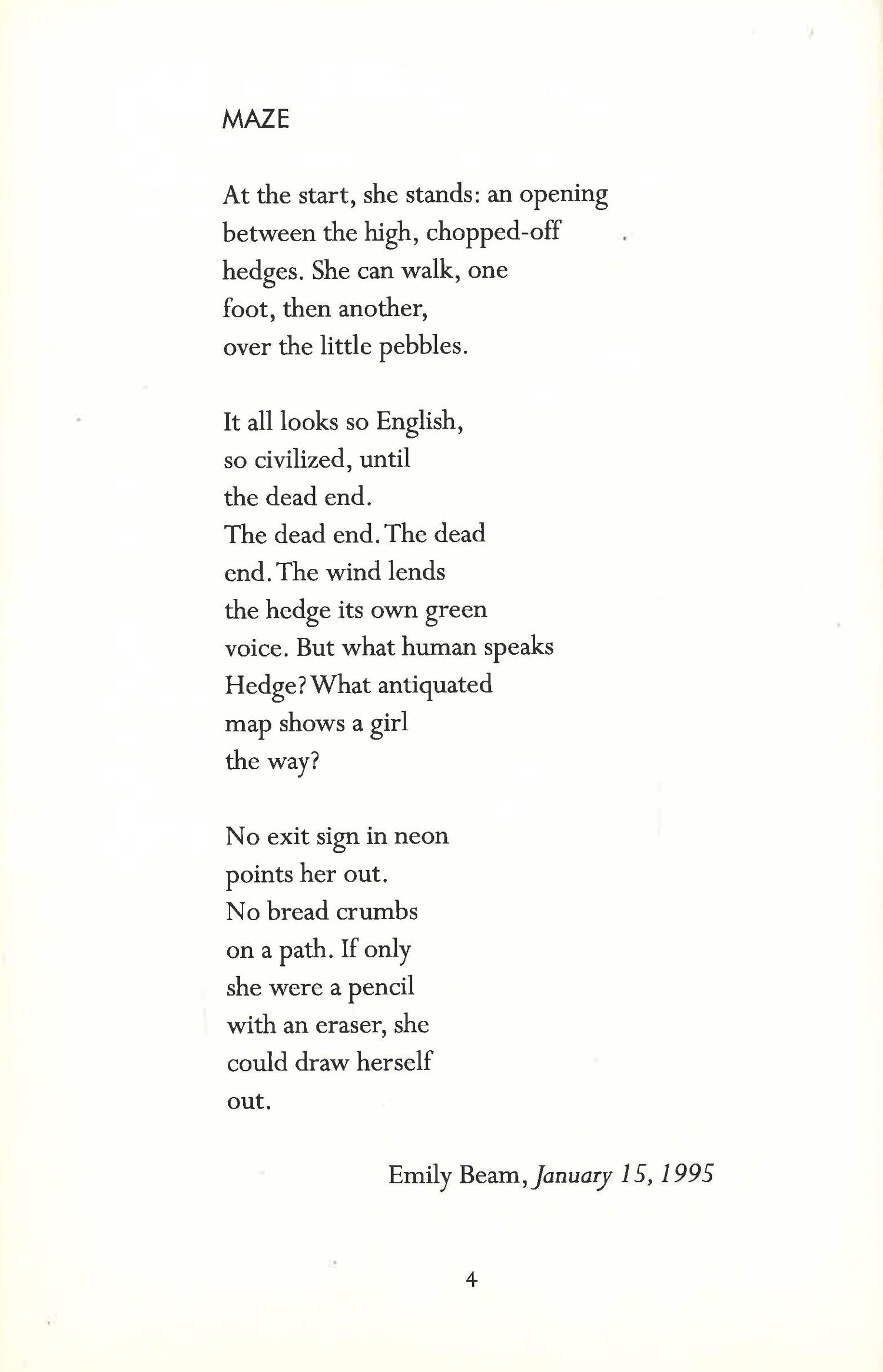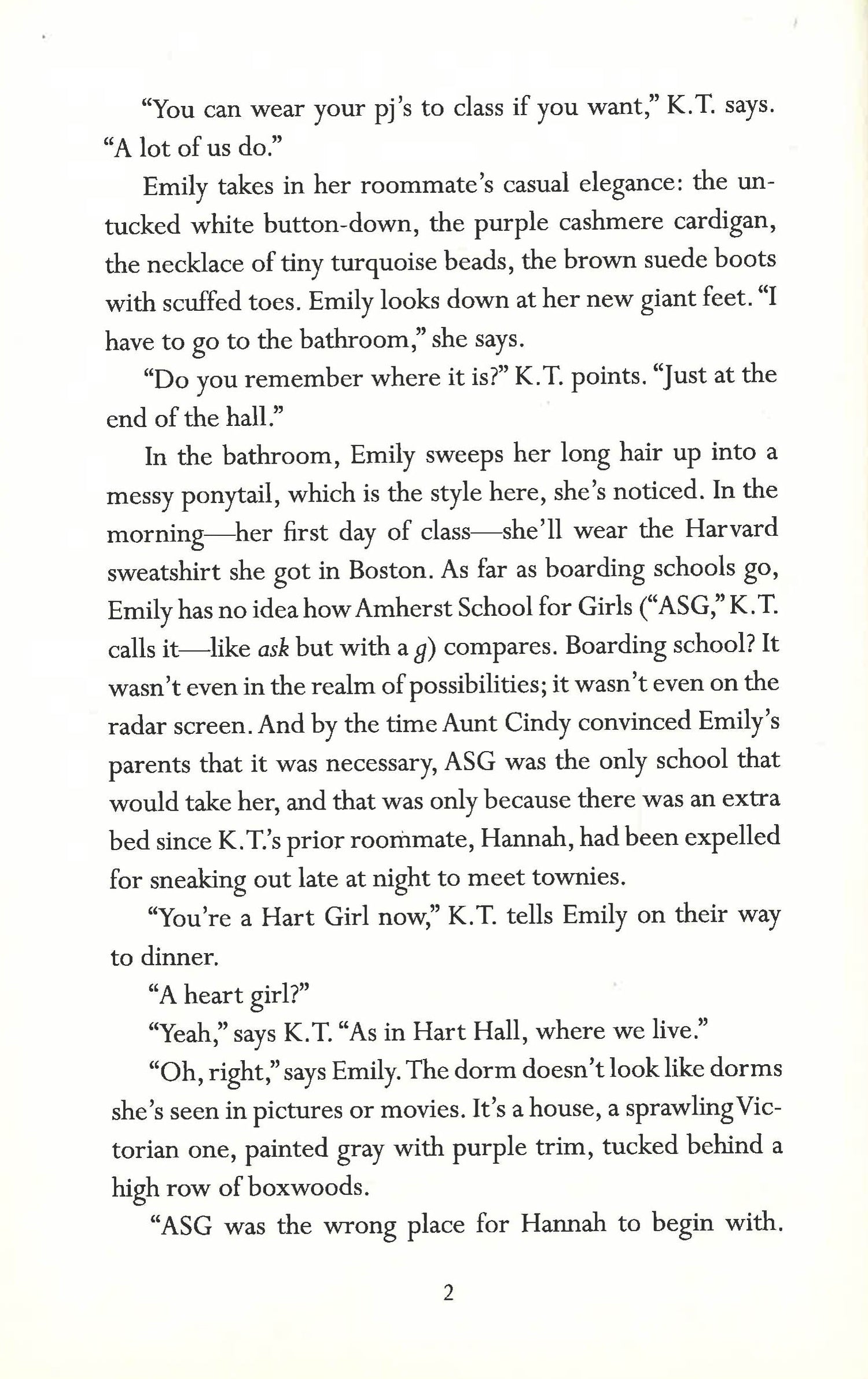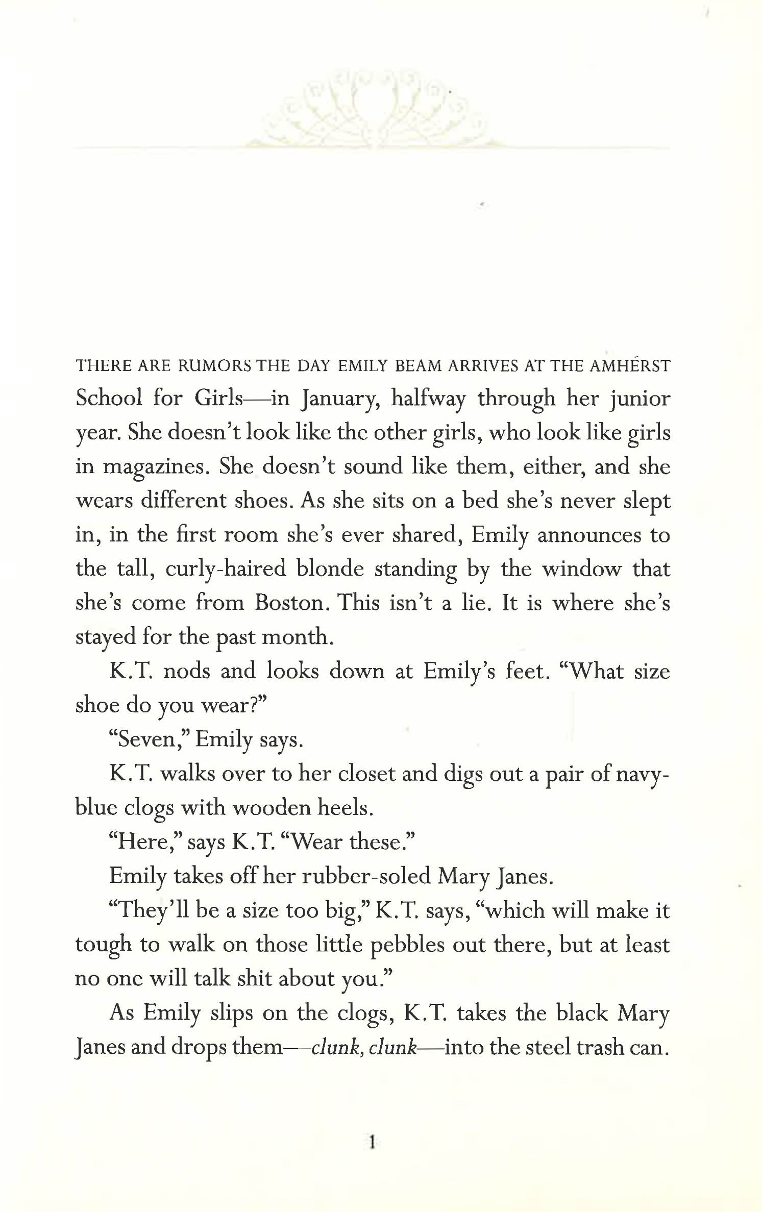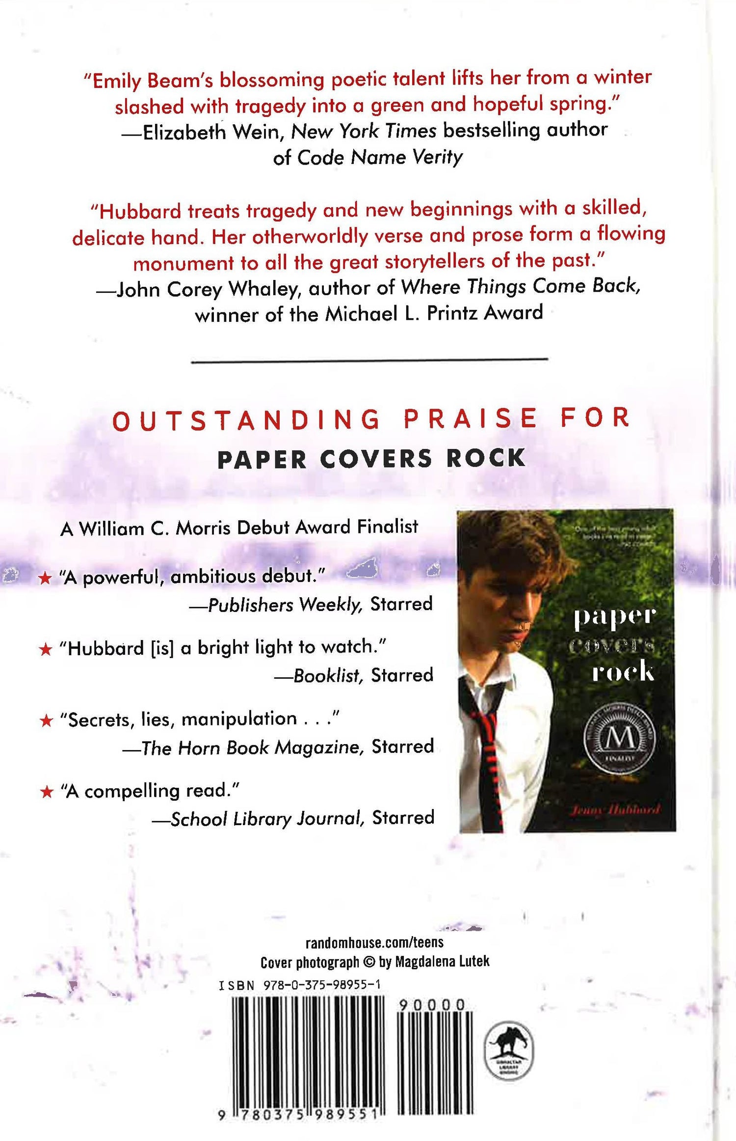 When high school senior Paul Wagoner walks into his school library with a stolen gun, he threatens his girlfriend Emily Beam, then takes his own life. In the wake of the tragedy, an angry and guilt-ridden Emily is shipped off to boarding school in Amherst, Massachusetts, where she encounters a ghostly presence who shares her name. The spirit of Emily Dickinson and two quirky girls offer helping hands, but it is up to Emily to heal her own damaged self. This inventive story, told in verse and in prose, paints the aftermath of tragedy as a landscape where there is good behind the bad, hope inside the despair, and springtime under the snow.