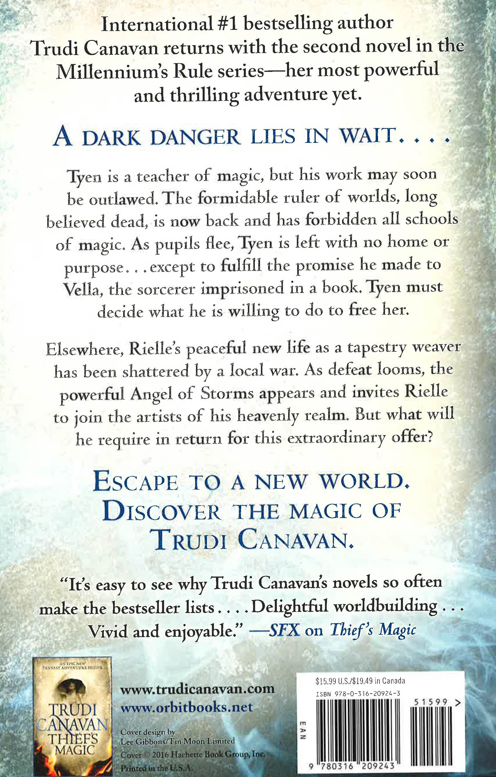 International No.1 bestselling author Trudi Canavan returns with the second novel in the Millennium's Rule series -- her most powerful and thrilling adventure yet. Tyen is teaching mechanical magic at a school respected throughout the worlds. News arrives that the formidable ruler of all worlds, long believed to be dead, is back and enforcing his old laws - including the one forbidding schools of magic. As teachers and students flee, Tyen is left with no home and no purpose...except the promise he made to Vella, the sorcerer imprisoned in a book. Tyen must decide what he is willing to do to free her. After five years among the tapestry weavers of Schpeta, Rielle's peaceful new life has been shattered by a local war. As defeat looms, the powerful Angel of Storms appears and invites Rielle to join the artisans of his celestial realm. But what will he require in return for this extraordinary offer? Escape to a new world. Discover the magic of Trudi Canavan.