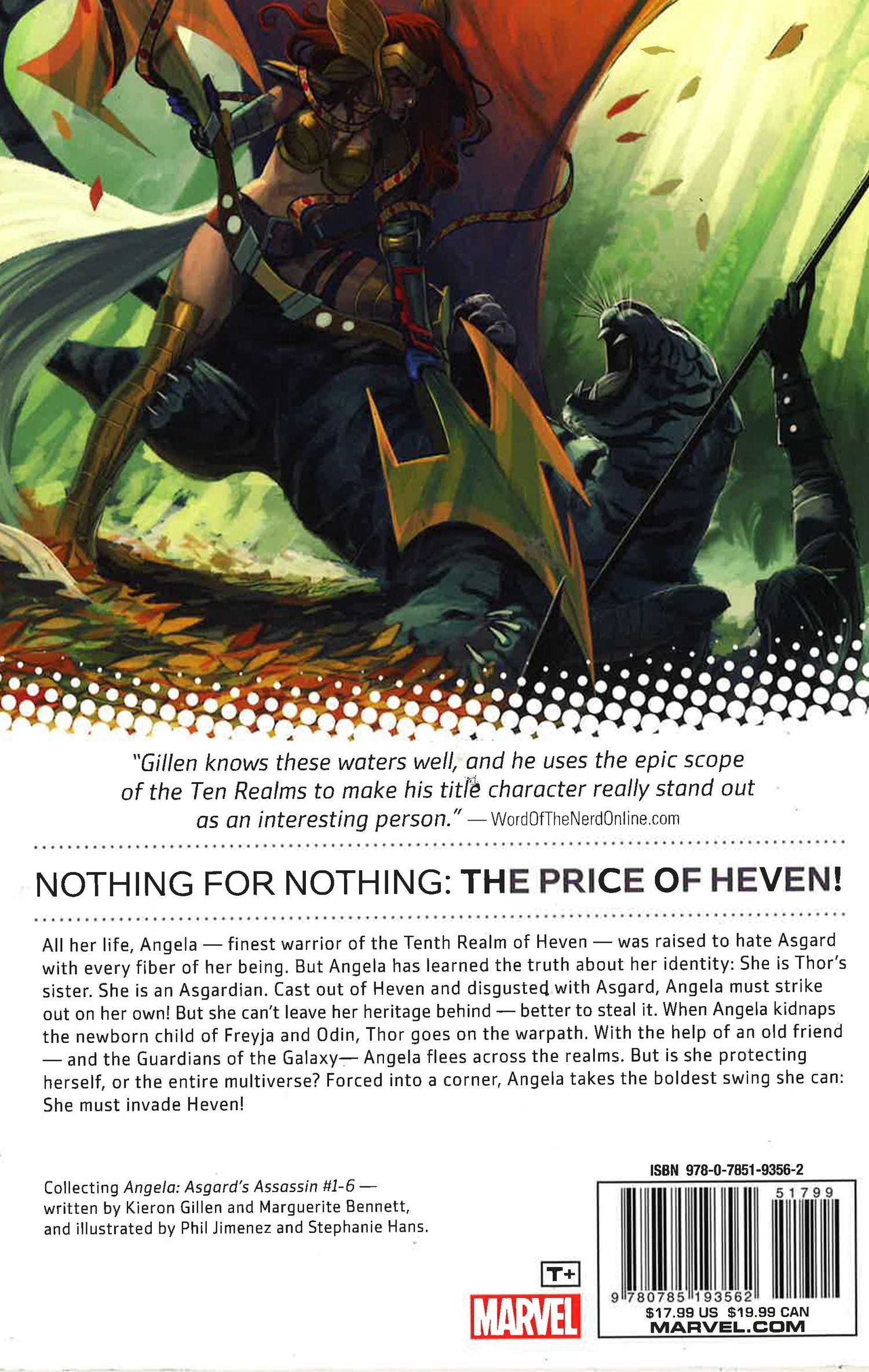 All her life, Angela -- the finest warrior of Heven -- was raised to hate Asgard with every fiber of her being. And now Angela knows the truth about her identity: She is Thor's sister. She is an Asgardian. Cast out of her home and wanting nothing to do with Asgard, Angela must now strike out on her own! But what does Angela have that both Asgard and Heven want? And why are they so eager to get it? Visionary writers Kieron Gillen and Marguerite Bennett team with the legendary art team of Phil Jimenez and Stephanie Hans to finally throw the spotlight onto the Marvel Universe's most dangerous inhabitant!