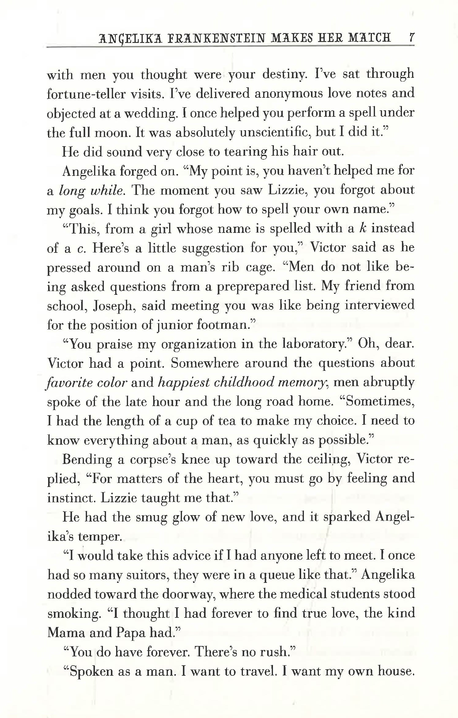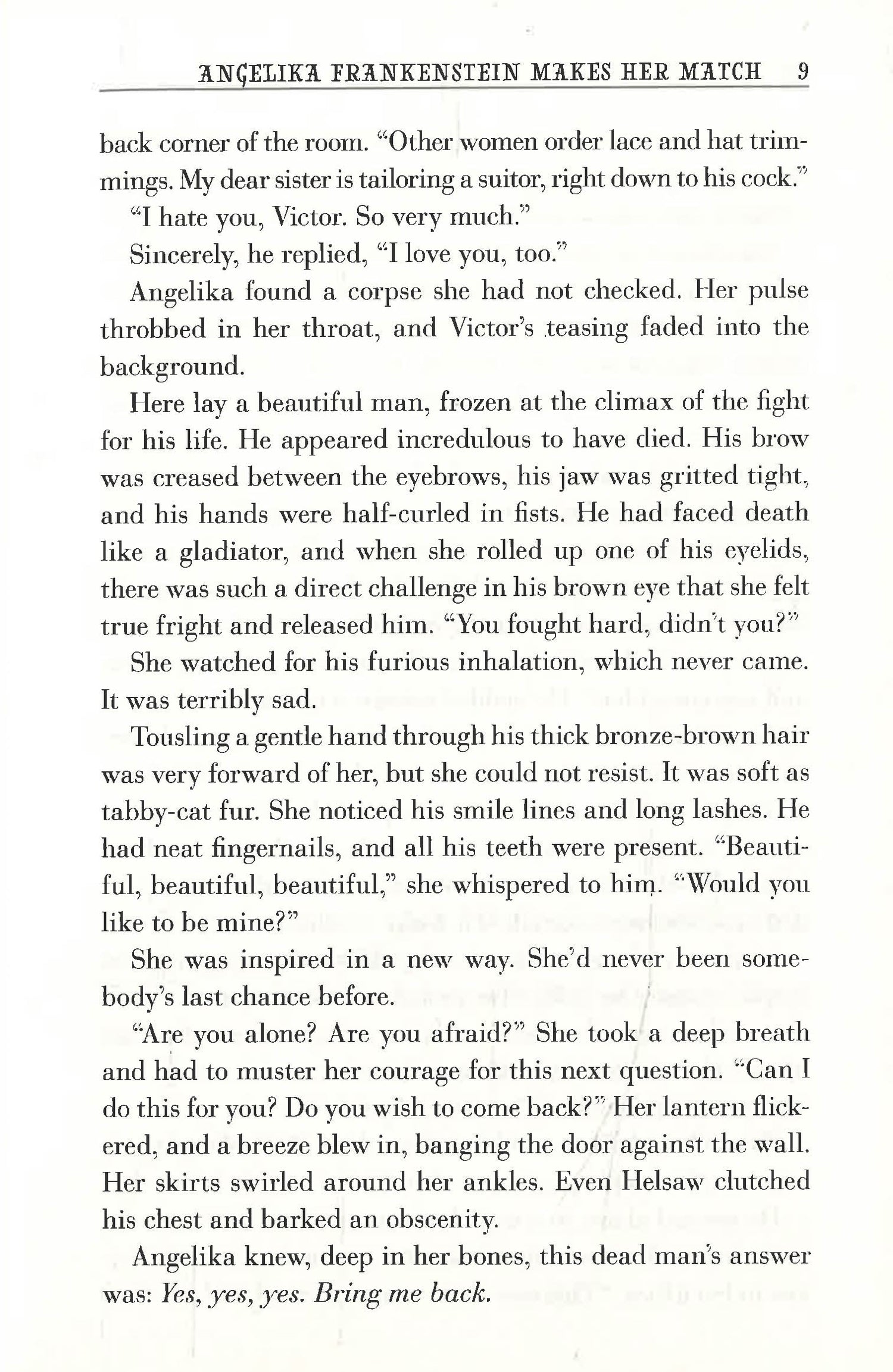 For generations, every Frankenstein has found their true love and equal, unlocking lifetimes of blissful wedded adventure. Clever, pretty (and odd) Angelika Frankenstein has run out of suitors and fears she may become the exception to this family rule. When assisting in her brother Victor’s ground-breaking experiment to bring a reassembled man back to life, she realizes that having an agreeable gentleman convalescing in the guest suite might be a chance to let a man get to know the real her. For the first time, Angelika embarks upon a project that is all her own.