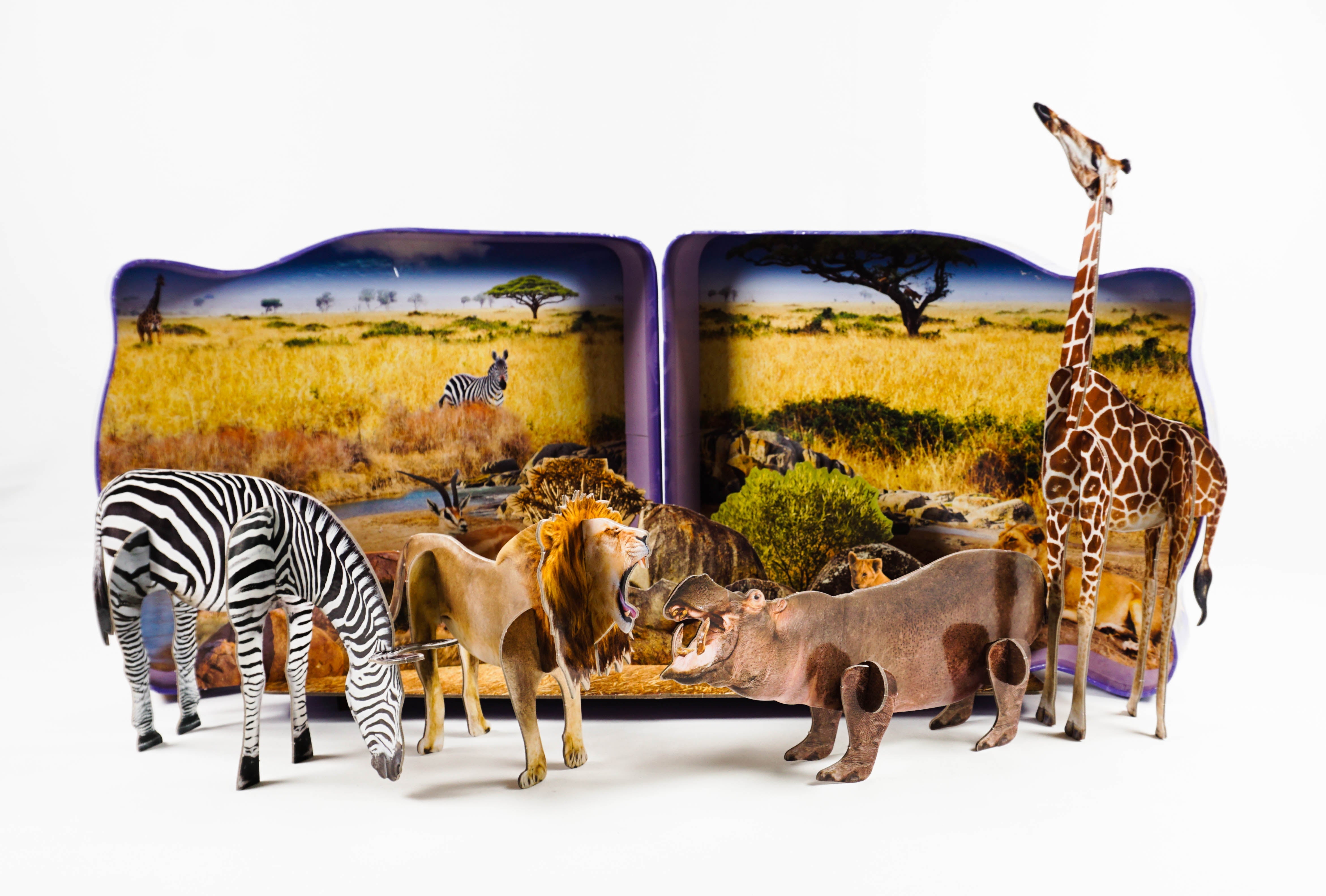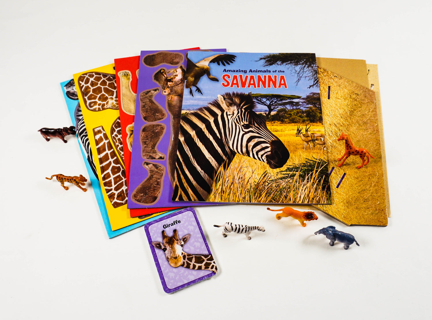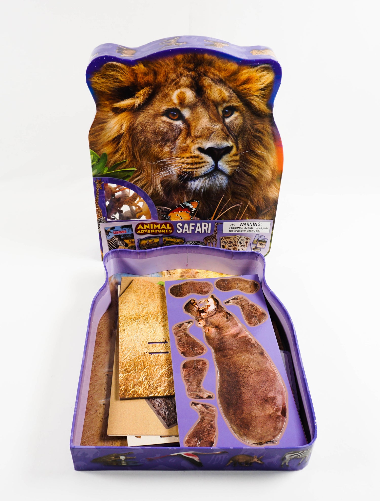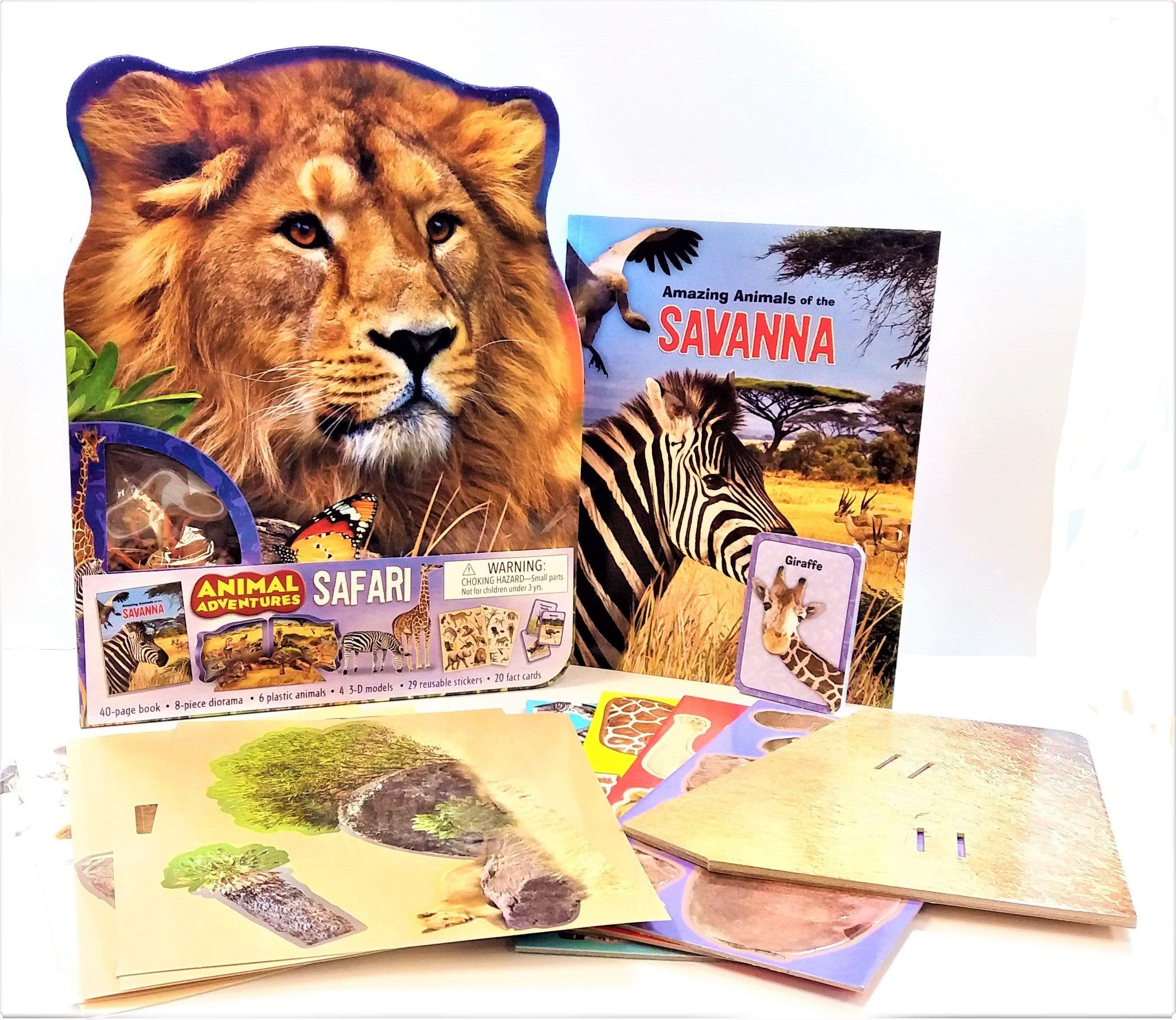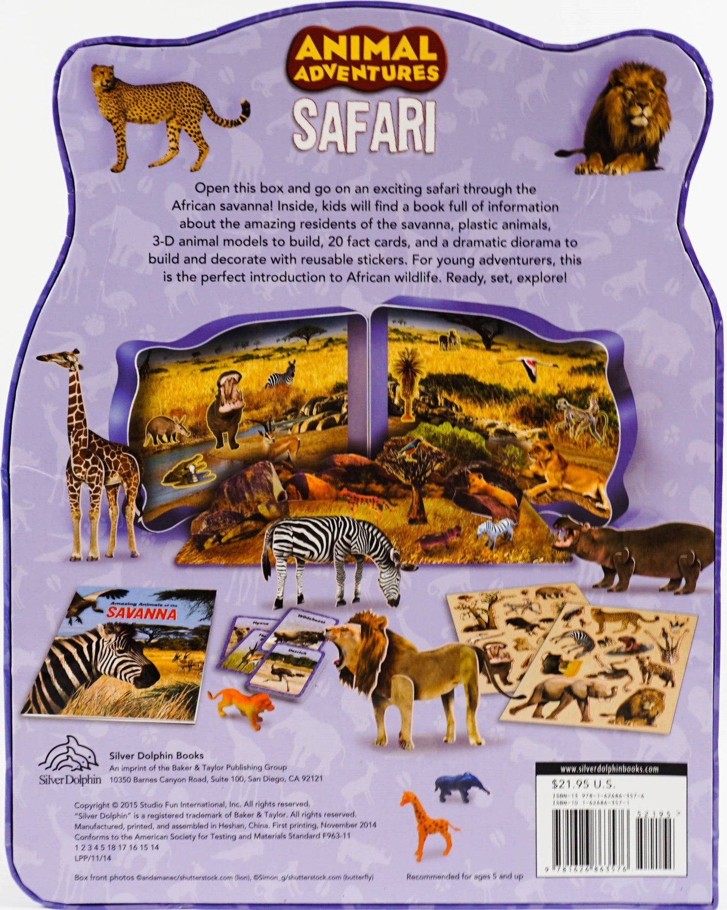 Animal Adventures: Safari will take you on an amazing exotic journey to discover the animals of the savanna. Animal Adventures: Safari will take you on a journey to explore the African savanna. Have fun while learning and see all of your favorite animals like you never have before, with colorful illustrations and fascinating facts, and then by building a diorama. Everything you need to explore the savanna is right here. * This unique set includes a book full of colorful illustrations and intriguing facts about safari animals, plus three-dimensional animal models and a diorama with reusable stickers. * Journey to the African savanna to learn everything you need to know about these fascinating creatures. Animal Adventures: Safari offers a unique learning experience as you meet wild and exotic animals face-to-face.