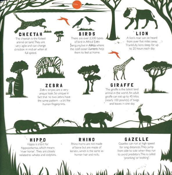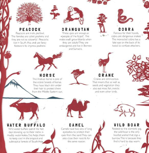 In a world where majestic creatures soar, scutter, prance and pounce through their beautiful natural habitats, astounding discoveries and fascinating facts are just around the corner. Or in the case of this stunningly designed book, just over the page! Sarah Dennis' incredible cut-paper style illustrations bring seven wondrous regions of the world to life, giving you the opportunity to become intrepid explorers as you uncover the native animals hiding in the tree-lined jungles, animated deserts and watery depths of these exciting illustrated scenes.