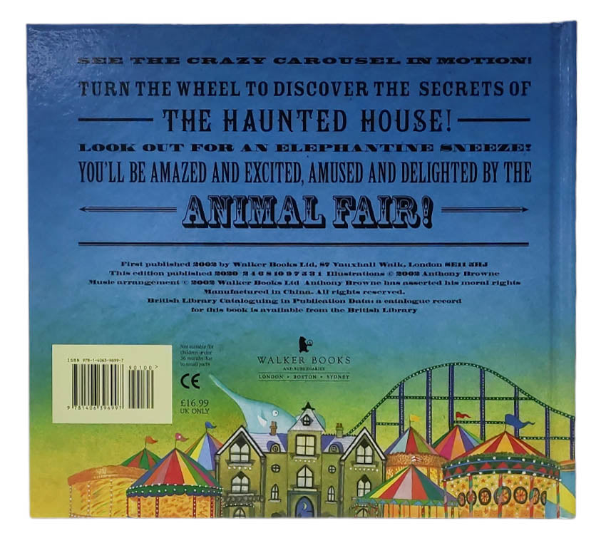 This pop-up interpretation of the well-loved playground rhyme is a fantastical extravaganza of illusion and surreal humour. See the crazy carousel in motion! Turn the wheel to discover the secrets of the haunted house! Look out for an elephantine sneeze! Full of Anthony's Browne's trademark surrealism and captivating detail, with the added thrill of ingenious tabs, flaps and wheels, you'll be amazed and excited, amused and delighted by the Animal Fair!