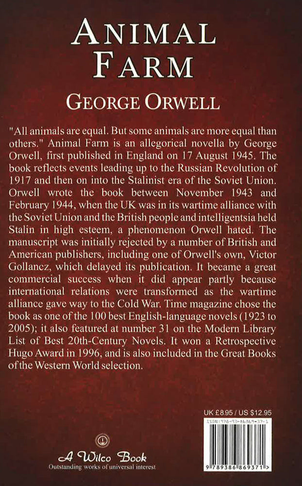 All animals are equal. But some animals are more equal than others. Animal Farm is an allegorical novella by George Orwell, first published in England on 17 August 1945.
