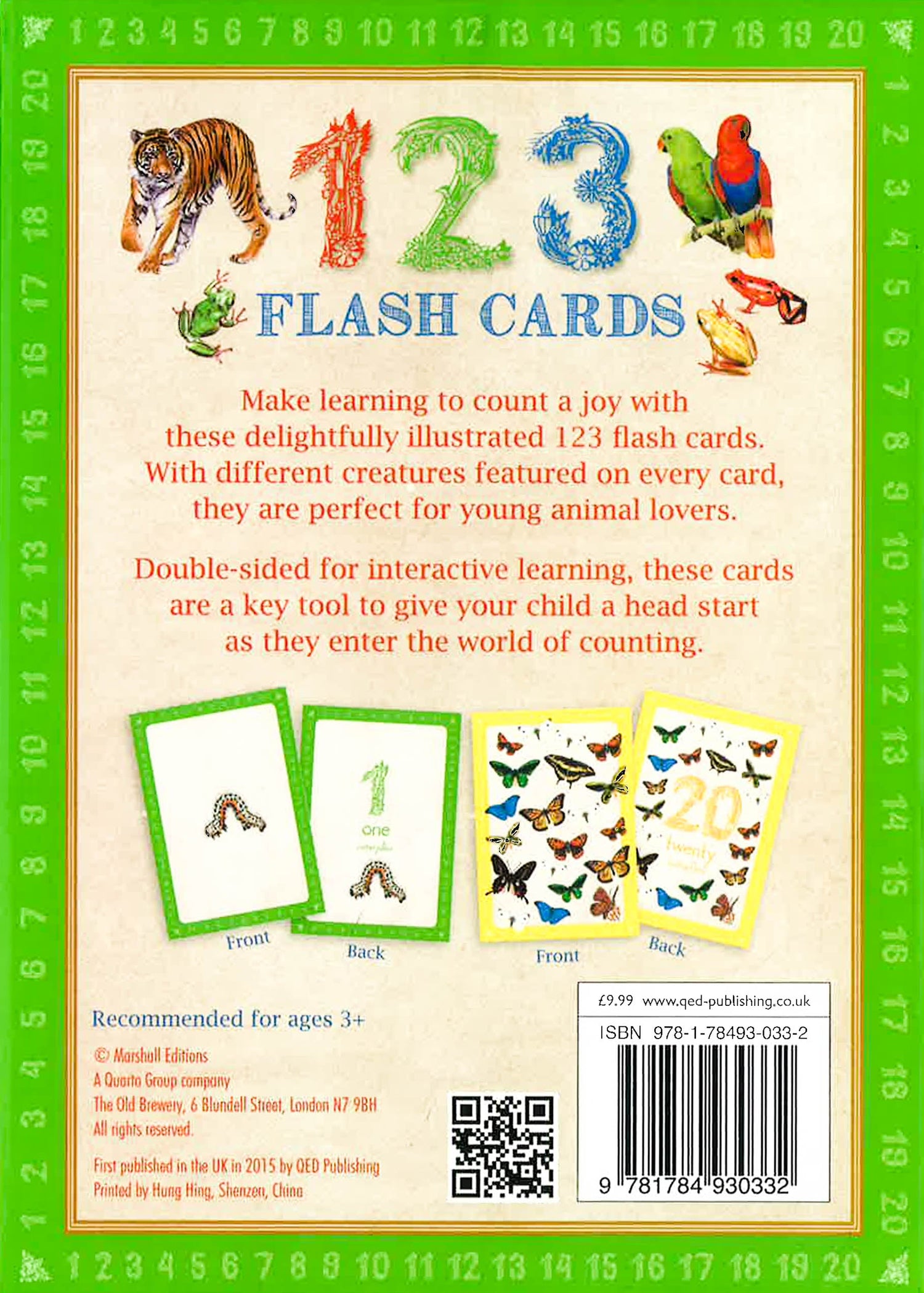 Make learning numbers a joy with these delightfully illustrated flash cards. A key tool to give your child a head start as they enter the world of numbers. Introduces new animals whilst also helping with numeracy and adjectives. Part of a three piece series, Animal Flashcards: 123: 978-1-78493-033-2 ABC: 978-1-78493-093-6 Colours & Opposites: 978-1-78493-094-3