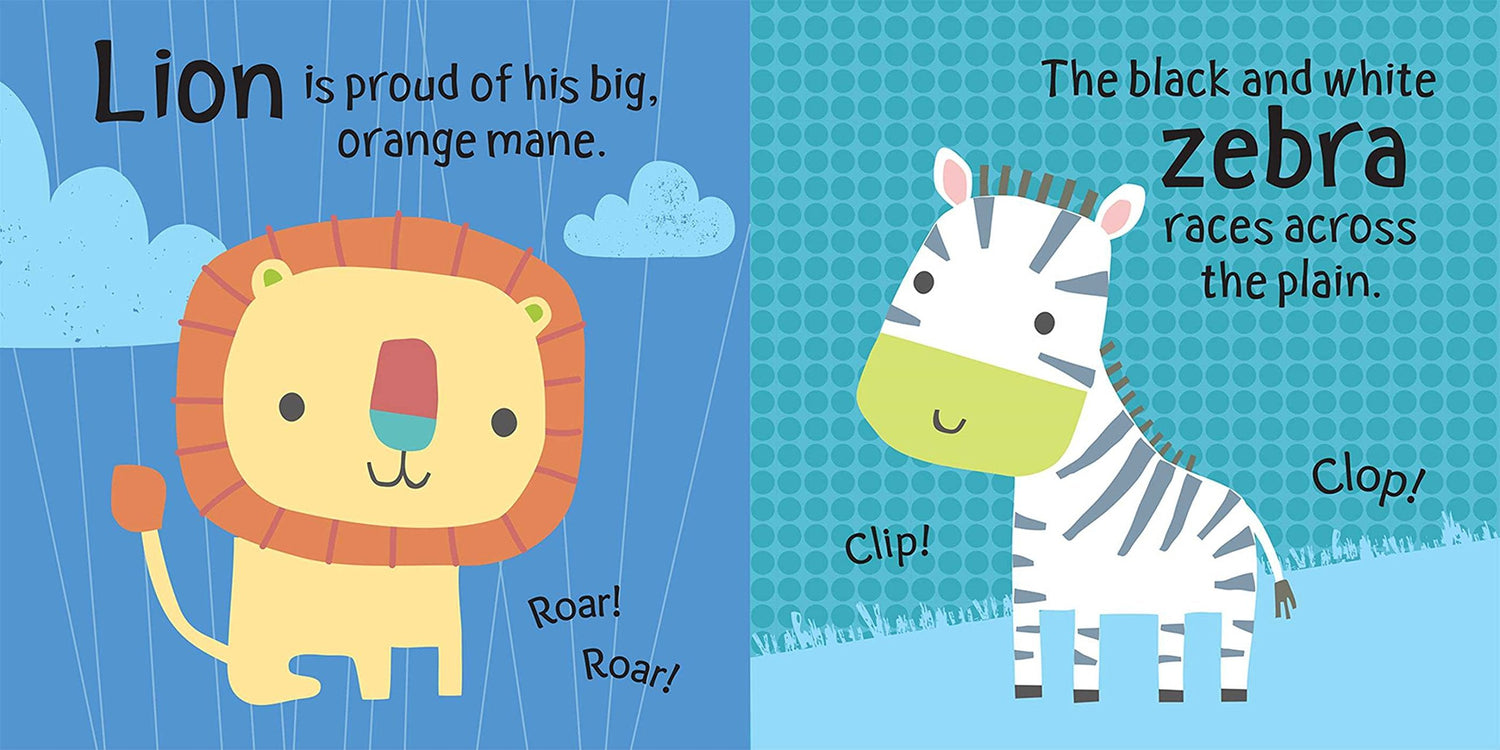 What sounds do the animals make? Go on a safari adventure and find out in this adorable animal board book! Chunky lightweight pages and colorful illustrations capture little ones’ attention while they are introduced to noisy animal friends.