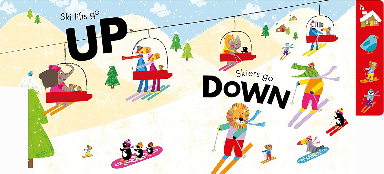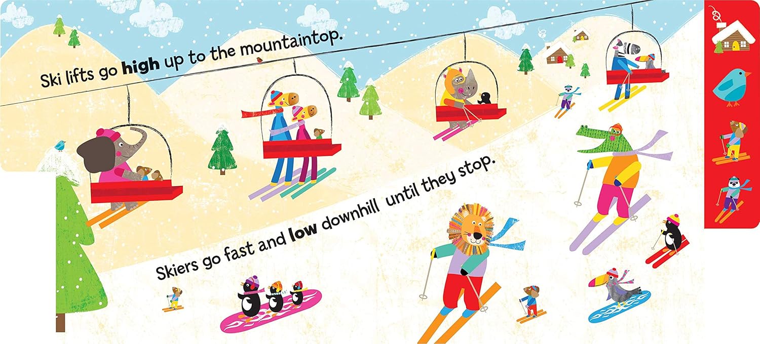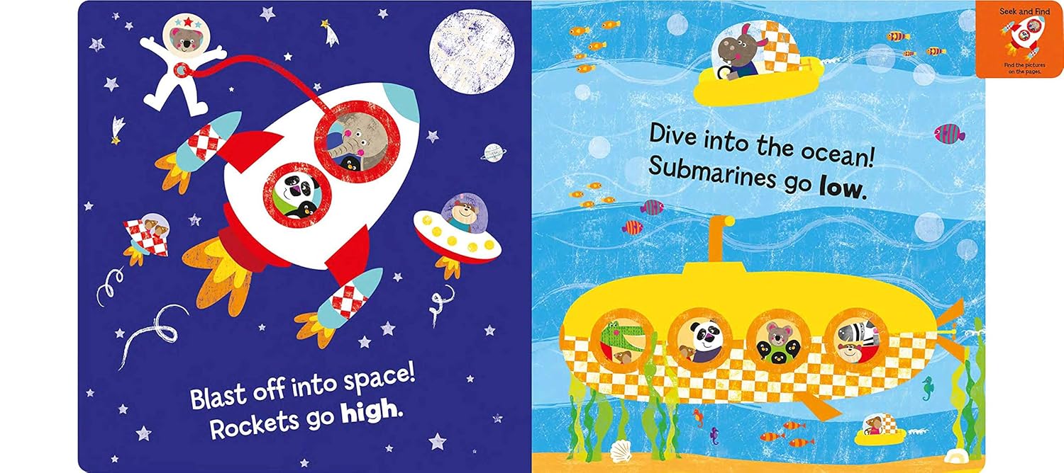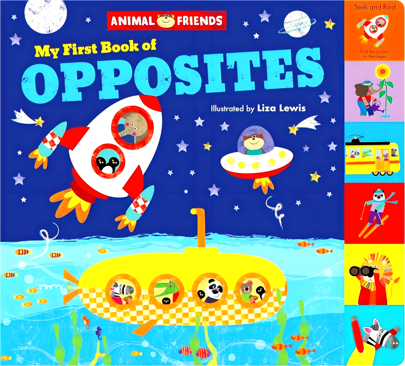Children will learn the concept of opposites with these adorable animal friends! Animal Friends: My First Book of Opposites teaches children the difference between two words using bright and fun illustrations and simple text. Featuring silly animals on every page, youngsters will delight in finding their favorites, while also finding the items on perfectly sized tabs for little fingers. From a rocket blasting off high into space and a submarine diving low into the ocean, to ski lifts that climb up the mountain and skiers that race down, this is a wonderful introduction to basic concepts.