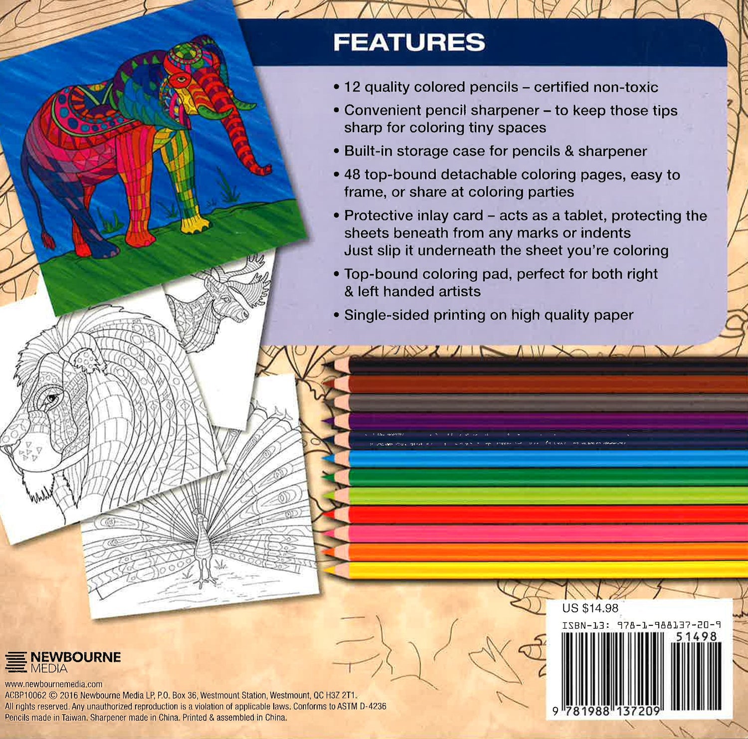 12 quality colored pencils-certified non toxic -convenient pencil sharpener-48 top bound detachable coloring pages, easy to frame, or share at coloring parties, protective inlay card-acts as acts as a tablet protecting sheets beneath from any marks or indents.Single sided and printed on high quality paper-perfect for both right & left handed artists