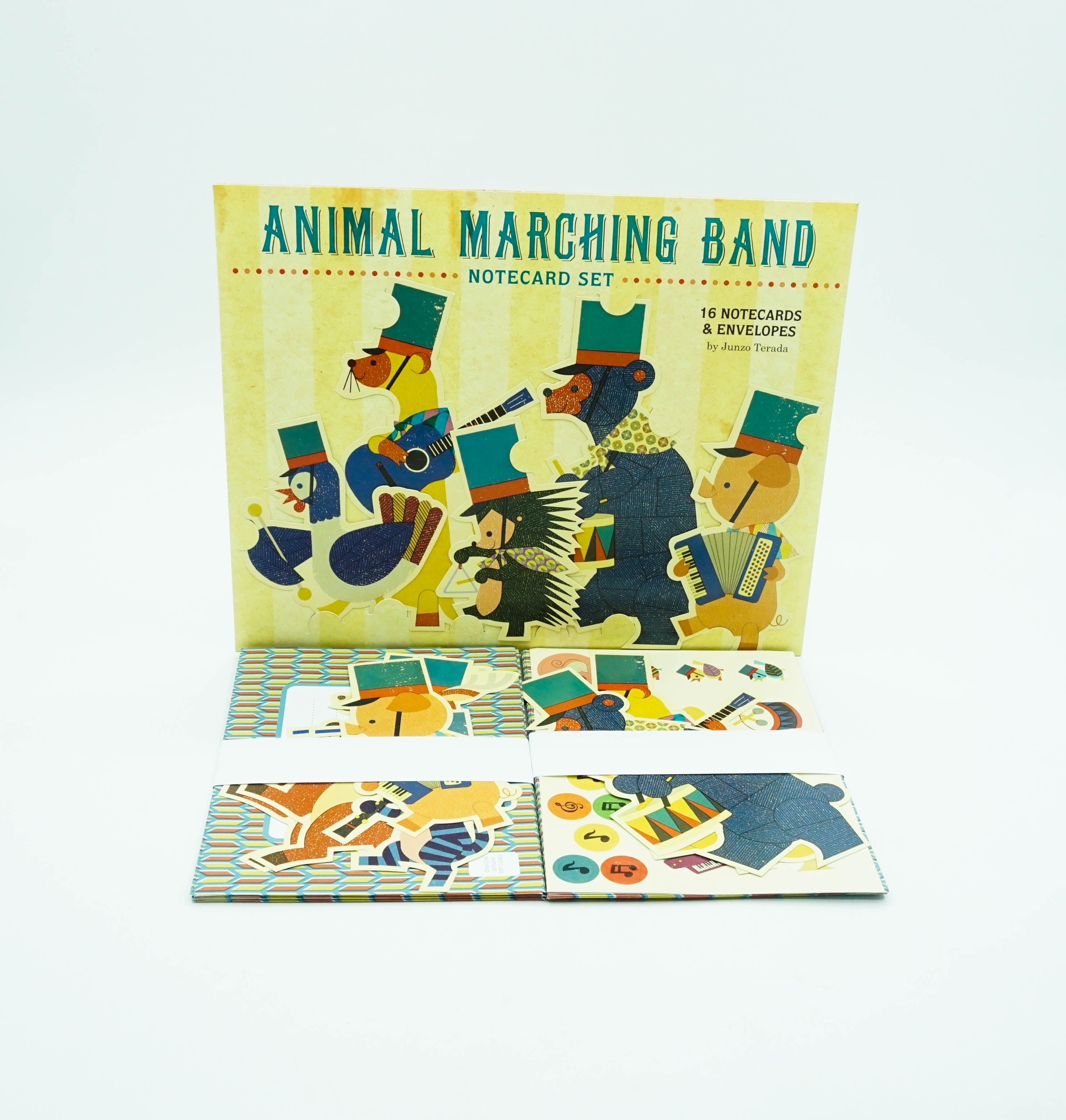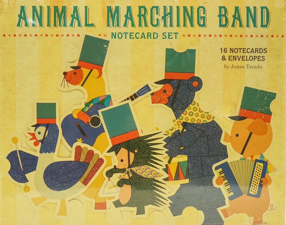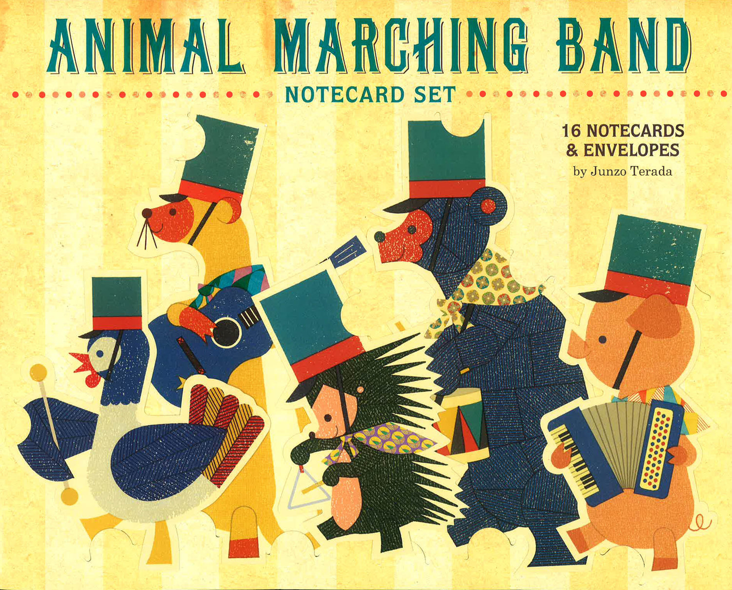 A set of 16 die-cut notecards in the shape of Junzo Terada's adorable animals! The package includes eight different designs repeating twice, plus a sticker sheet. [Animals on Parade format.