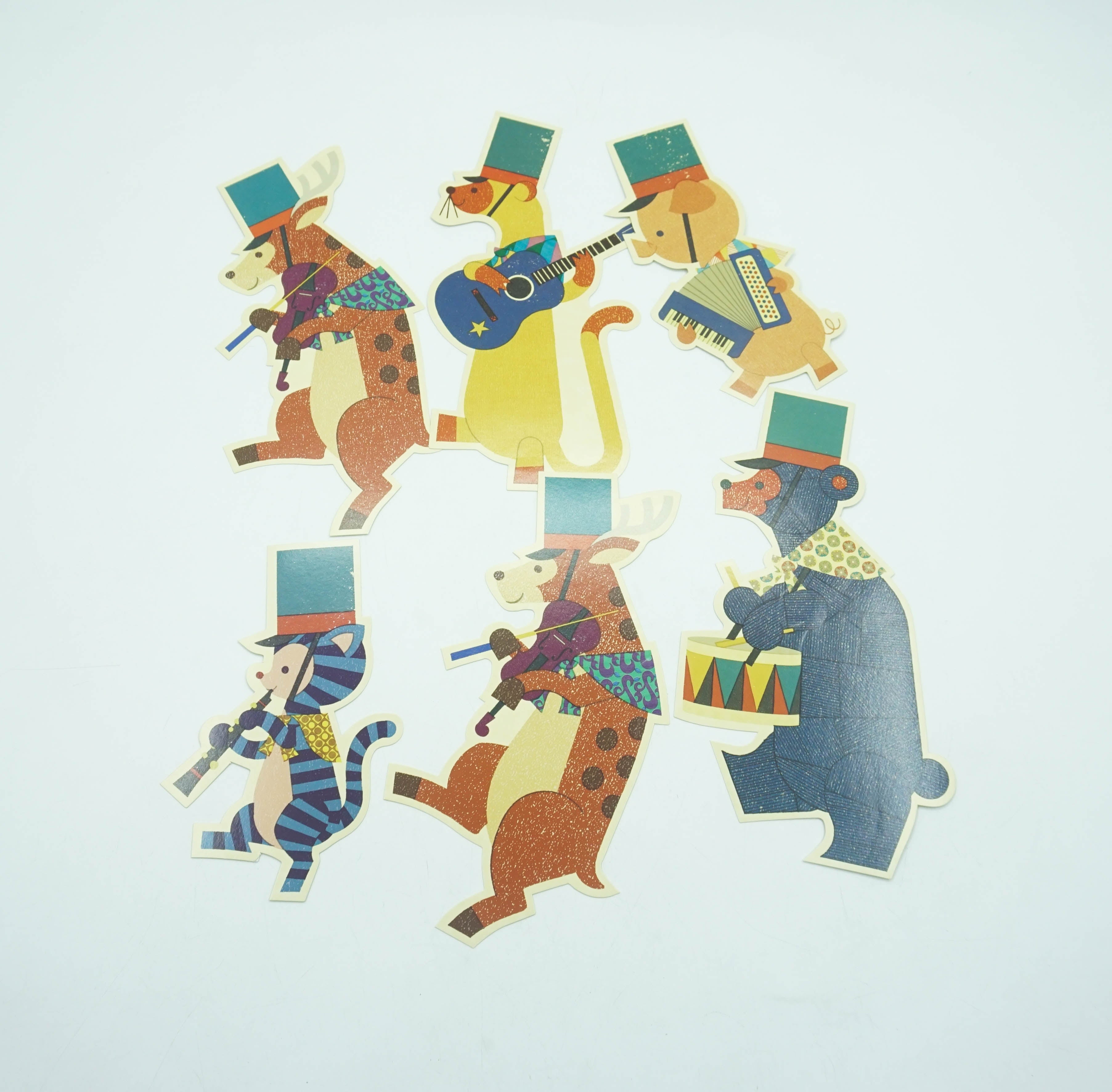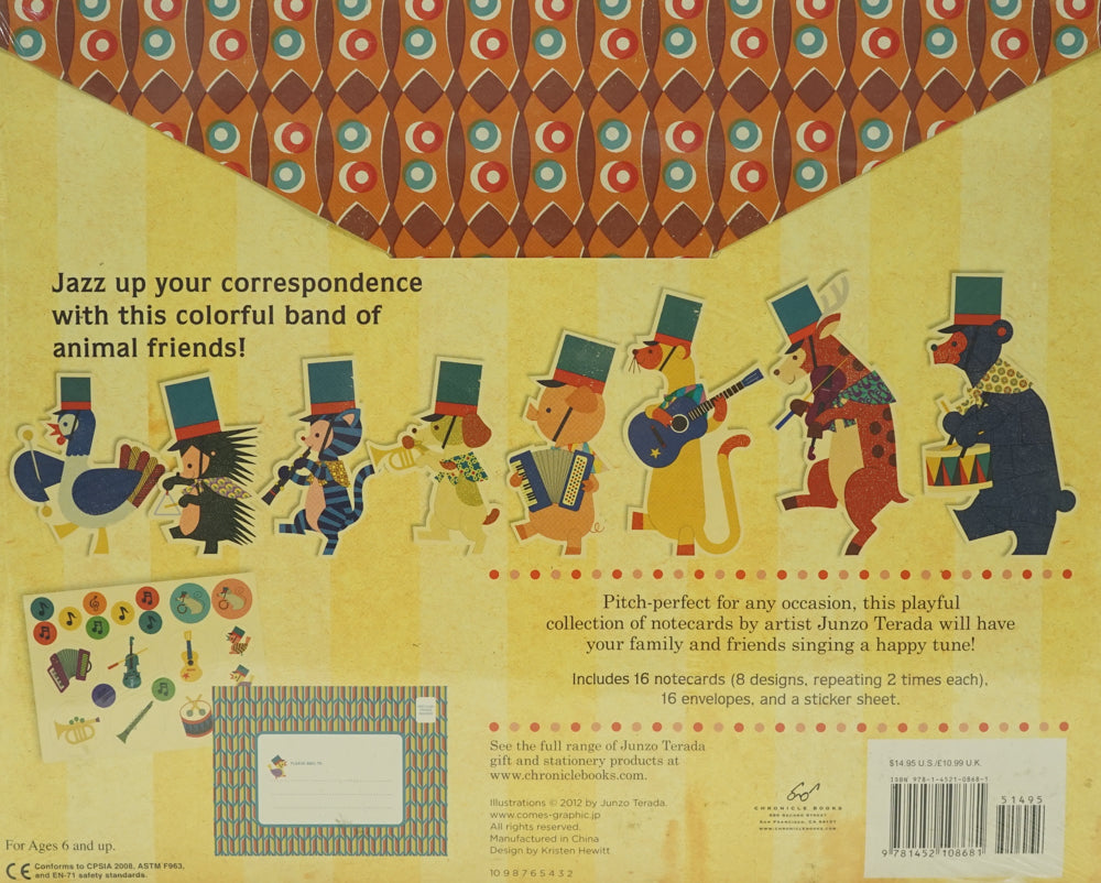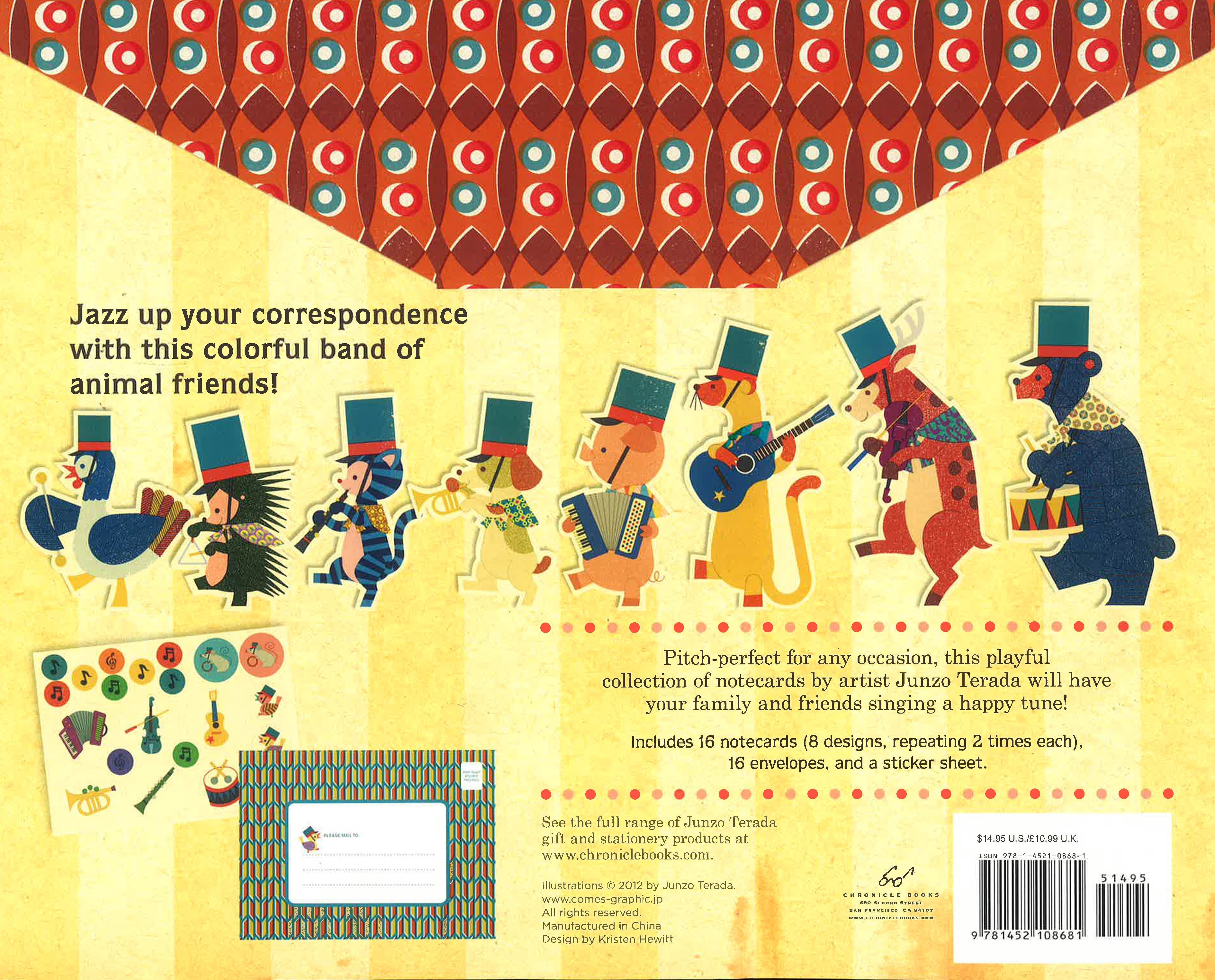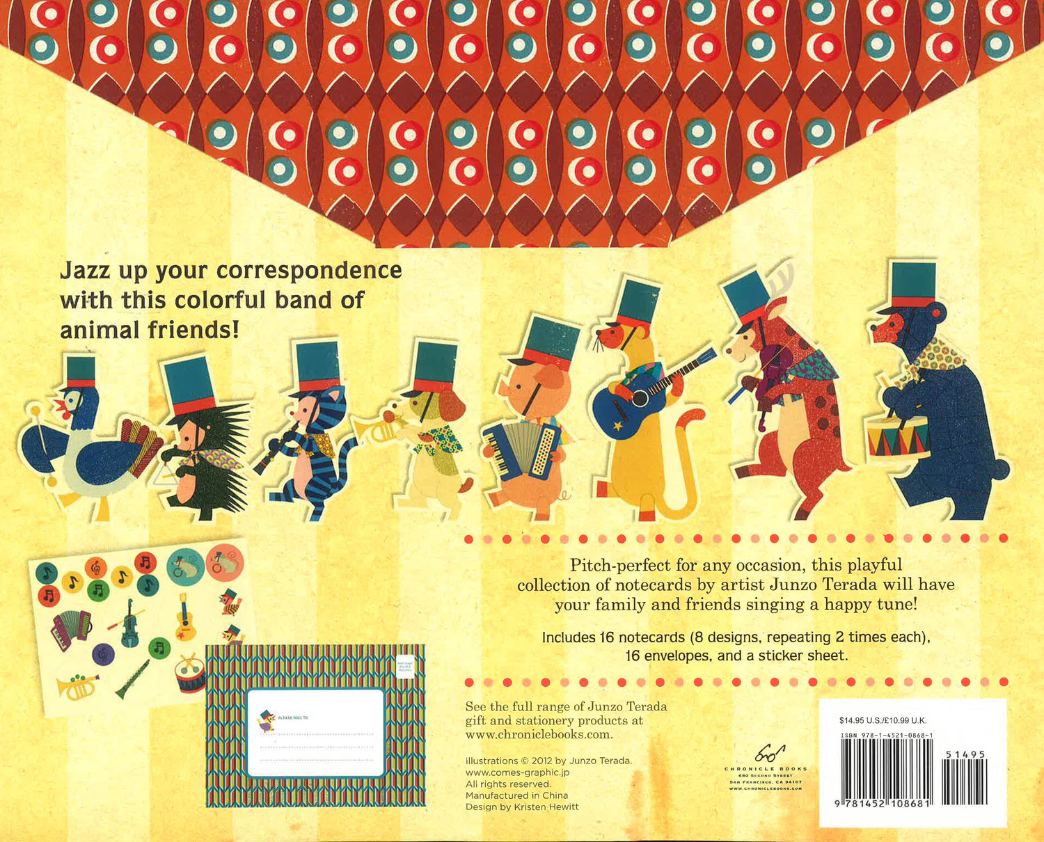 A set of 16 die-cut notecards in the shape of Junzo Terada's adorable animals! The package includes eight different designs repeating twice, plus a sticker sheet. [Animals on Parade format.