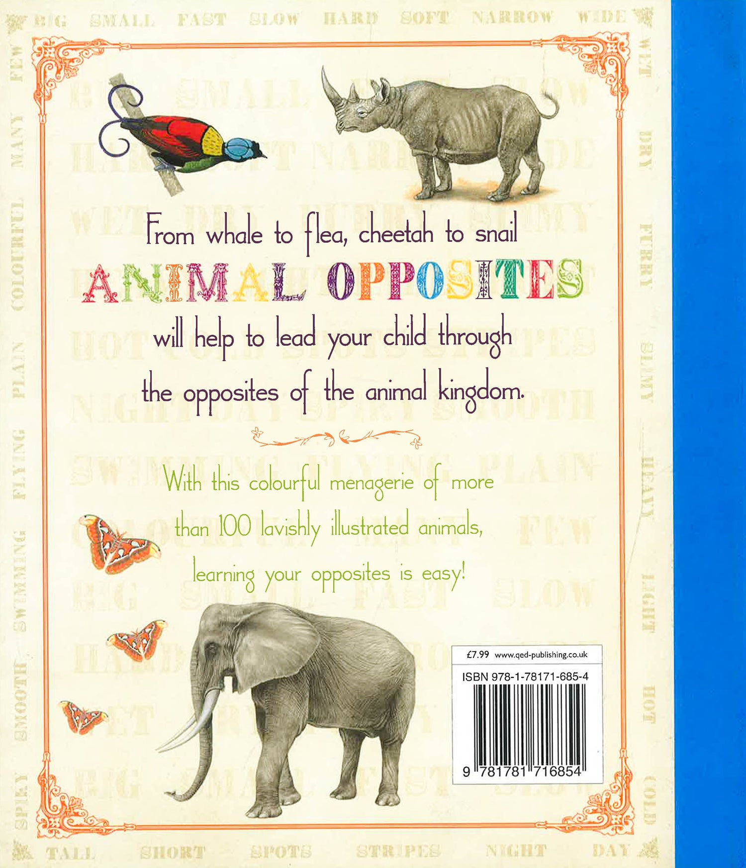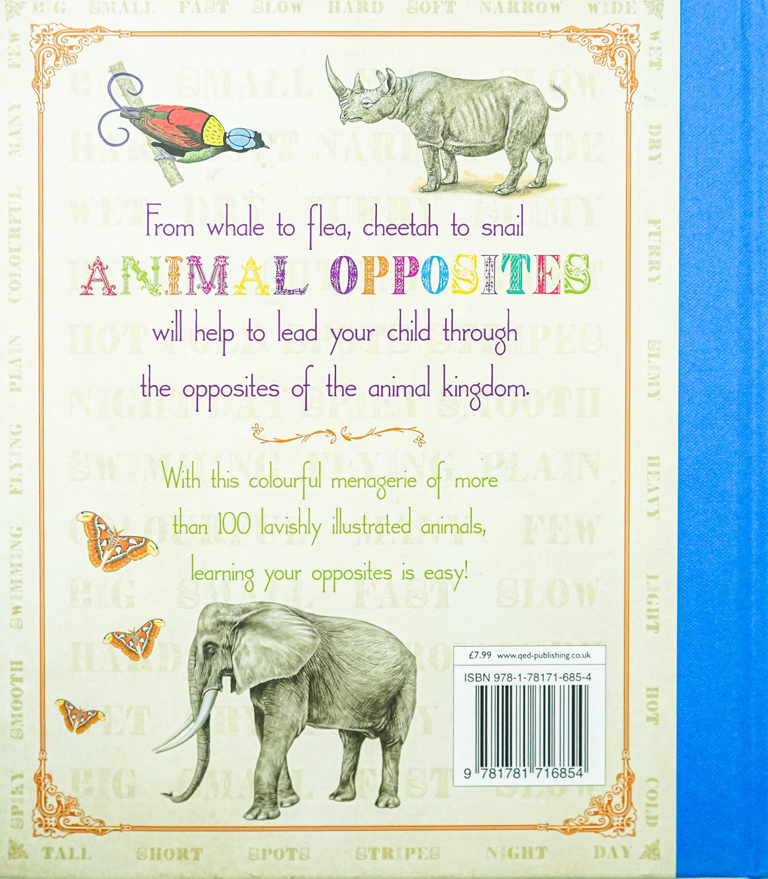 Featuring beautiful illustrations throughout and covering animals from whale to flea, cheetah to snail, Animal Opposites will help to lead your child through the opposites of the animal kingdom. Introducing adjectives and their opposites, such as 'wet' and 'dry' whilst also including more than 100 lavishly illustrated animals, learning your opposites is easy and enjoyable!