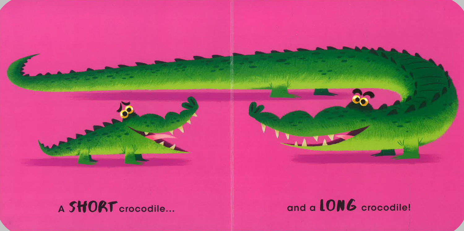 Meet a short crocodile and a long crocodile, a small elephant and a big elephant, and a happy dog and a sad dog, as these fantastic animals introduce you to simple opposite terms!