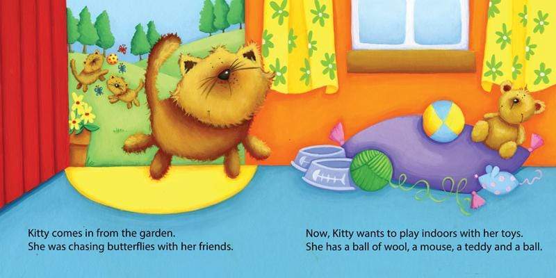 Kitty plays in the garden with the butterflies and then plays inside with a ball of yarn. When she is tired, she sleeps in front of the warm fireplace. Sleep well, Kitty.