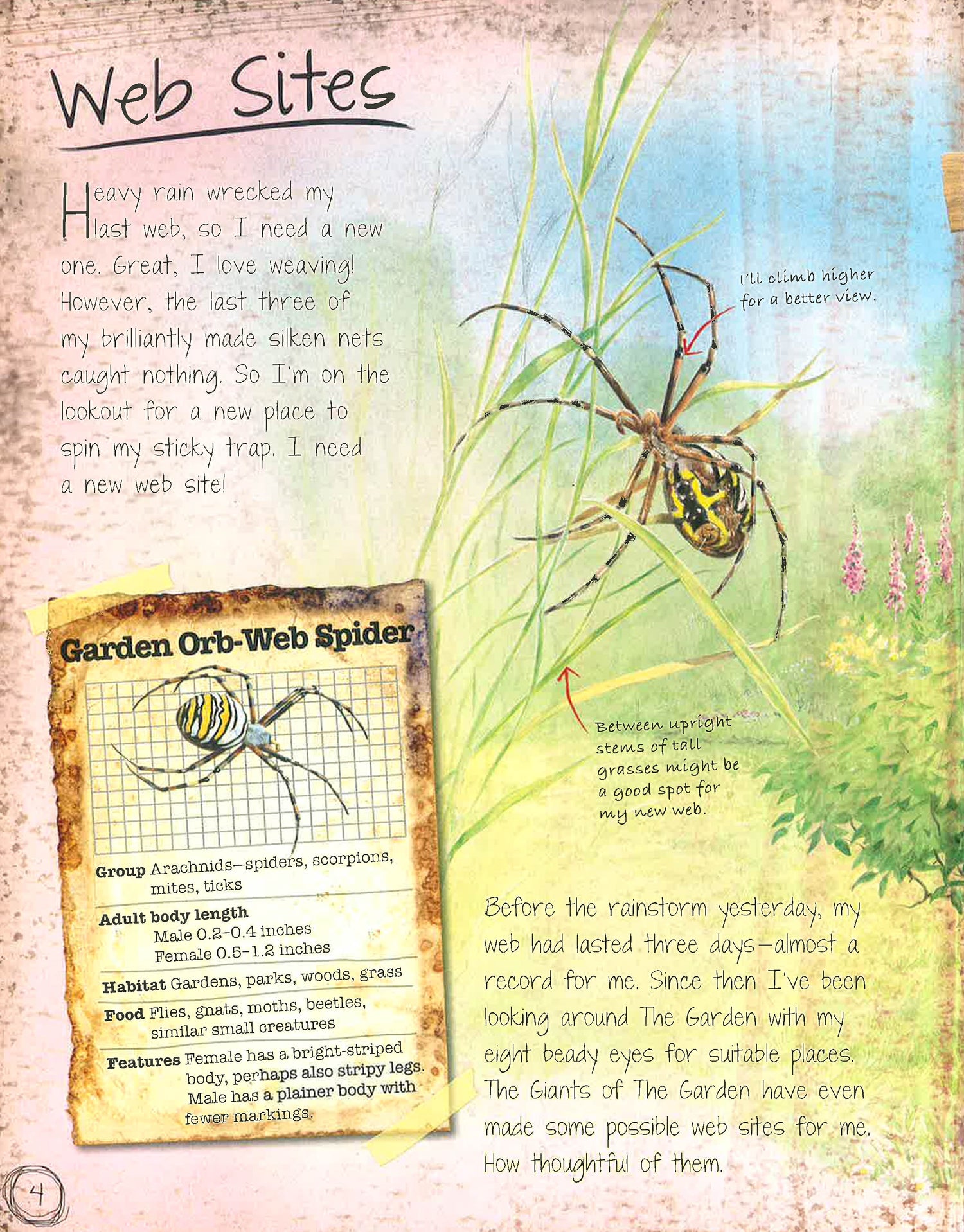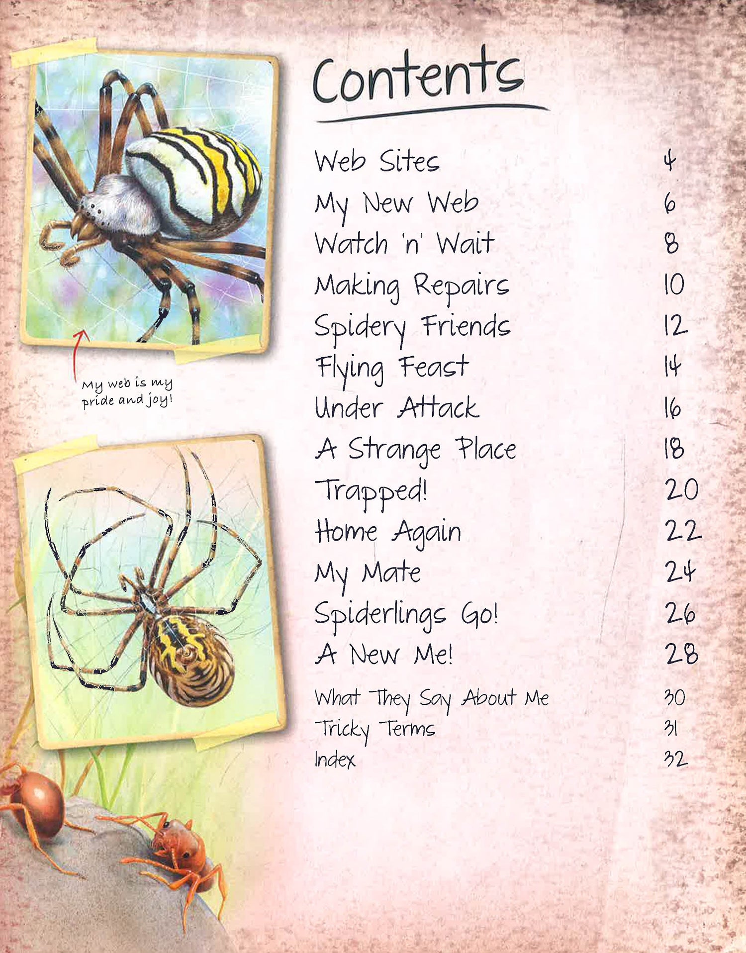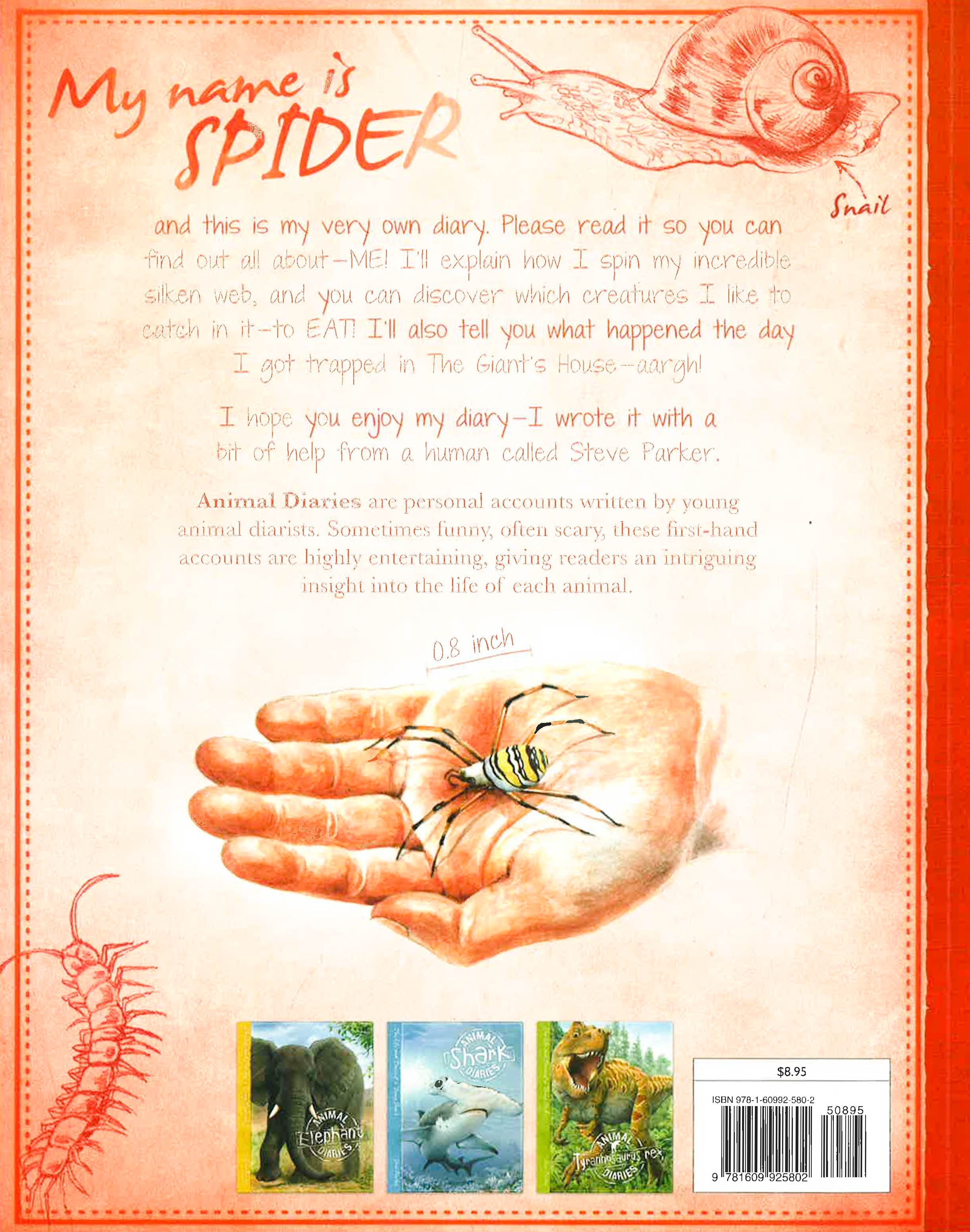 My name is Spider and this is my very own diary. Please read it so you can find out all about? ME! I?ll explain how I spin my incredible silken web, and you can discover which creatures I like to catch in it ? to EAT! I?ll also tell you what happened the day I got trapped in The Giant?s House ? aargh! I hope you enjoy my diary ? I wrote it with a bit of help from a human called Steve Parker.Animal Diaries are personal accounts written by young animal diarists. Sometimes funny, often scary, these first-hand accounts are highly entertaining, giving readers an intriguing insight into the life of each animal.Each book is a mixture of diary entries, informative extracts, sketches and fact-filled animal profile cards.Books are packed full of interesting information on the animals? habitat, diet, different stages of life and interaction with other animals.Incredibly vivid illustrations let young readers feel like they are immersed in the lives of the diarists, and may encourage them to start documenting their own adventures.