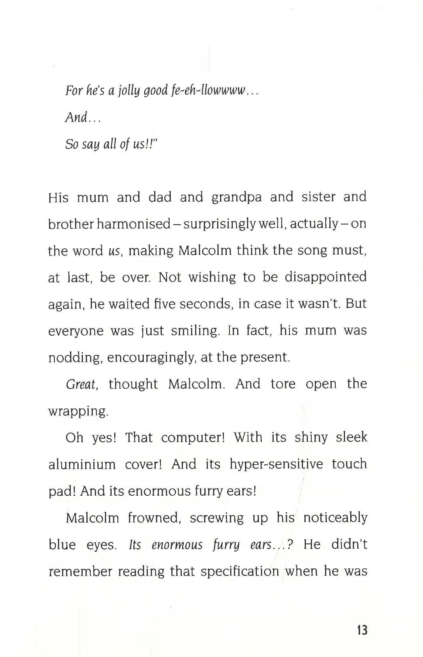 Which is a problem because his family love them. Their house is full of pets. What the house is NOT full of is stuff Malcolm likes. Such as the laptop he wanted for his birthday.