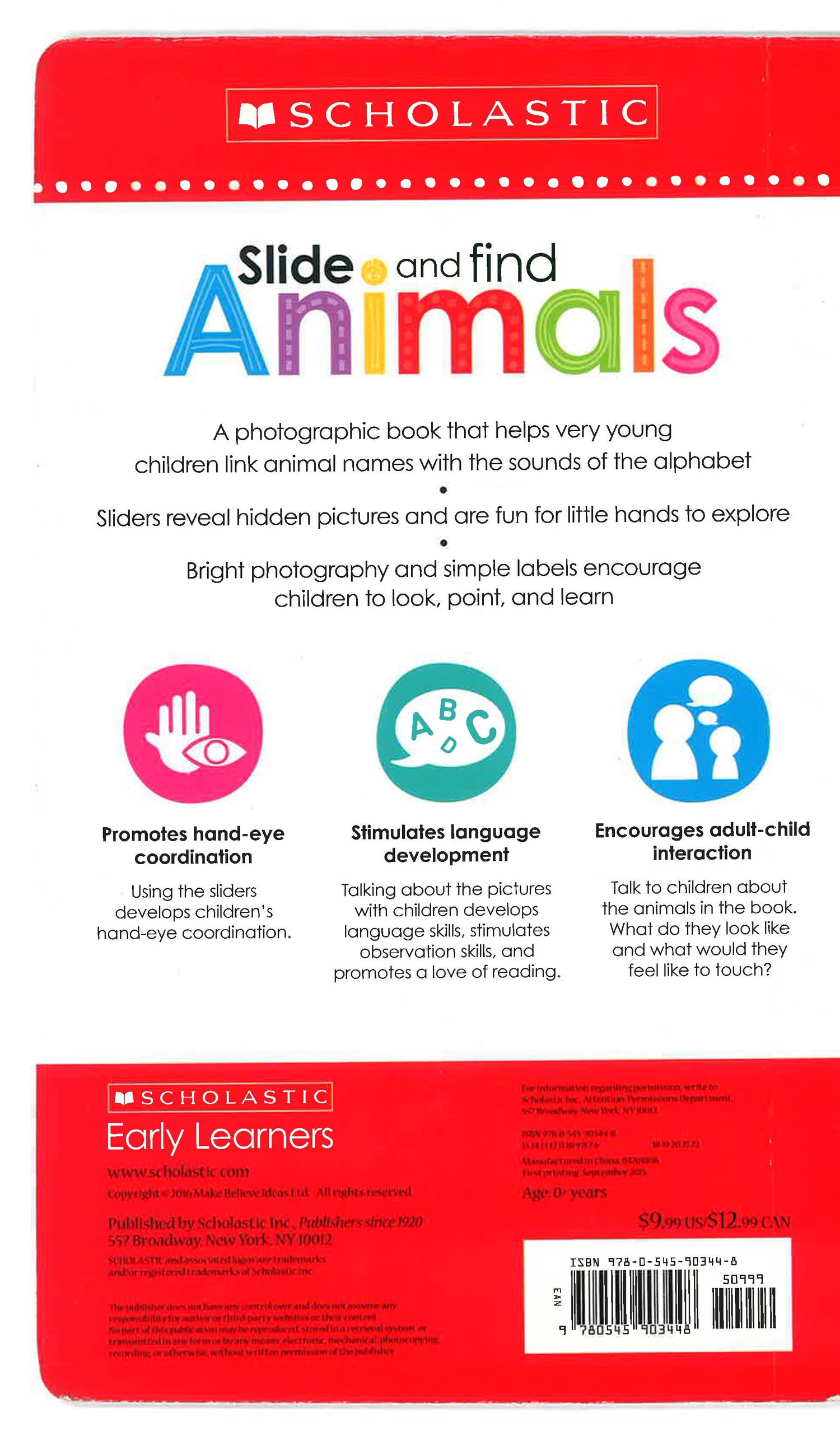 Scholastic Early Learners: Interactive books for hands-on learning. Perfect for babies, toddlers, preschoolers, kindergarteners, and first graders, too!. With vivid photography of animals and fun, slide-and-find pictures, children will love exploring this book while practicing the letters of the alphabet! Each page of this entertaining book features easy-to-use sliders that move to reveal different animals, animal words, and animal noises for each letter of the alphabet. Scholastic Early Learners: Interactive books for hands-on learning. Perfect for babies, toddlers, preschoolers, kindergarteners, and first graders, too!