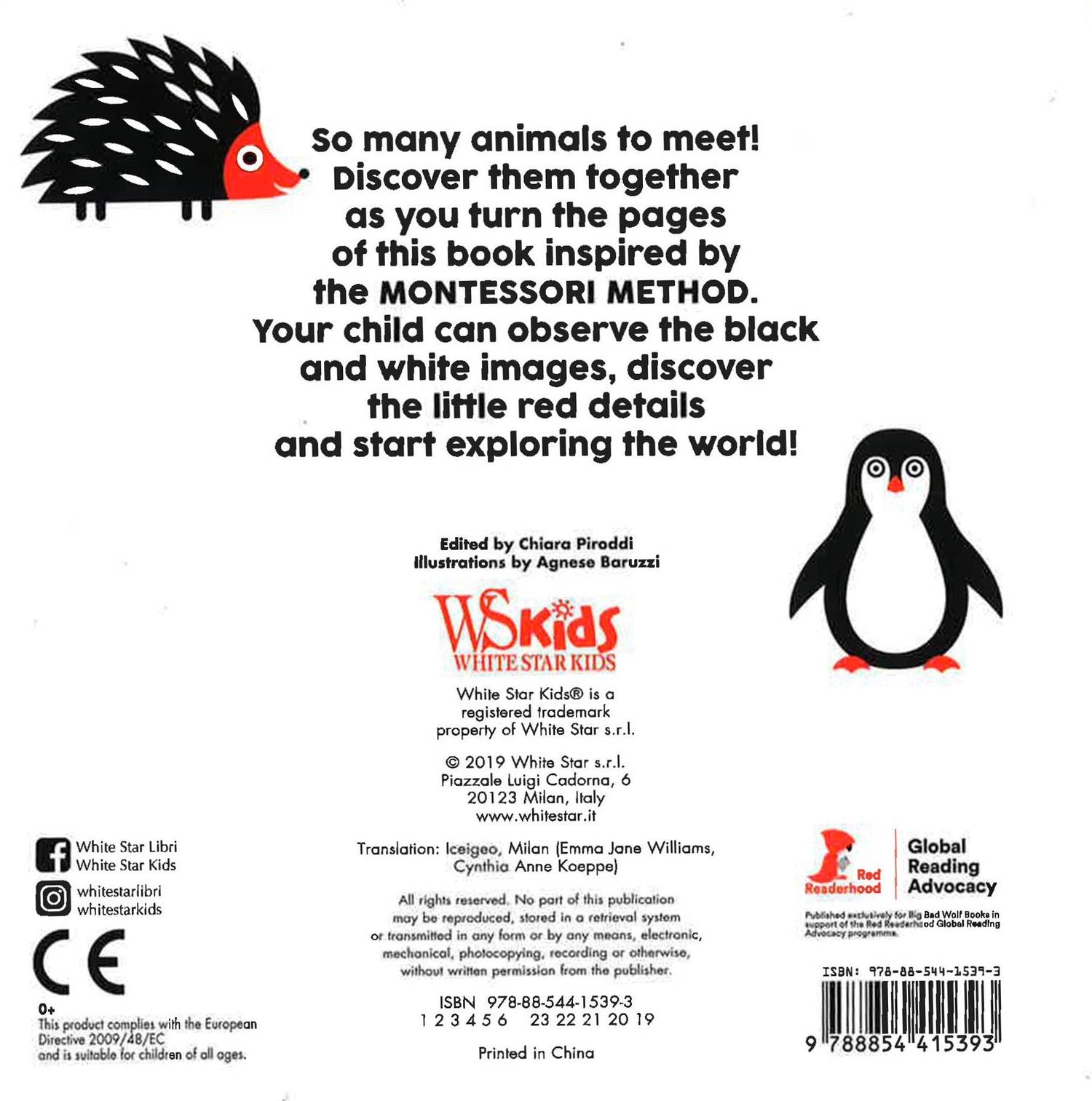 In this new collection, the Black White Red Baby Montessori board books, the scientific studies on the visual development and the Montessori theory on the visual skills of new-borns are combined to stimulate the attitude of babies in recognizing shapes and figures with net borders. The four board books propose progressive visual complexity, starting from black and white contrast and moving on with a third vibrant colour: red. Red is recognized by the baby from the third month of life forward. The variety of subjects (animals, vegetables, fruits, path to follow with the fingers) keep the interest of the baby during the first year of life