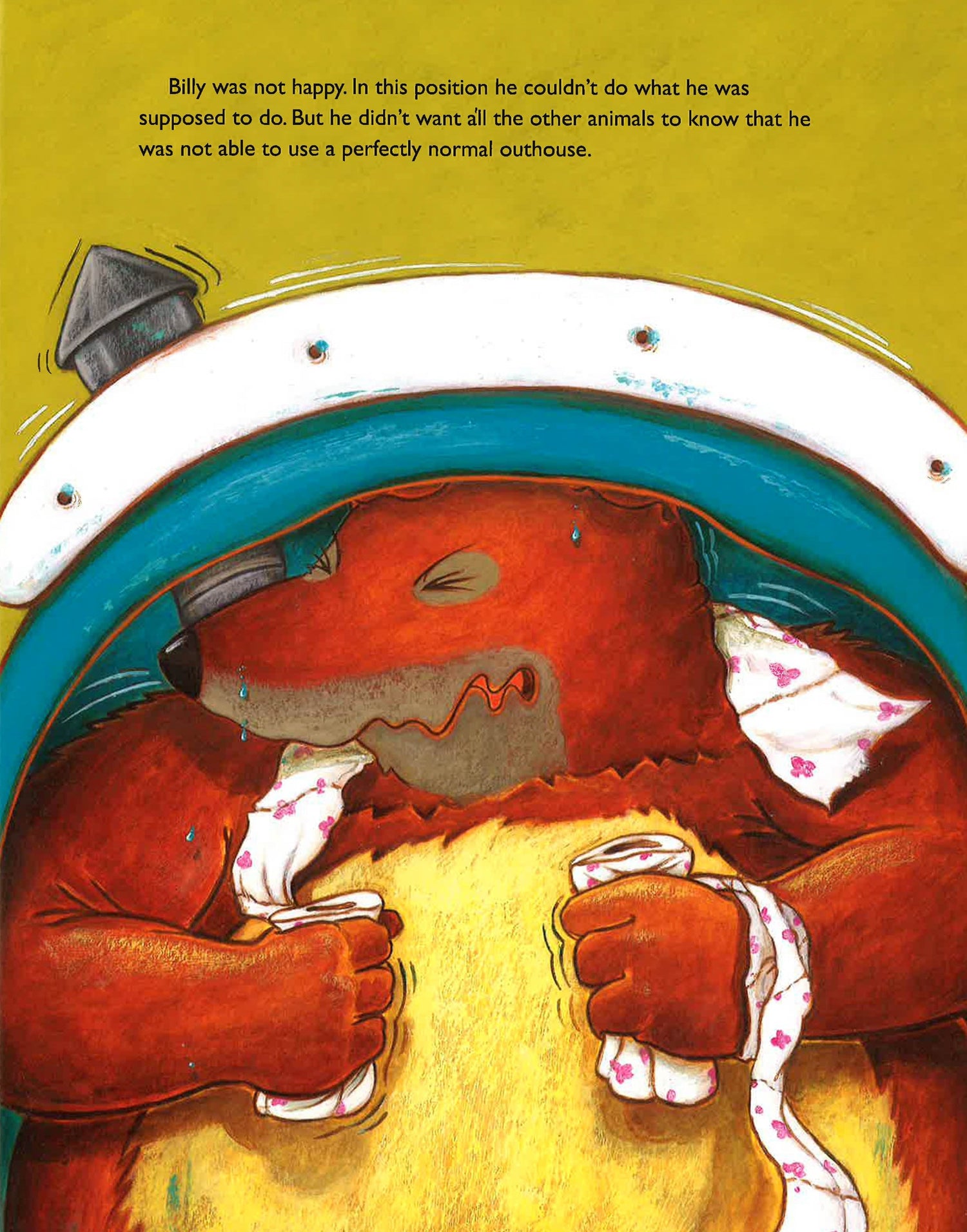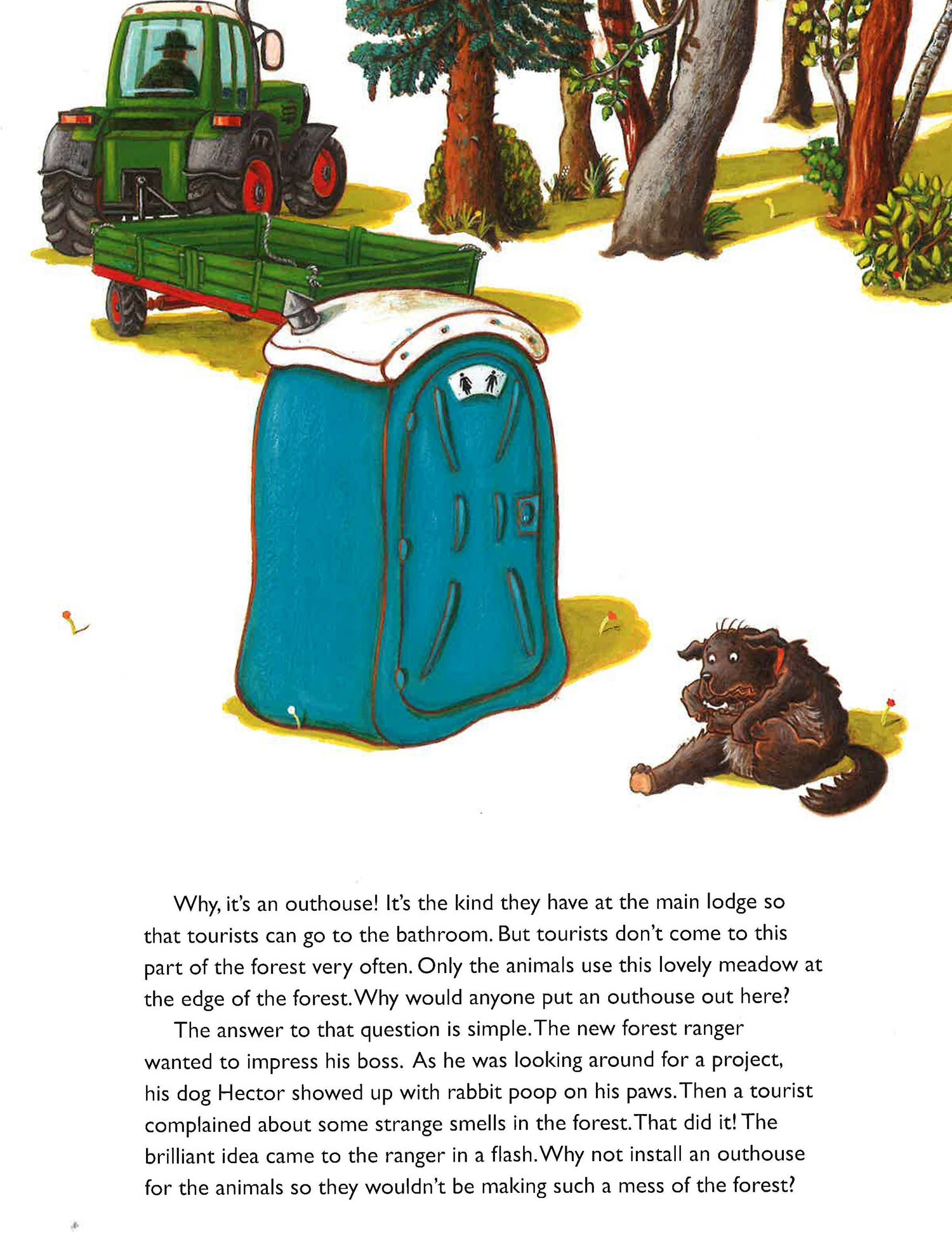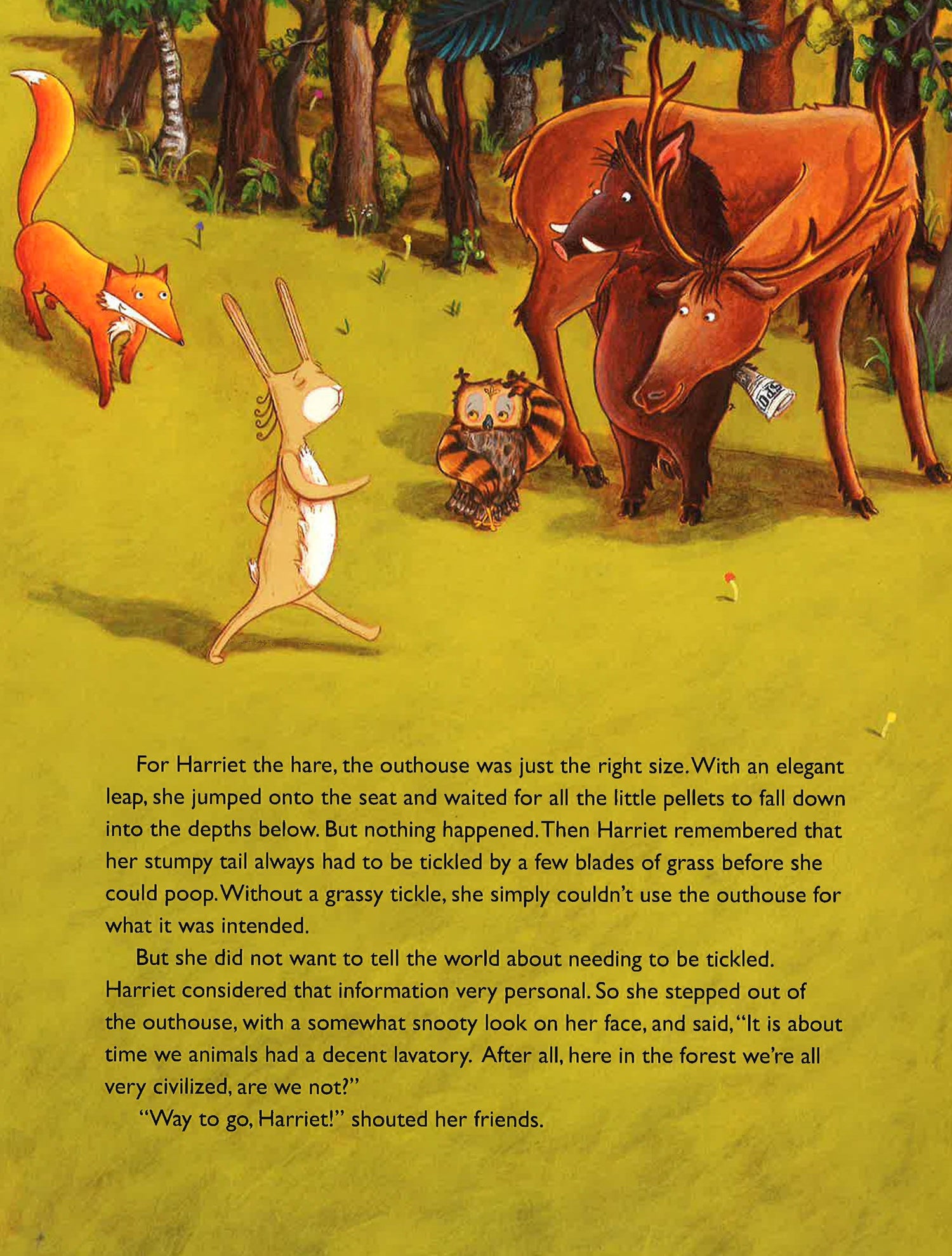 One morning all of the animals in the forest awake to discover an intruder in their midst! It's a bright blue outhouse, installed by the park ranger who is tired of the forest smelling nasty and his dog walking in stinky animal poop! From now on, the animals must do their business in the outhouse. Dr. Grunter the boar, Billy the bear, Harriet the hare, Prickly the hedgehog, Fancy the fox, Antony the stag, and Olive the owl all do their very best to use this strange and unnatural device. But was the outhouse really such a good idea? Mishap ensues as each animal tries to impress the others by pooping in the plastic, portable potty. Animals in the Outhouse shows children it is never worth doing something you are uncomfortable with just for the sake of fitting in. Children will love this silly story that is also a lesson about conformity.