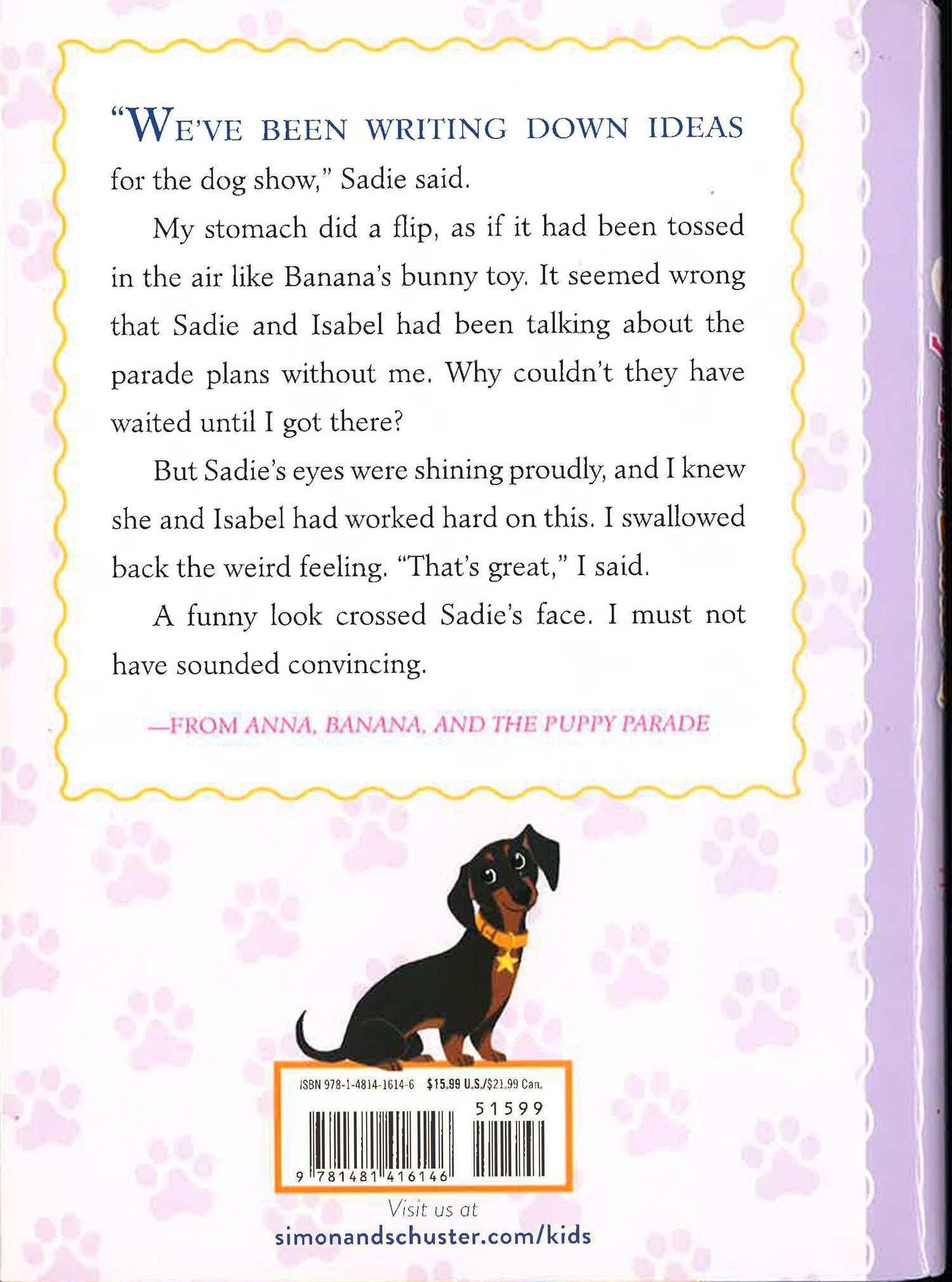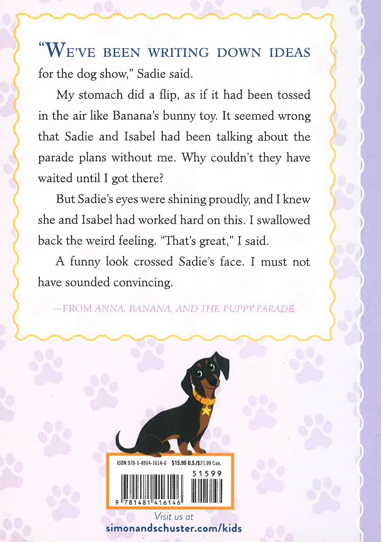 Anna enters her beloved dog Banana in a contest in the fourth book of a charming illustrated chapter book series about the joys and challenges of elementary school friendships. Anna can't wait for the Puppy Parade. She's certain Banana will win. Soon Banana will be famous--and that means Anna will be famous, too! But when Sadie and Isabel suggest they all enter the parade together, Anna starts feeling a little unsure about sharing her dog--and the spotlight--with her friends. How can Anna be Best in Show and a good best friend? *this book may have remainder mark*