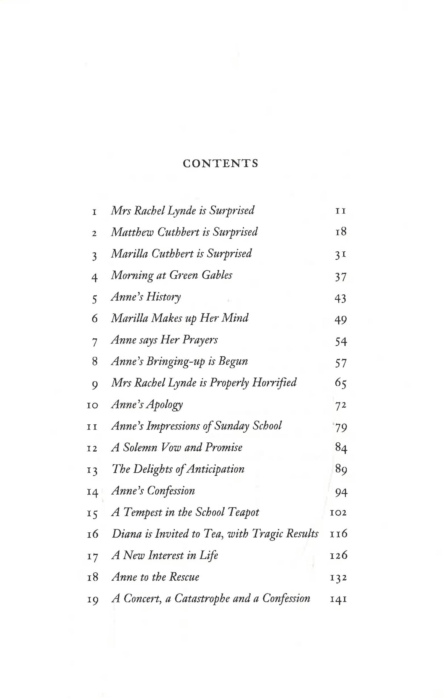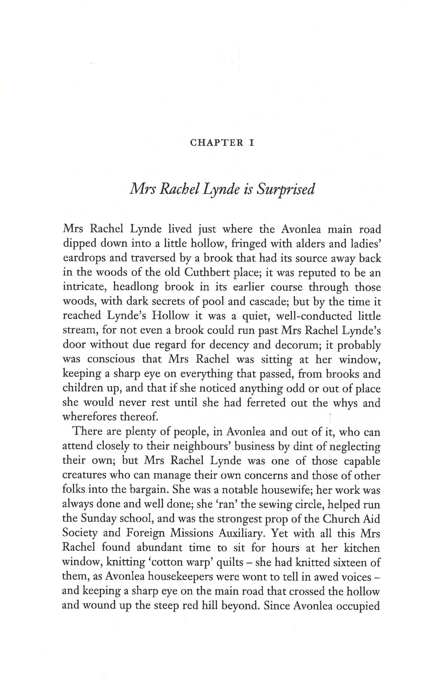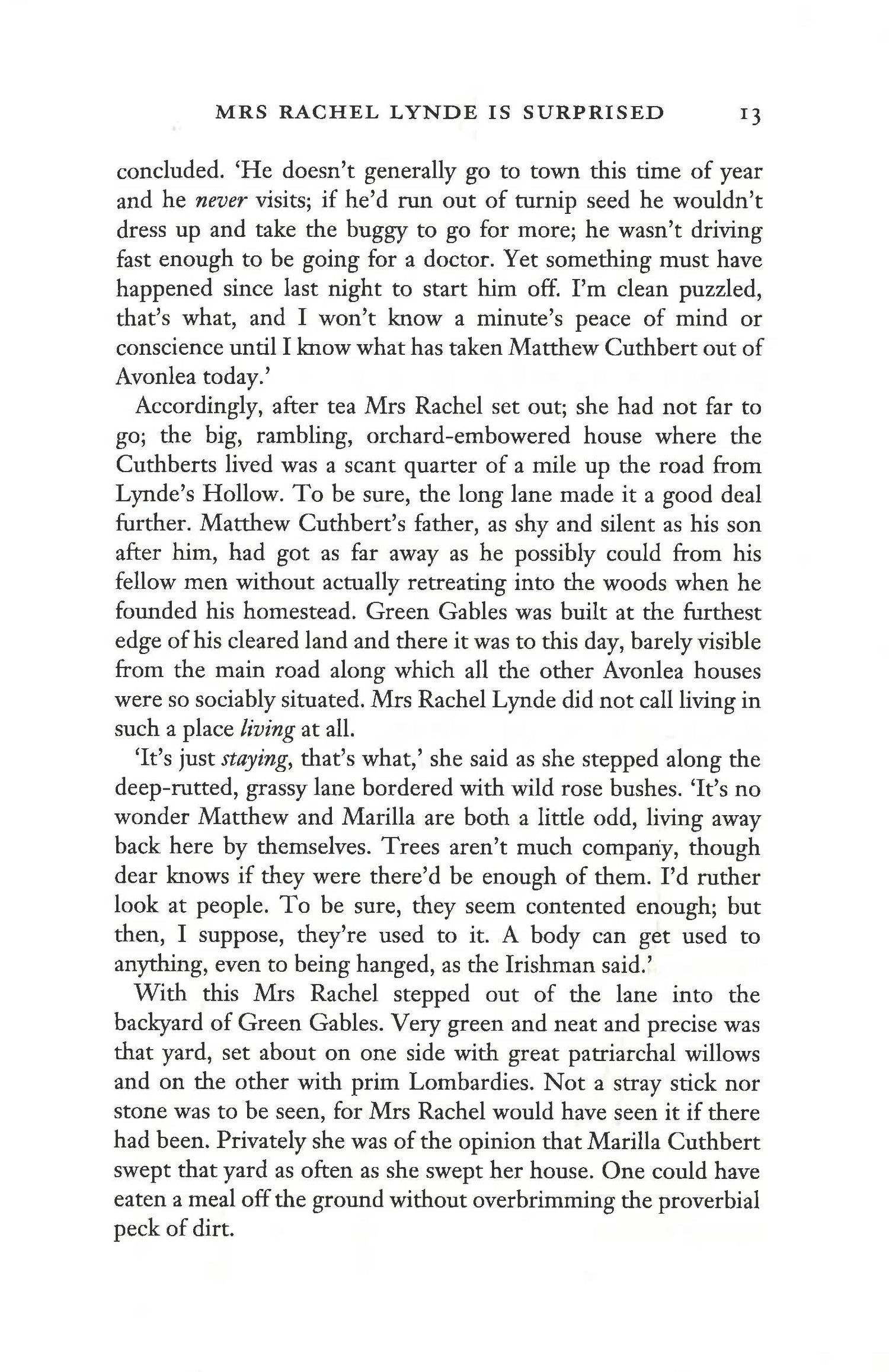 Anne Shirley is an eleven-year-old orphan who has hung on determinedly to an optimistic spirit and a wildly creative imagination through her early deprivations. She erupts into the lives of aging brother and sister Matthew and Marilla Cuthbert, a girl instead of the boy they had sent for. Thus begins a story of transformation for all three; indeed the whole rural community of Avonlea comes under Anne's influence in some way. We see her grow from a girl to a young woman of sixteen, making her mistakes, and not always learning from them. Intelligent, hot-headed as her own red hair, unwilling to take a moral truth as read until she works it out for herself, she must also face grief and loss and learn the true meaning of love. Part Tom Sawyer, part Jane Eyre, by the end of Anne of Green Gables, Anne has become the heroine of her own story.