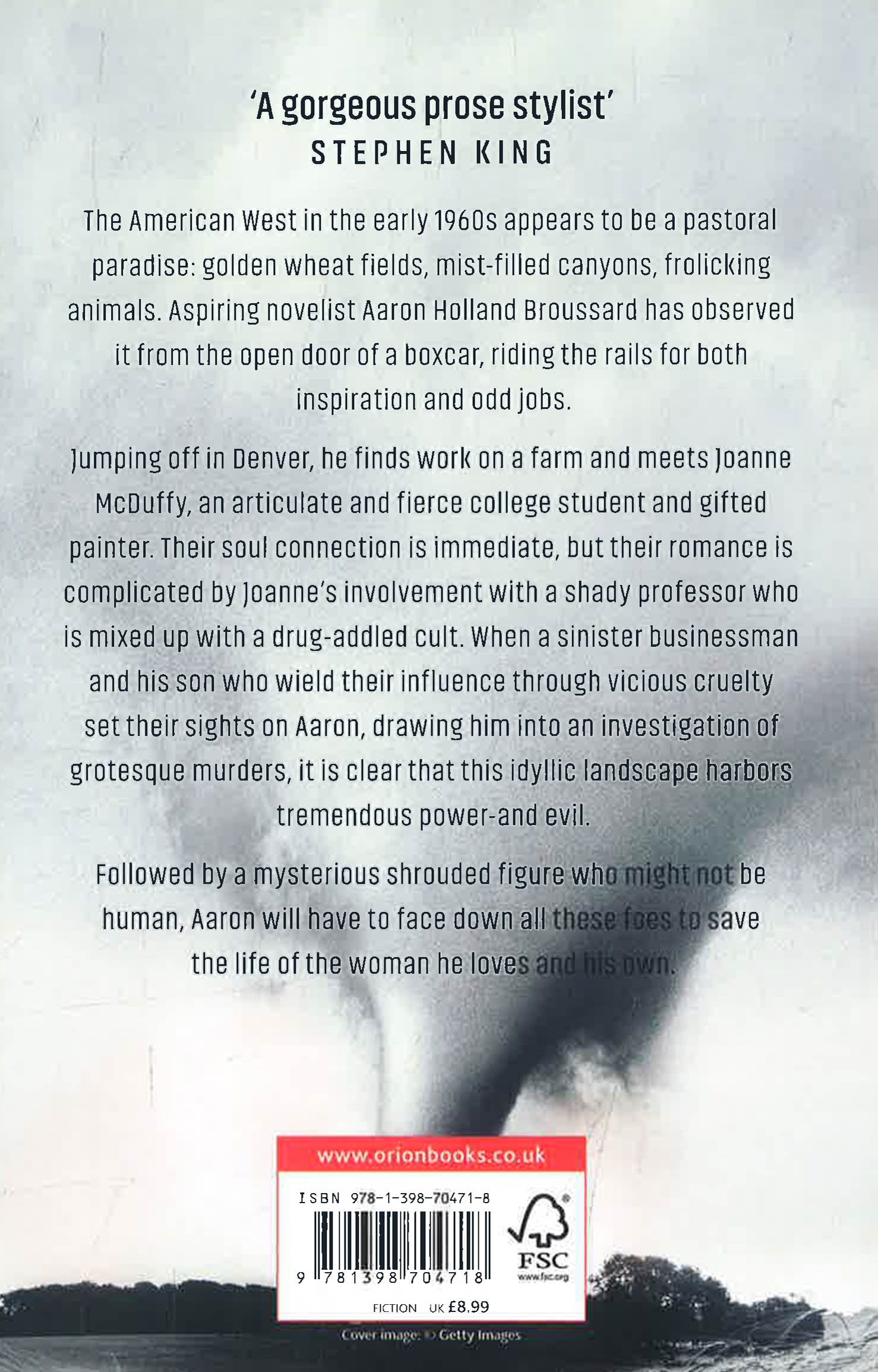 Jumping off in Denver, he finds work on a farm and meets Joanne McDuffy, an articulate and fierce college student and gifted painter. Their soul connection is immediate, but their romance is complicated by Joanne's involvement with a shady professor who is mixed up with a drug-addled cult. When a sinister businessman and his son who wield their influence through vicious cruelty set their sights on Aaron, drawing him into an investigation of grotesque murders, it is clear that this idyllic landscape harbors tremendous power-and evil. Followed by a mysterious shrouded figure who might not be human, Aaron will have to face down all these foes to save the life of the woman he loves and his own.