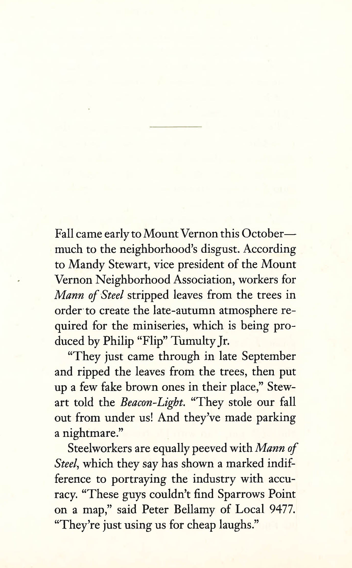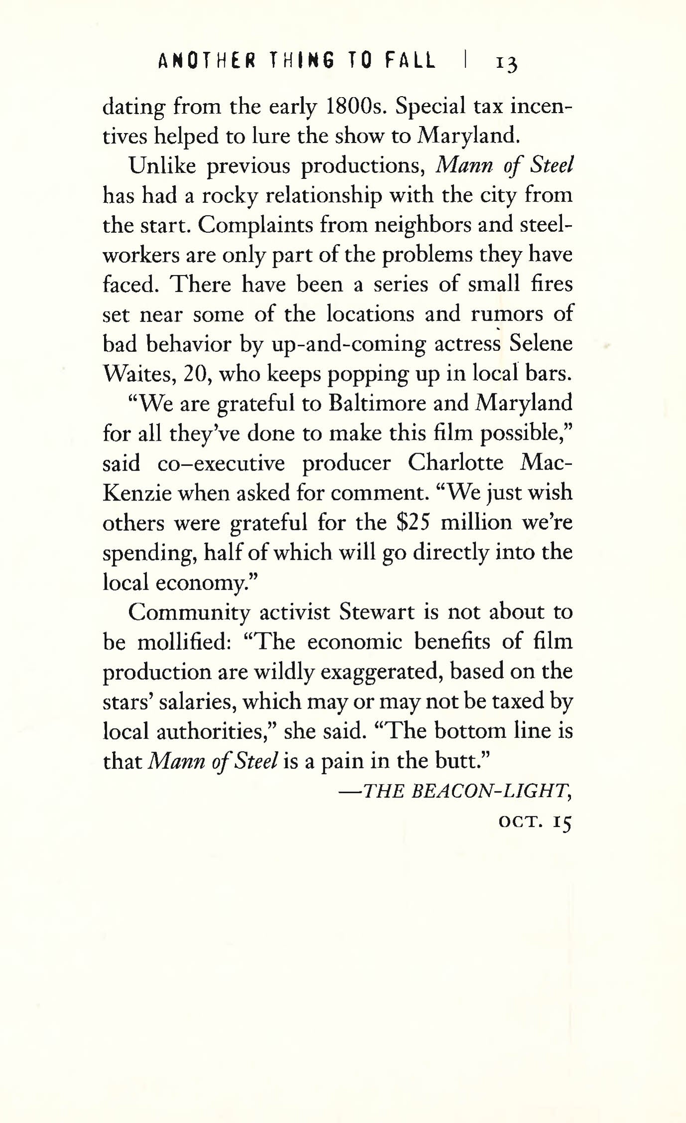 When Tess Monaghan literally runs into the crew of the fledgling TV series Mann of Steel while sculling, she never expects to be hired on to serve as bodyguard/babysitter to the young female lead, Selene Waites. But the company has been plagued by a series of disturbing "mishaps" lately. And the discovery of a corpse surrounded by photos of the beautiful, difficult superstar-in-the-making is causing Mann's creator and Hollywood legend, Flip Tumulty, considerable distress. Keeping a spoiled movie princess under wraps may be more than Tess can handle, since Selene is less naive and far more devious than she initially appears to be. But murder is an occurrence the fish-out-of-water P.I.. is all too familiar with - and a grisly on-set slaying suddenly threatens to topple the wall of secrets surrounding Mann of Steel, leaving lives, dreams, and careers scattered among the ruins.