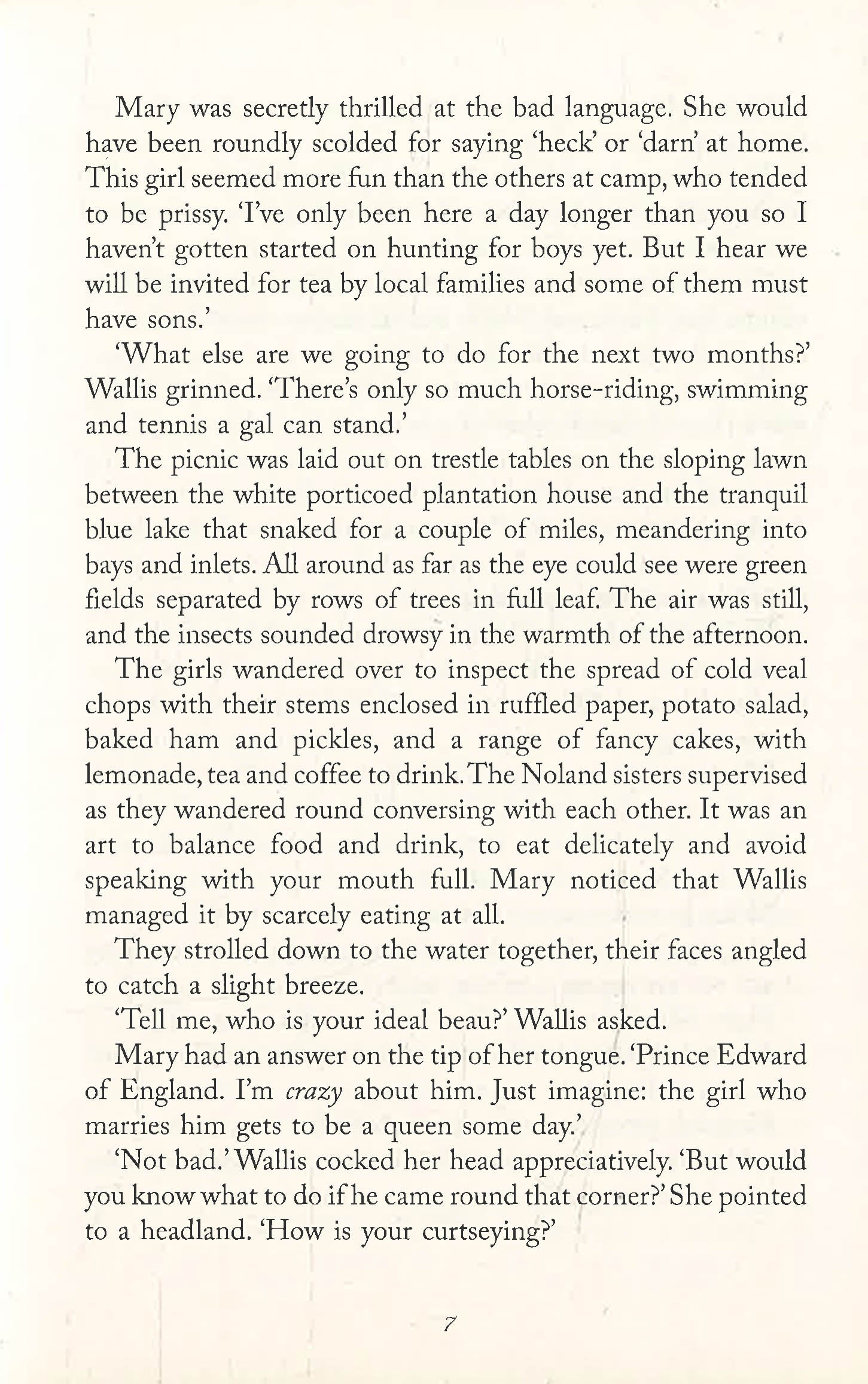 At the age of fifteen, carefree Mary Kirk and indomitable Wallis Warfield meet at summer camp. Their friendship will survive heartbreaks, separation and the demands of the British Crown until it is shattered by one unforgivable betrayal...